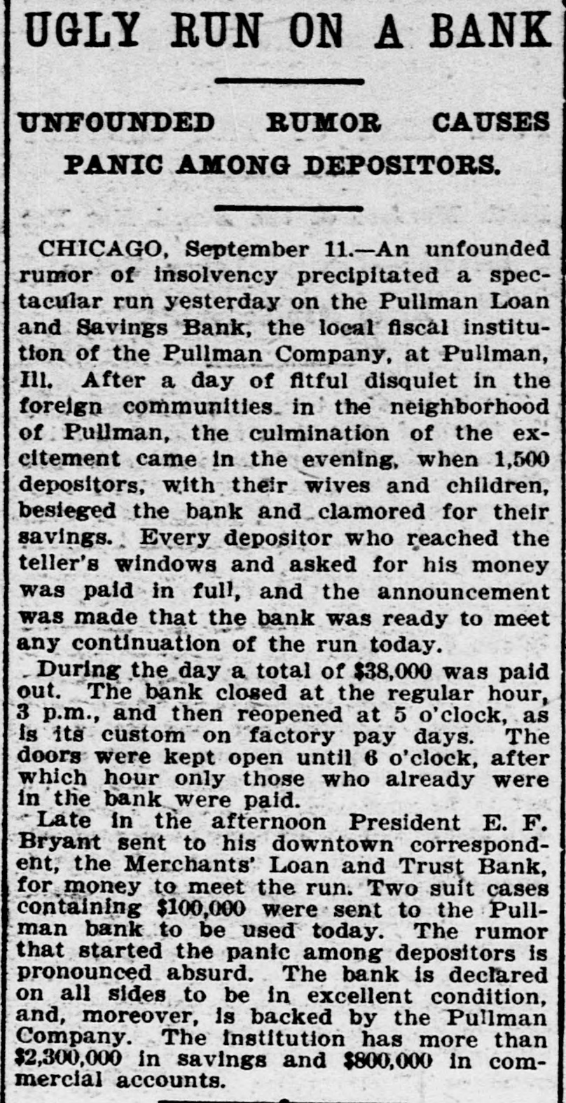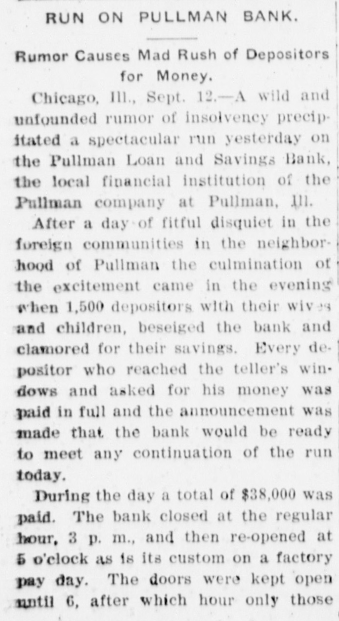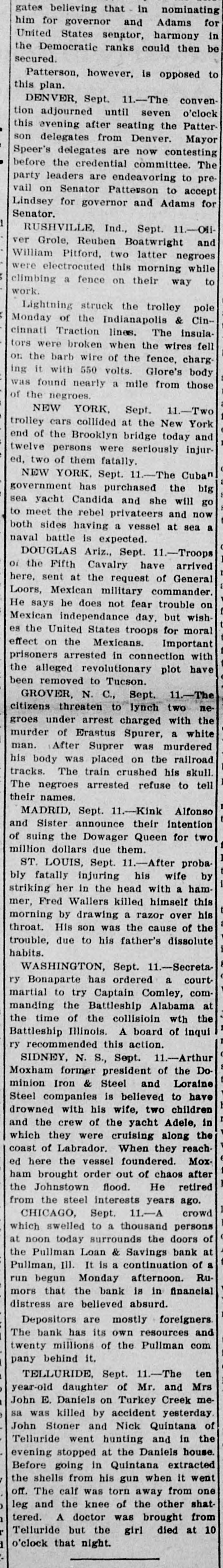 gates believing that in nominating for him for governor and Adams in United States senator, harmony be the Democratic ranks could then this plan. secured. Patterson, however, is opposed to DENVER, Sept. 11.-The conven- o'clock adjourned until seven this tion evening after seating the Patter- Mayor son delegates from Denver. Speer's delegates are now contesting The before the credential committee. preparty leaders are endeavoring to vail on Senator Patterson to accept for Lindsey for governor and Adams , Senator. RUSHVILLE, Ind., Sept. 11.-011- and Grole, Reuben Boatwright William ver Pitford, two latter negroes while were electrocuted this morning to climbing a fence on their way work. Lightning struck the trolley Cin- pole Monday of the Indianapolis & cinnati Traction lines. The insula- fell tors were broken when the wires the barb wire of the fence, charg- body or. ing it with 550 volts. Glore's was found nearly a mile from those of the negroes. NEW YORK, Sept. 11.-Two trolley cars collided at the New York and end of the Brooklyn bridge today twelve persons were seriously injured, two of them fatally. NEW YORK, Sept. 11.-The Cuban big government has purchased the will go sea yacht Candida and she now to meet the rebel privateers and a both sides having a vessel at sea naval battle is expected. DOUGLAS Ariz., Sept. 11.-Troops the Fifth Cavalry have General arrived oi here. sent at the request of Loors, Mexican military commander. on says he does not fear trouble wishMexican He independance day. but moral the United States troops Important for effect es on the Mexicans. prisoners arrested in connection have with the alleged revolutionary plot been removed to Tucson. GROVER, N. C., Sept. 11.-The ne citizens threaten to lynch two the under arrest charged with white murder groes of Erastus Spurer, a After Suprer was murdered railroad his man. body was placed on the skull. tracks. The train crushed his tell The negroes arrested refuse to their names. MADRID, Sept. 11.-Kink Alfonso Sister announce their intention two of and suing the Dowager Queen for million dollars due them. ST. LOUIS, Sept. 11.-After wife proba- by fatally injuring his striking bly her in the head with a ham- this Fred Wallers killed himself his mer, by drawing a razor over of the morning His son was the cause throat. trouble, due to his father's dissolute habits. WASHINGTON, Sept. 11.-Secreta- courtBonaparte has ordered a commartial ry to try Captain Comley, at manding the Battleship Alabama the time of the collisioin wth inqui Battleship the Illinois. A board of recommended this action. ry SIDNEY, N. S., Sept. 11.-Arthur the Do Moxham former president of Loraine Iron & Steel and have minion Steel companies is believed children to with his wife, two in drowned the crew of the yacht Adele, the and which they were cruising along reach. of Labrador. When they Mox coast here the vessel foundered. after ed ham brought order out of chaos retired the Johnstown flood. He ago. from the steel interests years crowd CHICAGO, Sept. 11.swelled to a thousand doors persons of which today surrounds the bank at at noon Pullman Loan & Savings of a the Pullman, Ill. It is a continuation Rubegun Monday afternoon. financial run that the bank is in distress mors are believed absurd. Depositors are mostly foreigners and bank has its own resources com The twenty millions of the Pullman pany behind it. TELLURIDE, Sept. 11.-The and Mrs ten daughter of Mr. Creek year-old E. Daniels on Turkey yesterday meJohn killed by accident of sa was Stoner and Nick Quintana in the John Telluride went hunting and house. stopped at the Daniels extracted evening going in Quintana it went Before shells from his gun when from one the The calf was torn away shatoff. and the knee of the other from leg A doctor was brought at 10 Telluride tered. but the girl died o'clock that night.