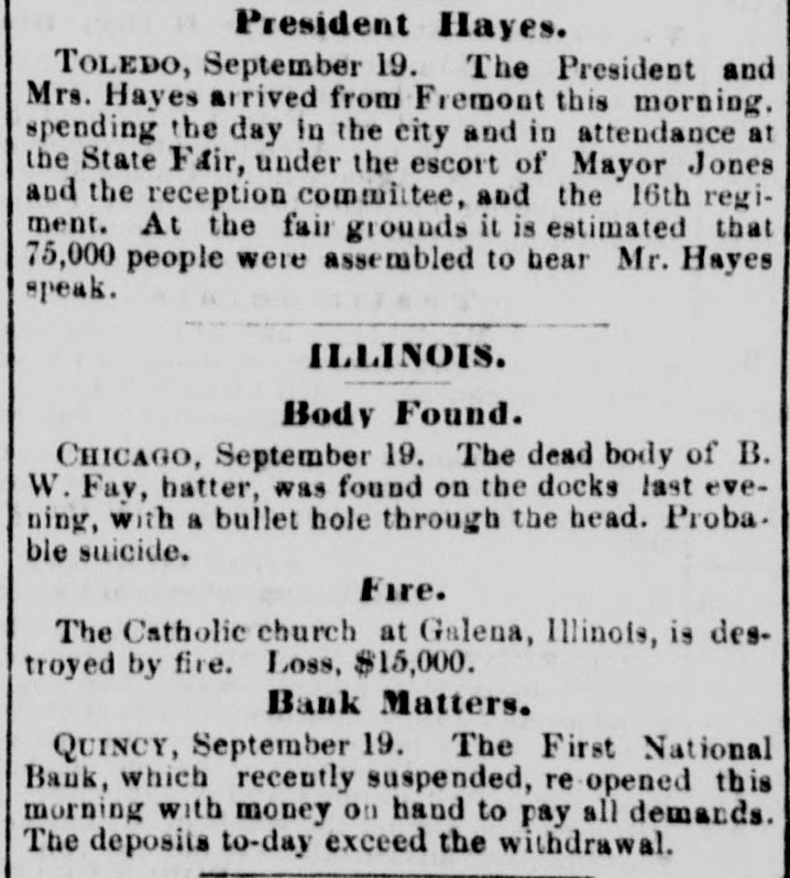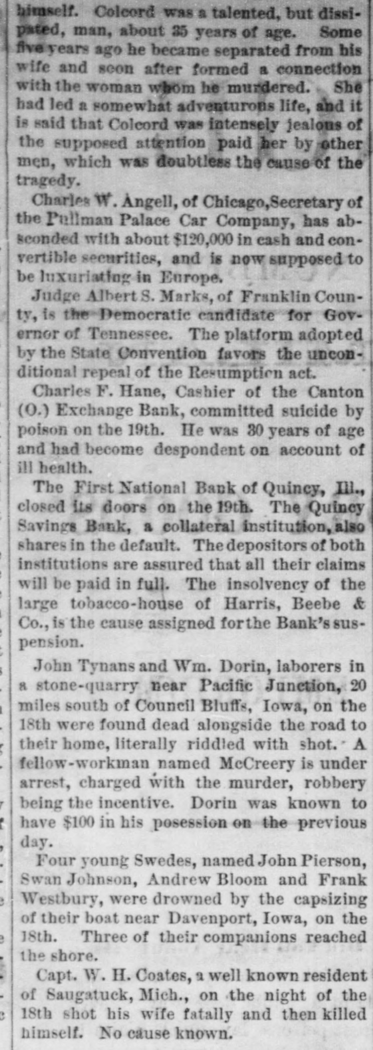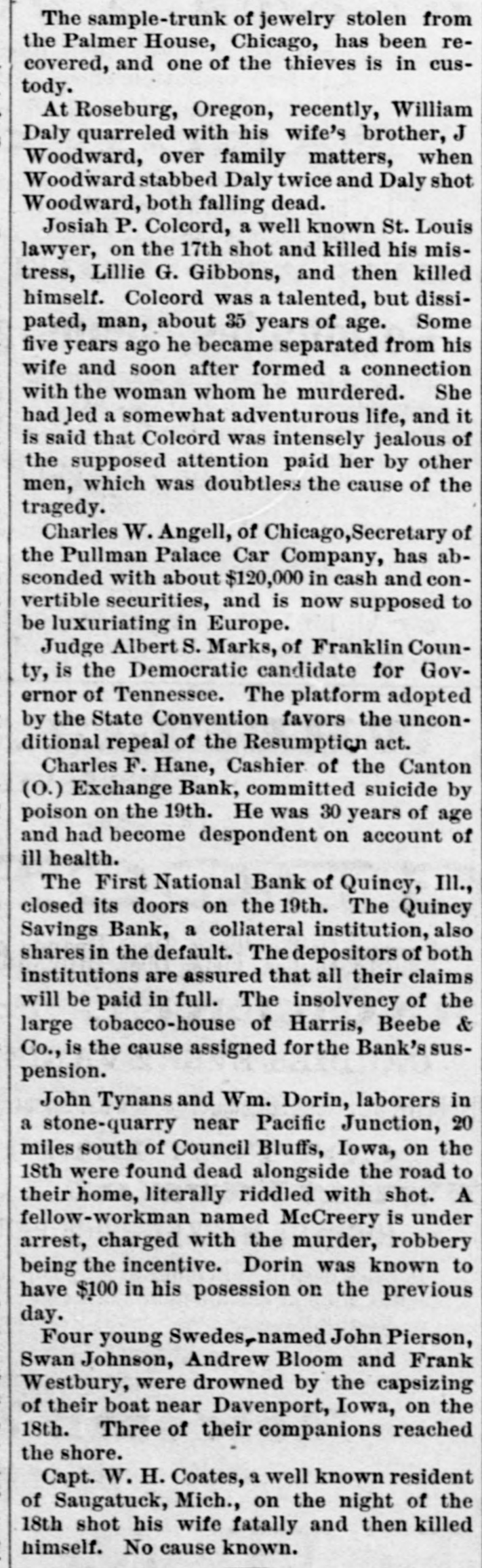 The sample-trunk of jewelry stolen from the Palmer House, Chicago, has been recovered, and one of the thieves is in custody. At Roseburg, Oregon, recently, William Daly quarreled with his wife's brother, J Woodward, over family matters, when Woodward stabbed Daly twice and Daly shot Woodward, both falling dead. Josiah P. Colcord, a well known St. Louis lawyer, on the 17th shot and killed his mistress, Lillie G. Gibbons, and then killed himself. Colcord was a talented, but dissipated, man, about 35 years of age. Some five years ago he became separated from his wife and soon after formed a connection with the woman whom he murdered. She had led a somewhat adventurous life, and it is said that Colcord was intensely jealous of the supposed attention paid her by other men, which was doubtless the cause of the tragedy. Charles W. Angell, of Chicago, Secretary of the Pullman Palace Car Company, has abseconded with about $120,000 in cash and convertible securities, and is now supposed to be luxuriating in Europe. Judge Albert S. Marks, of Franklin County, is the Democratic candidate for Governor of Tennessee. The platform adopted by the State Convention favors the unconditional repeal of the Resumption act. Charles F. Hane, Cashier of the Canton (0.) Exchange Bank, committed suicide by poison on the 19th. He was 30 years of age and had become despondent on account of ill health. The First National Bank of Quincy, Ill., closed its doors on the 19th. The Quiney Savings Bank, a collateral institution, also shares in the default. The depositors of both institutions are assured that all their claims will be paid in full. The insolvency of the large tobacco-house of Harris, Beebe & Co., is the cause assigned forthe Bank's suspension. John Tynans and Wm. Dorin, laborers in a stone-quarry near Pacific Junction, 20 miles south of Council Bluffs, Iowa, on the 18th were found dead alongside the road to their home, literally riddled with shot. A fellow-workman named McCreery is under arrest, charged with the murder, robbery being the incentive. Dorin was known to have $100 in his posession on the previous day. Four young Swedes, named John Pierson, Swan Johnson, Andrew Bloom and Frank Westbury, were drowned by the capsizing of their boat near Davenport, Iowa, on the 18th. Three of their companions reached the shore. Capt. W. H. Coates, a well known resident of Saugatuck, Mich., on the night of the 18th shot his wife fatally and then killed himself. No cause known.