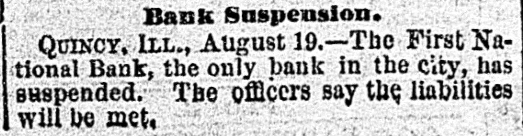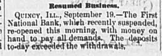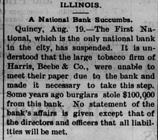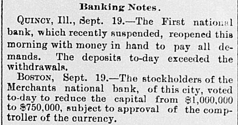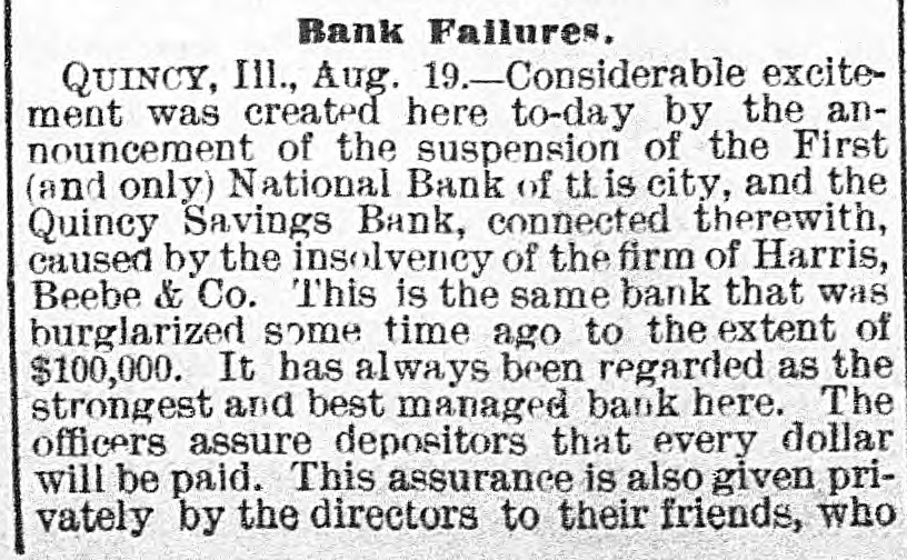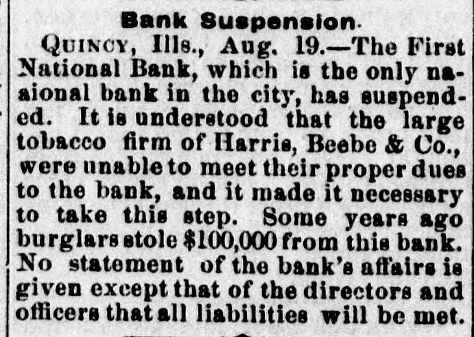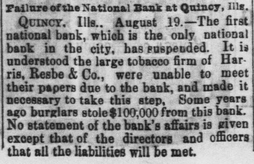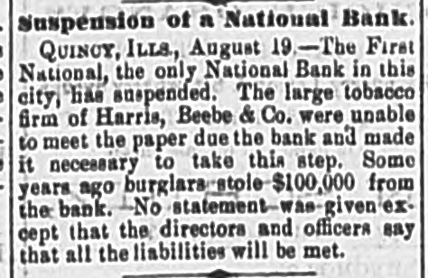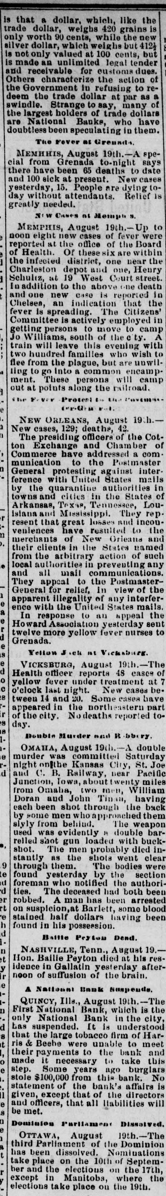 The sample-trunk of jewelry stolen from the Palmer House, Chicago, has been recovered, and one of the thieves is in custody. At Roseburg, Oregon, recently, William Daly quarreled with his wife's brother, J Woodward, over family matters, when Woodward stabbed Daly twice and Daly shot Woodward, both falling dead. Josiah P. Colcord, a well known St. Louis lawyer, on the 17th shot and killed his mistress, Lillie G. Gibbons, and then killed himself. Colcord was a talented, but dissipated, man, about 35 years of age. Some five years ago he became separated from his wife and soon after formed a connection with the woman whom he murdered. She had led a somewhat adventurous life, and it is said that Colcord was intensely jealous of the supposed attention paid her by other men, which was doubtless the cause of the tragedy. Charles W. Angell, of Chicago, Secretary of the Pullman Palace Car Company, has abseconded with about $120,000 in cash and convertible securities, and is now supposed to be luxuriating in Europe. Judge Albert S. Marks, of Franklin County, is the Democratic candidate for Governor of Tennessee. The platform adopted by the State Convention favors the unconditional repeal of the Resumption act. Charles F. Hane, Cashier of the Canton (0.) Exchange Bank, committed suicide by poison on the 19th. He was 30 years of age and had become despondent on account of ill health. The First National Bank of Quincy, Ill., closed its doors on the 19th. The Quiney Savings Bank, a collateral institution, also shares in the default. The depositors of both institutions are assured that all their claims will be paid in full. The insolvency of the large tobacco-house of Harris, Beebe & Co., is the cause assigned forthe Bank's suspension. John Tynans and Wm. Dorin, laborers in a stone-quarry near Pacific Junction, 20 miles south of Council Bluffs, Iowa, on the 18th were found dead alongside the road to their home, literally riddled with shot. A fellow-workman named McCreery is under arrest, charged with the murder, robbery being the incentive. Dorin was known to have $100 in his posession on the previous day. Four young Swedes, named John Pierson, Swan Johnson, Andrew Bloom and Frank Westbury, were drowned by the capsizing of their boat near Davenport, Iowa, on the 18th. Three of their companions reached the shore. Capt. W. H. Coates, a well known resident of Saugatuck, Mich., on the night of the 18th shot his wife fatally and then killed himself. No cause known.