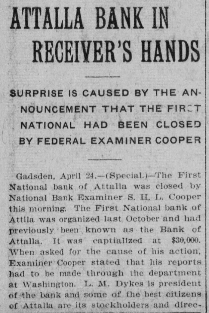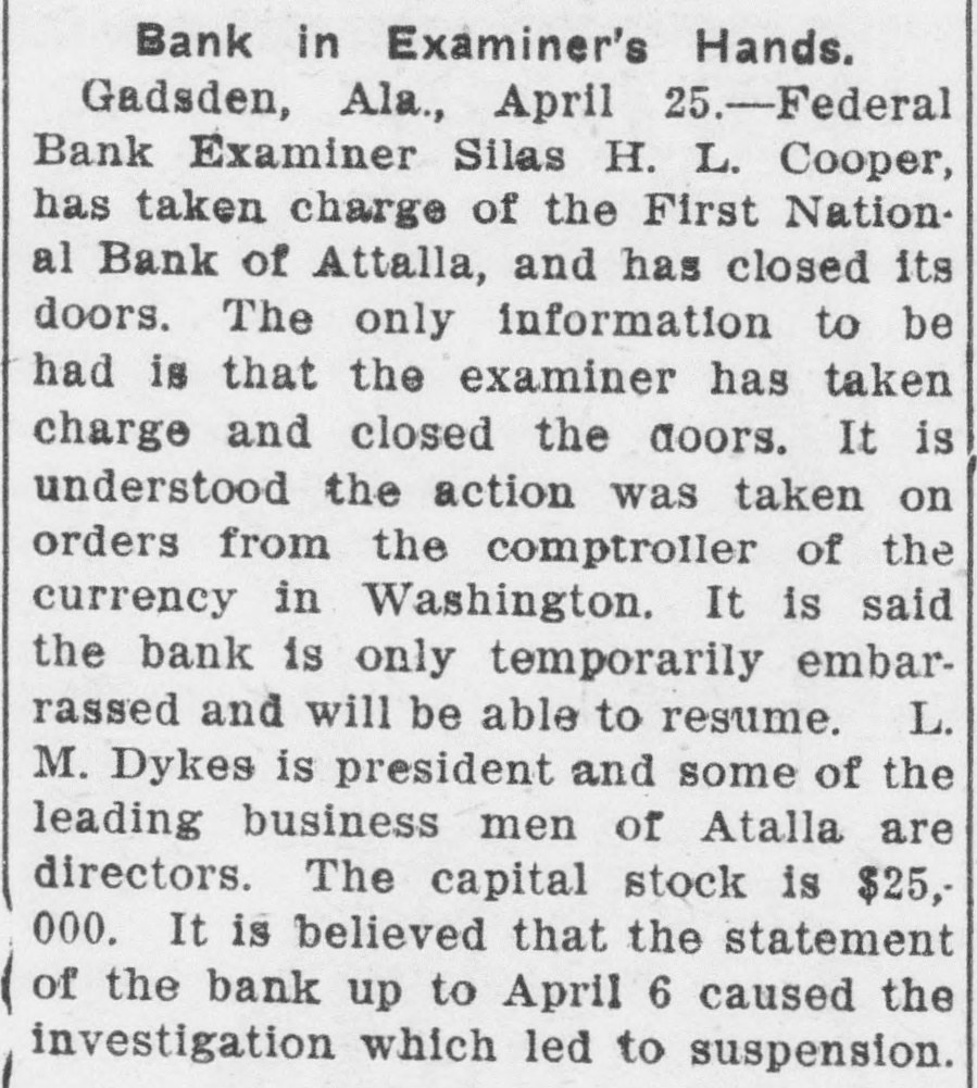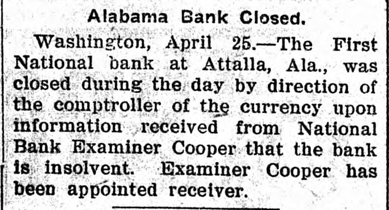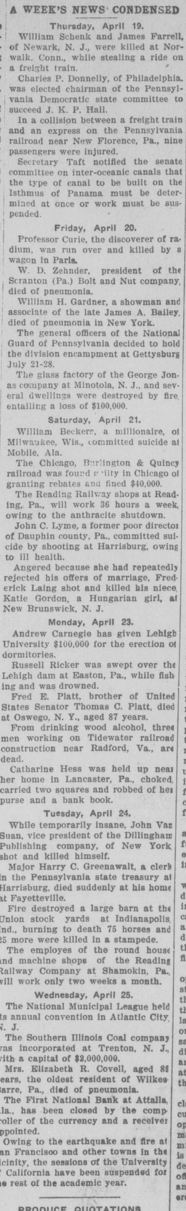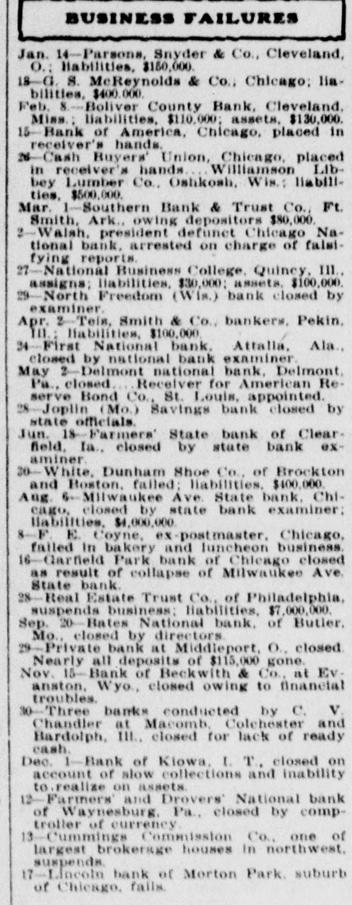 BUSINESS FAILURES Jan. 14-Parsons, Snyder & Co., Cleveland, O.; liabilities, $150,000. 18-G. S. McReynolds & Co., Chicago; liabilities, $400.000. Feb. 8.-Boliver County Bank, Cleveland, Miss.; liabilities, $110,000; assets, $130,000. 15-Bank of America, Chicago, placed in receiver's hands. 26-Cash Buyers' Union, Chicago, placed in receiver's hands Williamson Libbey Lumber Co., Oshkosh, Wis.; liabilities, $500,000. Mar. 1-Southern Bank & Trust Co., Ft. Smith, Ark., owing depositors $80,000. 2-Walsh, president defunct Chicago National bank, arrested on charge of falsifying reports. 27-National Business College, Quincy, III., assigns; liabilities, $30,000; assets, $100,000. 29-North Freedom (Wis.) bank closed by examiner. Apr. 2-Teis, Smith & Co., bankers, Pekin, Ill.; liabilities, $100,000. 24-First National bank, Attalla, Ala., closed by national bank examiner. May 2-Delmont national bank, Delmont, Pa., closed Receiver for American Reserve Bond Co., St. Louis, appointed. 28-Joplin (Mo.) Savings bank closed by state officials. Jun. 18-Farmers' State bank of Clearfield, Ia., closed by state bank examiner. 30-White, Dunham Shoe Co., of Brockton and Boston, failed; liabilities, $400,000. Aug. 6-Milwaukee Ave. State bank, Chicago, closed by state bank examiner; liabilities, $4,000,000. 8-F. E. Coyne, ex-postmaster, Chicago, failed in bakery and luncheon business. 16-Garfield Park bank of Chicago closed as result of collapse of Milwaukee Ave. State bank. 28-Real Estate Trust Co., of Philadelphia, suspends business; liabilities, $7,000,000. Sep. 20-Bates National bank, of Butler, Mo., closed by directors. 29-Private bank at Middleport, O., closed. Nearly all deposits of $115,000 gone. Nov. 15-Bank of Beckwith & Co., at Evanston, Wyo., closed owing to financial troubles. 30-Three banks conducted by C. V. Chandler at Macomb, Colchester and Bardolph, Ill., closed for lack of ready cash. Dec. 1-Bank of Kiowa, I. T., closed on account of slow collections and inability to realize on assets. 12-Farmers' and Drovers' National bank of Waynesburg, Pa., closed by comptroller of currency. 13-Cummings Commission Co., one of largest brokerage houses in northwest, suspends. 17-Lincoln bank of Morton Park, suburb of Chicago, fails.