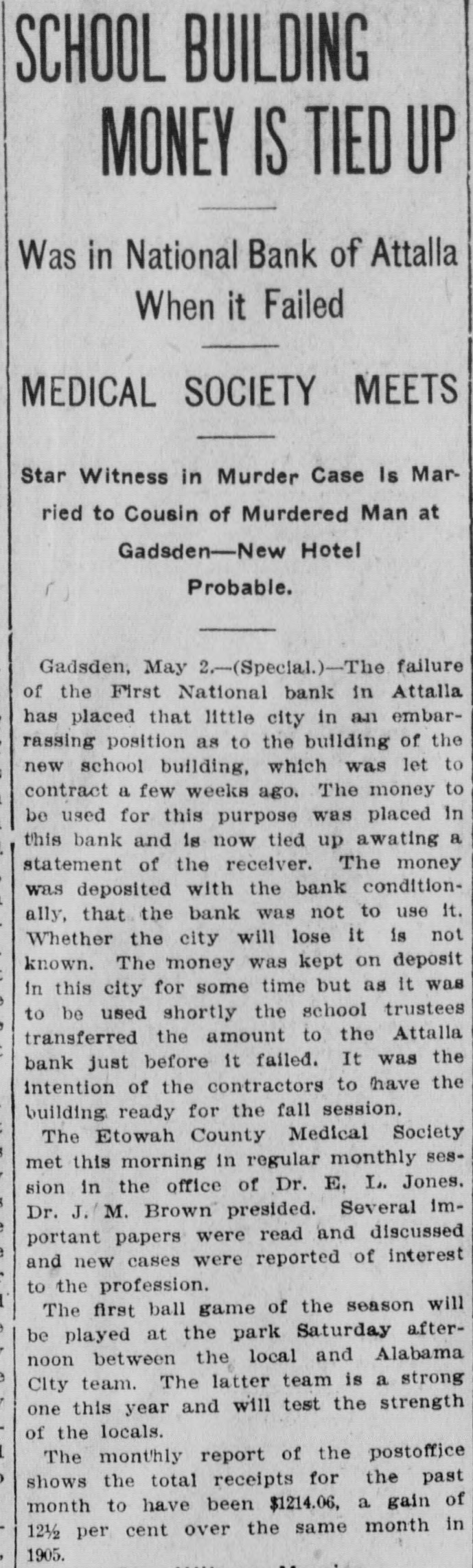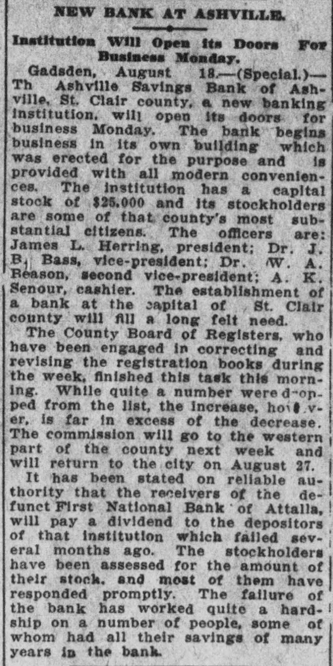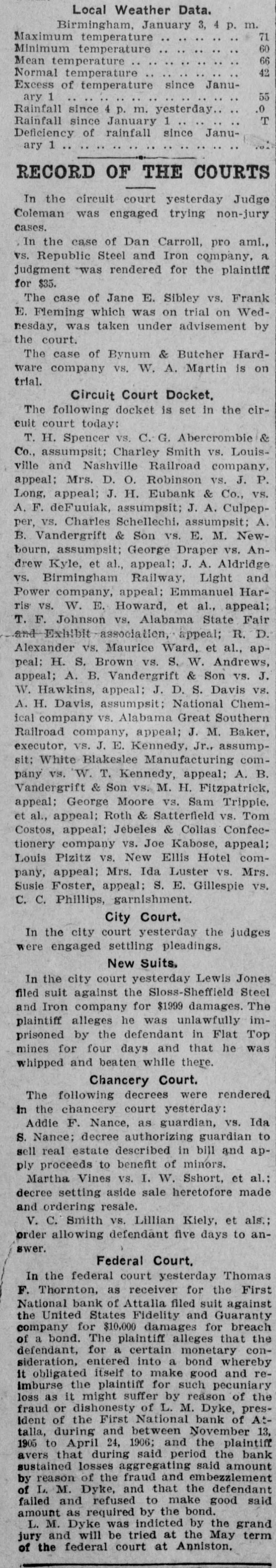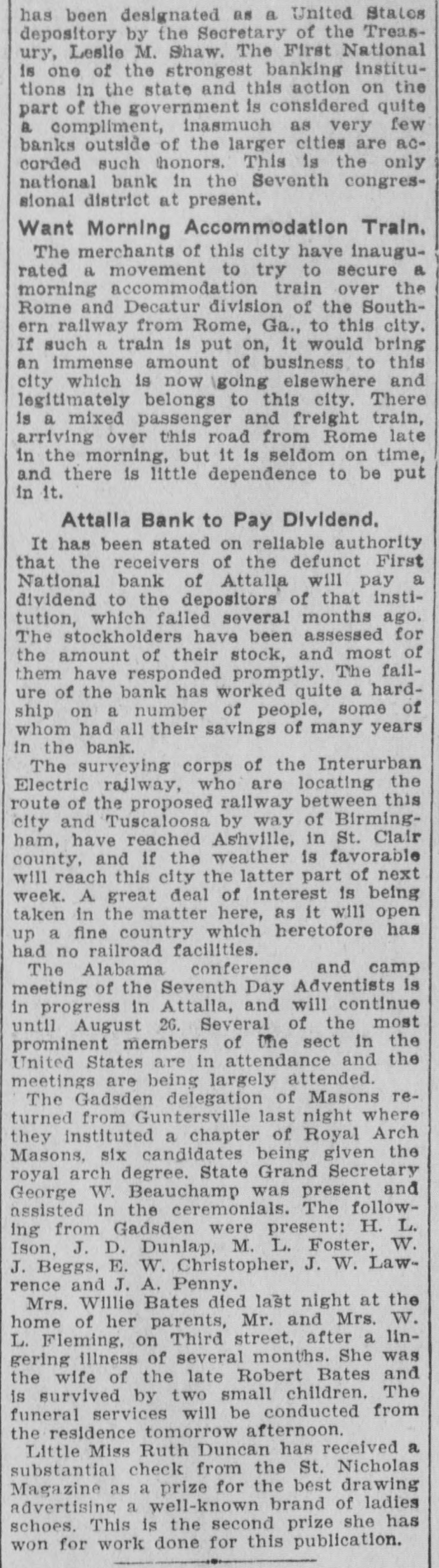 BUSINESS FAILURES Jan. 14-Parsons, Snyder & Co., Cleveland, O.; liabilities, $150,000. 18-G. S. McReynolds & Co., Chicago; liabilities, $400.000. Feb. 8.-Boliver County Bank, Cleveland, Miss.; liabilities, $110,000; assets, $130,000. 15-Bank of America, Chicago, placed in receiver's hands. 26-Cash Buyers' Union, Chicago, placed in receiver's hands Williamson Libbey Lumber Co., Oshkosh, Wis.; liabilities, $500,000. Mar. 1-Southern Bank & Trust Co., Ft. Smith, Ark., owing depositors $80,000. 2-Walsh, president defunct Chicago National bank, arrested on charge of falsifying reports. 27-National Business College, Quincy, III., assigns; liabilities, $30,000; assets, $100,000. 29-North Freedom (Wis.) bank closed by examiner. Apr. 2-Teis, Smith & Co., bankers, Pekin, Ill.; liabilities, $100,000. 24-First National bank, Attalla, Ala., closed by national bank examiner. May 2-Delmont national bank, Delmont, Pa., closed Receiver for American Reserve Bond Co., St. Louis, appointed. 28-Joplin (Mo.) Savings bank closed by state officials. Jun. 18-Farmers' State bank of Clearfield, Ia., closed by state bank examiner. 30-White, Dunham Shoe Co., of Brockton and Boston, failed; liabilities, $400,000. Aug. 6-Milwaukee Ave. State bank, Chicago, closed by state bank examiner; liabilities, $4,000,000. 8-F. E. Coyne, ex-postmaster, Chicago, failed in bakery and luncheon business. 16-Garfield Park bank of Chicago closed as result of collapse of Milwaukee Ave. State bank. 28-Real Estate Trust Co., of Philadelphia, suspends business; liabilities, $7,000,000. Sep. 20-Bates National bank, of Butler, Mo., closed by directors. 29-Private bank at Middleport, O., closed. Nearly all deposits of $115,000 gone. Nov. 15-Bank of Beckwith & Co., at Evanston, Wyo., closed owing to financial troubles. 30-Three banks conducted by C. V. Chandler at Macomb, Colchester and Bardolph, Ill., closed for lack of ready cash. Dec. 1-Bank of Kiowa, I. T., closed on account of slow collections and inability to realize on assets. 12-Farmers' and Drovers' National bank of Waynesburg, Pa., closed by comptroller of currency. 13-Cummings Commission Co., one of largest brokerage houses in northwest, suspends. 17-Lincoln bank of Morton Park, suburb of Chicago, fails.