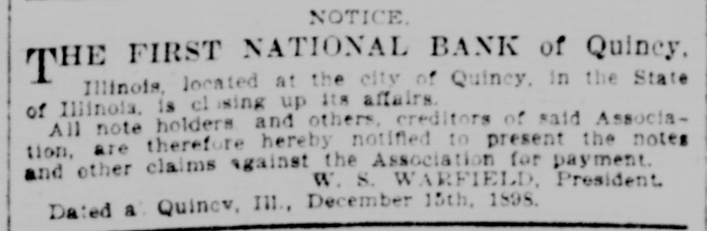 NOTICE. THE FIRST NATIONAL BANK of Quincy, Illinois, located at the city of Quincy. in the State of Illinoia. is closing up its affairs. All note holders and others, creditors of said Association, are therefore hereby notified to present the notes and other claims against the Association for payment. W. S. WARFIELD President. Dated a Quincv. III., December 15th, 1898.