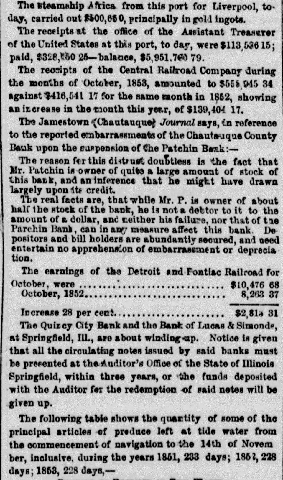 The steamship Africa from this port for Liverpool, today, carried out $500,650, principally in gold ingots. The receipts at the office of the Assistant Treasurer of the United States at this port, to day, were $113,536 1 paid, $328,530 25-balance, $5,951,700 79. The receipts of the Central Railroad Company during the months of October, 1853, amounted to $558,945 34 against $416,541 17 for the same month in 1852, showing an increase in the month this year, of $139,404 17. The Jamestown (Chautauque) Journal says, in reference to the reported embarrassments of the Chautauque County Bank upon the suspension of the Patchin Bank:The reason for this distrust doubtless is the fact that Mr. Patchin is owner of quite a large amount of stock of this back, and an inference that he might have drawn largely upon its credit. The real facts are, that while Mr. P. is owner of about half the stock of the bank, he is not a dettor to it to the amount of a dollar, and neither his failure, nor that of the Parchin Bank, can in any measure affect this bank. De. positors and bill holders are abundantly secured, and need entertain no apprehension of embarrassment or deprecia tion. The earnings of the Detroit and Fontiac Railroad for October, were $10,476 68 October, 1852 8,263 37 Increase 28 per cent $2,81 31 The Quincy City Bank and the Bank of Lucas & Simonde, at Springfield, III., are about winding-ap. Notice is given that all the circulating notes issued by said banks must be presented at the Auditor's Office of the State of Illinois Springfield, within three years, or the funds deposited with the Auditor for the redemption of said notes will be given up. The following table shows the quantity of some of the principal articles of produce left at tide water from the commencement of navigation to the 14th of Novem ber, inclusive, during the years 1851, 233 days; 1852, 228 days; 1853, 228 days,-