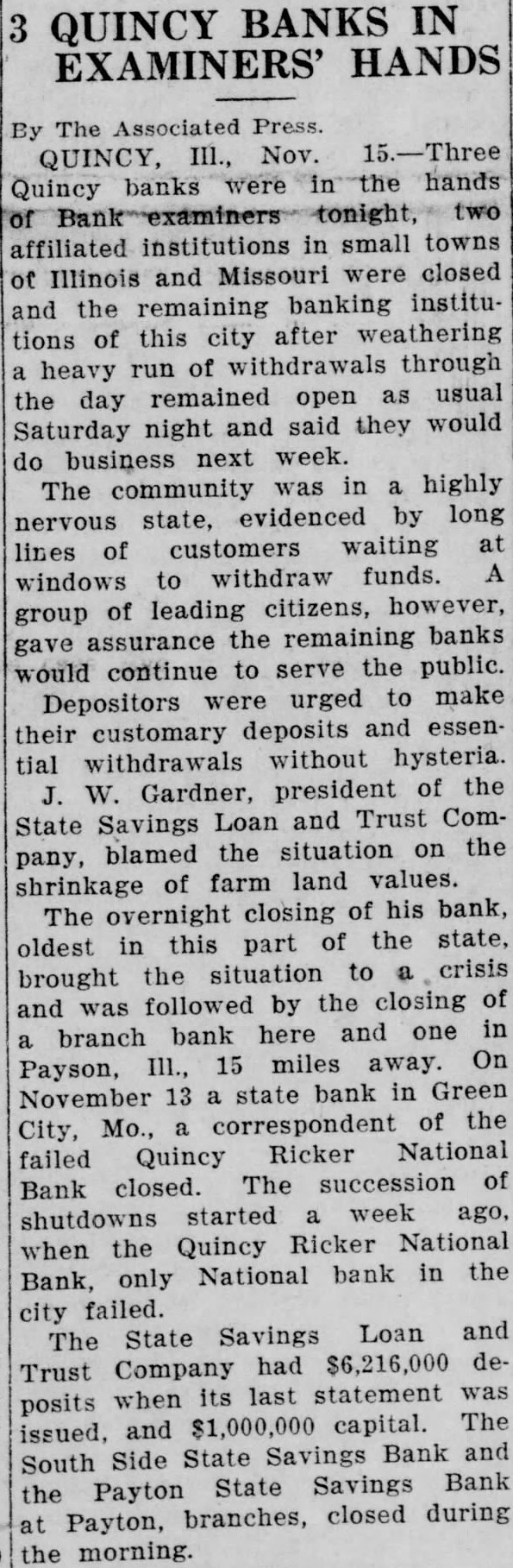 Present Next good Gain Vanarsdale was State Mr. and brought Alabama similar trip last year buck at that California BANKS QUINCY Colorado Delaware Florida Associated Georgia Three Illinois QUINCY, Idaho the hands banks in Quincy Illinois examiners Saturday, Bank Indiana in small affiliated Iowa closed and Missouri Illinois Kansas banking instituthe remaining Kentucky after weathering Louisiana this city tions through Maine run heavy usual Maryland remained open day they would night and said Michigan do Minnesota highly The Mississippi evidenced long state, Missouri customers waiting of Montana withdraw funds. windows leading citizens, Nevada of remaining banks Hampshire the serve the public. continue Mexico make urged Depositors York deposits their customary North Carolina without Dakota the Gardner, president Ohio and Trust ComSavings Loan Oklahoma the situation blamed Oregon land values. of farm shrinkage of his bank, Island overnight closing the state, South Carolina this part oldest crisis Dakota situation brought the closing followed by here and one branch bank Utah miles away. 15 Payson, bank in Green state November Virginia City, Mo., Washington National Ricker Virginia failed Quincy West The succession closed. week started shutdowns Ricker National the Quincy Total National bank Bank, only