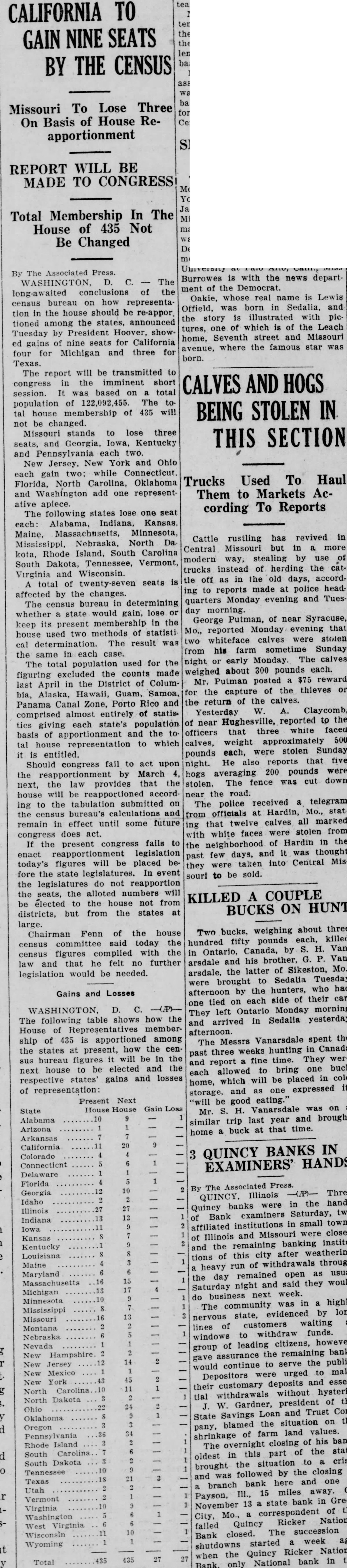 By The Associated Press. The long-awaited conclusions of the census bureau on how tion in the house should be re-appor the tioned among the states, announced Tuesday by President Hoover, showgains of nine seats for California four for Michigan and three for Texas. The report will be transmitted to in the imminent short congress session. It based on total 122,092,455. The topopulation house membership of 435 will changed. Missouri stands to lose three Georgia, Iowa, Kentucky and Pennsylvania each two. New Jersey, New York and Ohio each gain two; while Connecticut. Florida, North Carolina, Oklahoma and Washington add one ative apiece. The following states lose one seat each: Alabama, Indiana, Kansas. Minnesota, Maine, Nebraska, North Da Mississippi, kota, Rhode Island. South Carolina South Dakota, Tennessee, Vermont, Virginia and Wisconsin. tle seats total affected the changes. The bureau in determining census whether state would gain, lose keep its present membership in the house used methods of statisti cal determination. The result the same case. population used for the The total excluded the counts made figuring last April in the District of Columbia, Alaska, Hawaii, Guam, Samoa, Panama Canal Zone, Porto Rico and comprised almost entirely of statisstate's population of tics giving each basis of apportionment and the house representation to which tal entitled. Should congress fail to act upon the reapportionment March next, law provides that house be reapportioned accord to the tabulation submitted census bureau's and remain in effect until some future congress does act. the present congress enact legislation today's figures be placed fore the state legislatures. In event the legislatures do not reapportion the alloted numbers will the seats, elected to the house not from districts, but from the states large. Chairman Fenn of the house committee today the census figures complied with the census law and that he felt further legislation would be needed.
