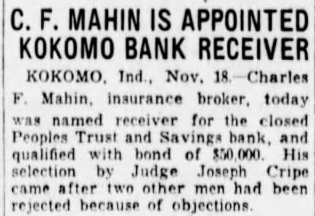 Charles Mahin... today was named for the closed Peoples Trust and qualified with bond of $50,000. His selection Judge Joseph Cripe... (Nov. 18 report).