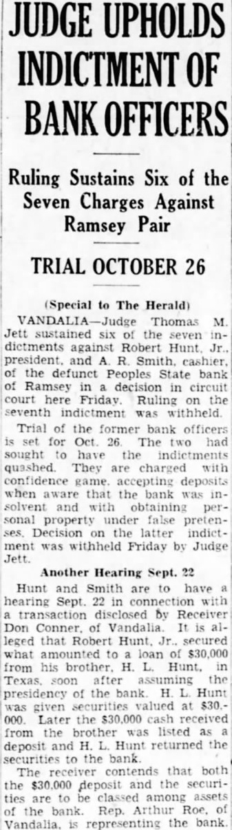 UPHOLDS INDICTMENT OF Ruling Sustains Six of the Seven Charges Against Ramsey Pair TRIAL OCTOBER (Special to The Herald) Thomas Jett sustained six the dictments against Robert president. and the defunct Peoples State bank Ramsey decision circuit court Ruling the seventh indictment withheld Trial of the former bank officers set for The had sought have quashed. They are charged with confidence game deposits when aware that the bank solvent and with obtaining personal property under false pretenDecision on the latter ment was withheld Friday by Judge Jett. Another Hearing Sept. 22 Hunt and Smith are to have hearing Sept. connection transaction disclosed by Receiver Don of leged that Robert secured what amounted to loan of $30,000 from his brother. Hunt. in the presidency the bank H. Hunt given valued $30.000 Later the $30,000 cash received from the brother listed deposit and Hunt returned the securities the bank contends that both The the $30,000 deposit and the securities are classed among assets the Rep. Arthur Roe. representing the