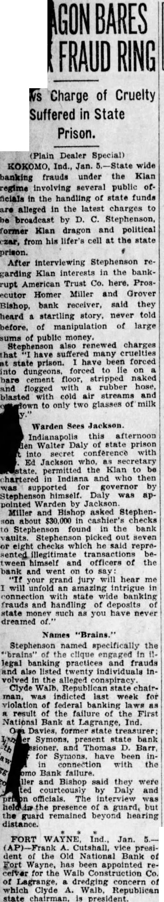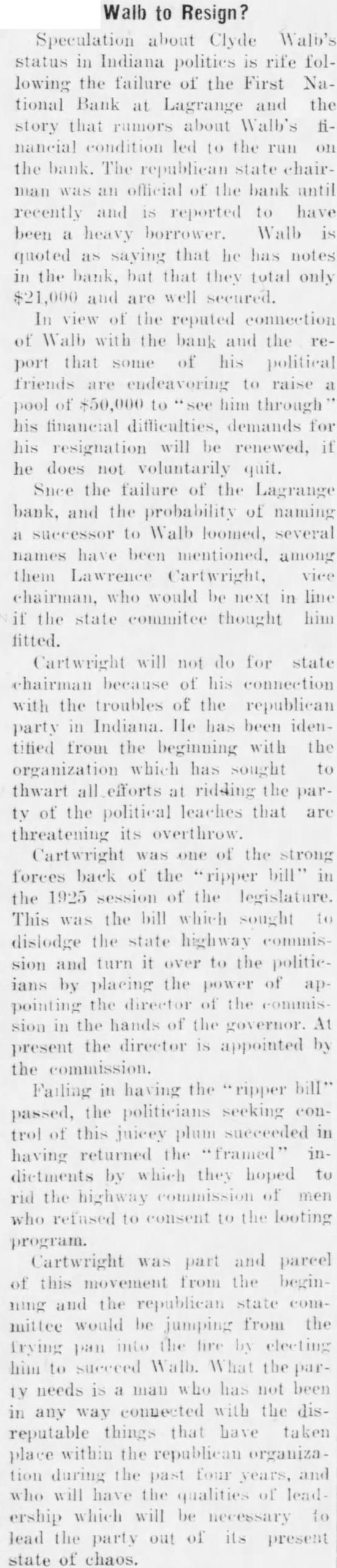 INDIANAPOLIS, Dec. the indictment of Clyde A. Walb of LaGrange by the federal grand jury placing squarely before Republican party chiefs the matter of replacing him as state chairman, numerous leaders of the party today indicated informally their reticence at proceeding prior to some. commitment from Walb himself. Some time ago Walb announced that he wished to relinquish the party reins and that "after the first of the year" he wished to devote his time exclusively to the interests of the Walb construction company, of which he is president. Ever since Walb made his first announcement, there has DIVERS TO ENTER been a spirited jockeying among. various candidates for the place. Jesse Murden, Peru, chairman S-4 HULL TODAY of the eleventh district, now appears to have the inside Will Remove Bodies From track, with his actual selection deferred until such time as the Engine Room if party leaders consider propitPossible ious for completing the actual change in PROVINCETOWN, Mass., Dec. 31 Today was banner political occasion (AP) Rough seas and threat of storm for Indianapolis, and local baunts of Reforced suspension of salvage operations publican leaders were generously popon the sunken submarine S-4 late today, ulated with Indianapolis and state party workers here for with James after everything was in readiness for E. Watson, senior senator, who was in removing the engine room hatch and the city for that purpose and also to entering the hull in quest of bodies. It testify before the Marion county grand is believed that 10 the 40 men who jury.