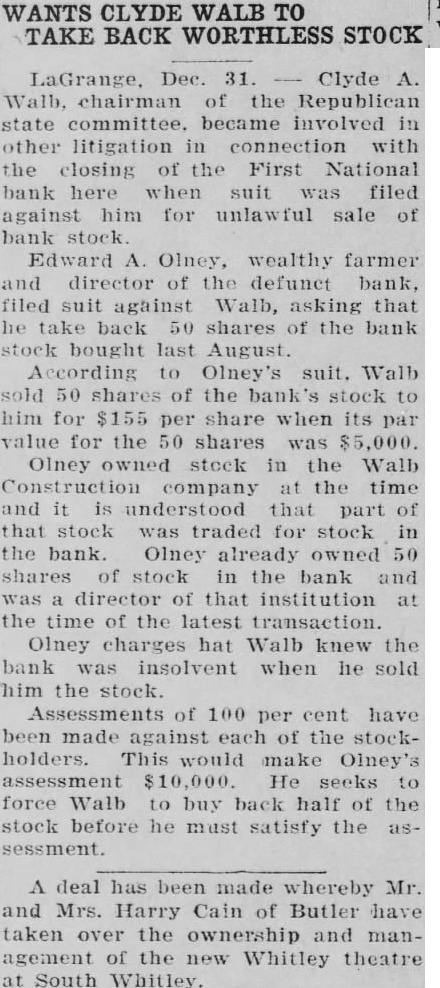 Began Conspiracy The first date in the charges in Jan1922, when Walb and are charged with starting the alleged conspiracy which the took trace from that date until 25, 1927, the date of commission of the last overt act. was president and Walb vicepresident throughout the period. They continued hold those until August 9, 1927, when they resigned John P. Caton became vice president and acting president. run on the two months later terminated in the directors closing it October 24, and turning its affairs over to John F. Utt, eral banking examiner, who subsequently was appointed temporary Utt investigated its affairs and turned in report to the comptroller of in Washington is was referred to the department tice. The latter agency sent out Paulson accountant, to bank's Paulson has the principal witnesses before jury in its four-day of in the case. Paulson brought books, nals, ledgers, cash books, papers, and affidavits from Grange for submission to the jurors. During the nearly forty were called, of the employes of the Walb struction rectors and the bank LaGrange county names had affixed 8 forged Each the Weaver ulent act which he is committed, traces (Turn (Number Three)