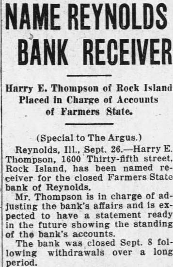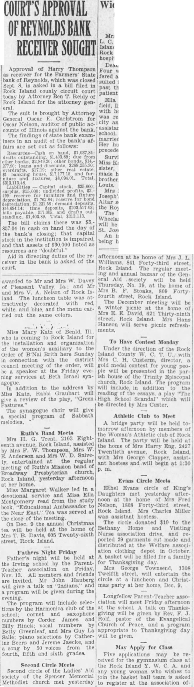 Approval of Harry Thompson Four the Farmers' State bank Reynolds, which Sept. asked bill filed in Rock Island county circuit court today by Reidy Rock Island for the attorney genThe suit is brought by Attorney General Oscar Carlstrom Oscar auditor of public counts of Illinois against the bank. school. The findings state bank married in an audit of bank's Her fairs are set out follows: fixtures, $8,094.01. Total, brother, $25,000: Louis. Capital Joseph's The The bill claims there was in cash hand the St. the bank's closing; that capital the being and that assets listed Aid duties of the ceiver the bank asked of the court. Rock awarded to Mr and Mrs W. Davey Pleasant Valley, and Mrs Nelson Rock and land. luncheon table was tractively decorated with red. white. blue, and the menu carried out the same colors.