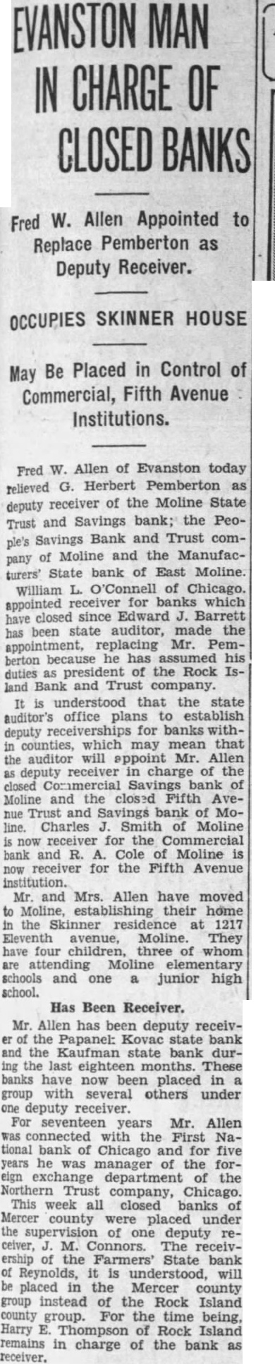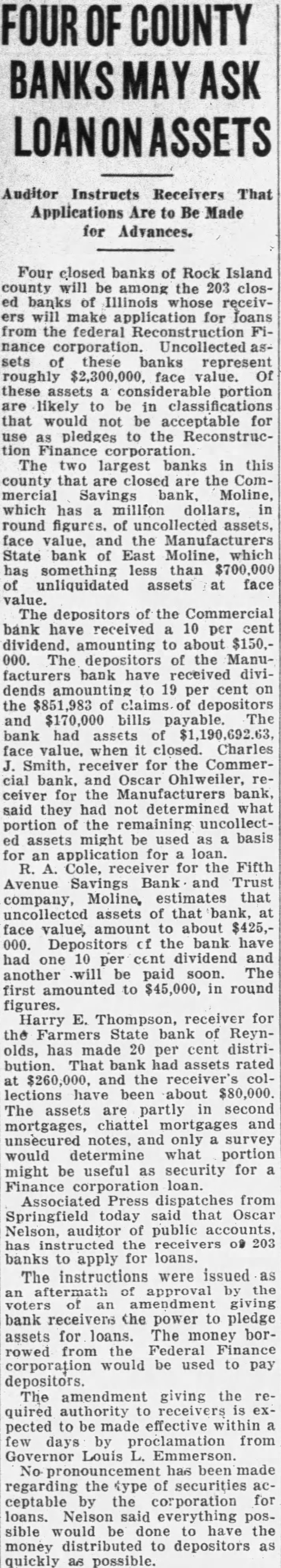 Auditor Instructs Receivers That Applications Are Be Made for Advances. Four closed banks of Rock Island county will among the 203 closbanks of Illinois receivwill make application for loans from the federal nance Uncollected sets of these banks represent roughly face value. Of these portion likely be that would not be acceptable for pledges to the ReconstrucThe two largest banks in this county that are closed are the Commercial Savings bank, Moline, which has million dollars, round figures. of uncollected assets, face and the State bank of East Moline, which has something less than unliquidated assets at face value. The depositors of the Commercial bank have received 10 per cent dividend. amounting to about $150.The depositors of the Manufacturers bank have received dividends to 19 per cent the of claims of depositors and $170,000 bills payable. The bank had assets of face value. when closed. Charles Smith, receiver for the Commerbank, and Oscar Ohlweiler, ceiver for the Manufacturers bank, said they had not determined what portion of remaining uncollectassets might be used basis for an application for loan. Cole, receiver for the Fifth Avenue Savings Bank and Trust company, Moline, estimates that uncollected assets of that bank, face value, amount to about $425,000. Depositors bank have had one 10 per cent dividend and another will be paid soon. The first amounted to in round figures. Harry E. Thompson, receiver for the Farmers State bank of Reynolds, has made 20 cent distribution. That bank had assets rated and the receiver's collections have been about $80,000. The assets are partly second mortgages, chattel mortgages and unsecured notes, and only survey would determine what portion might be useful as security for corporation loan. Associated Press dispatches from Springfield today said that Oscar Nelson, auditor of public accounts. the receivers banks to apply for loans. The instructions were issued of the amendment giving bank the power to pledge for loans. The money borassets rowed corporation would used to pay depositors. The amendment giving the quired authority receivers pected to be made effective within days proclamation from Governor Louis Emmerson. has been made regarding the type of securities ceptable by the corporation for loans. Nelson said everything possible would done the money distributed to depositors quickly as possible.