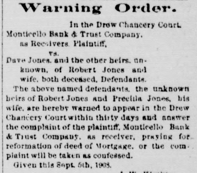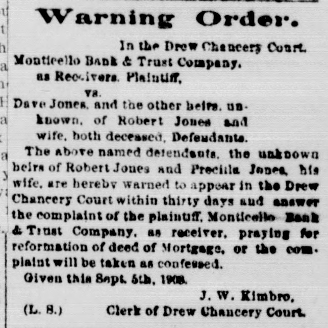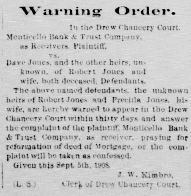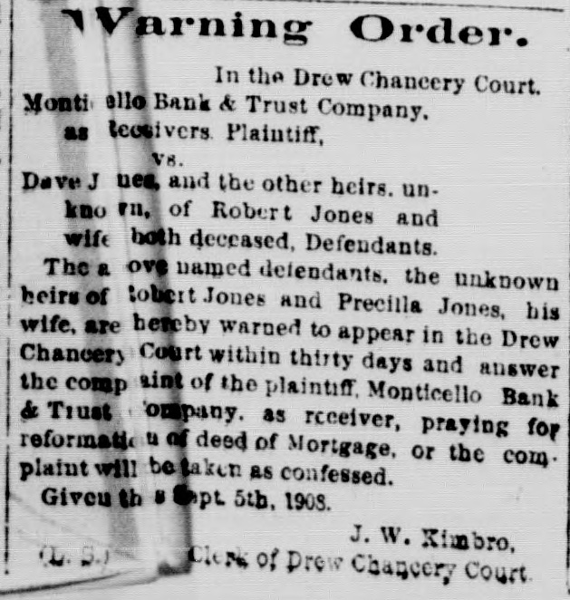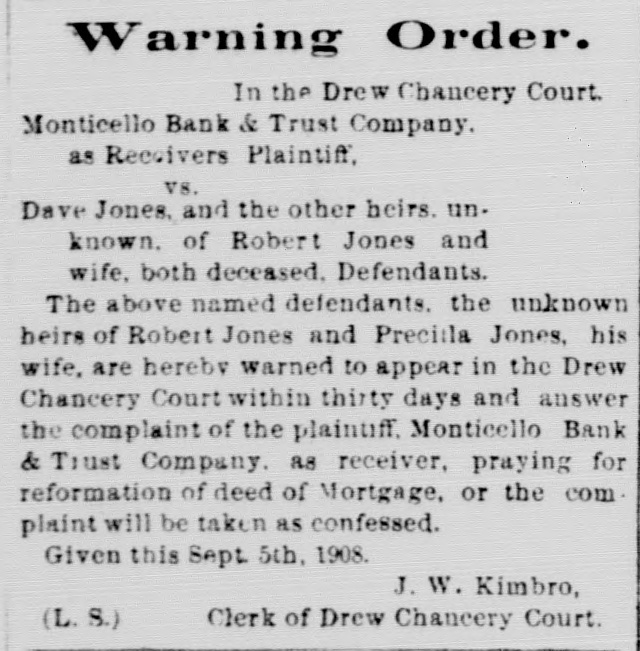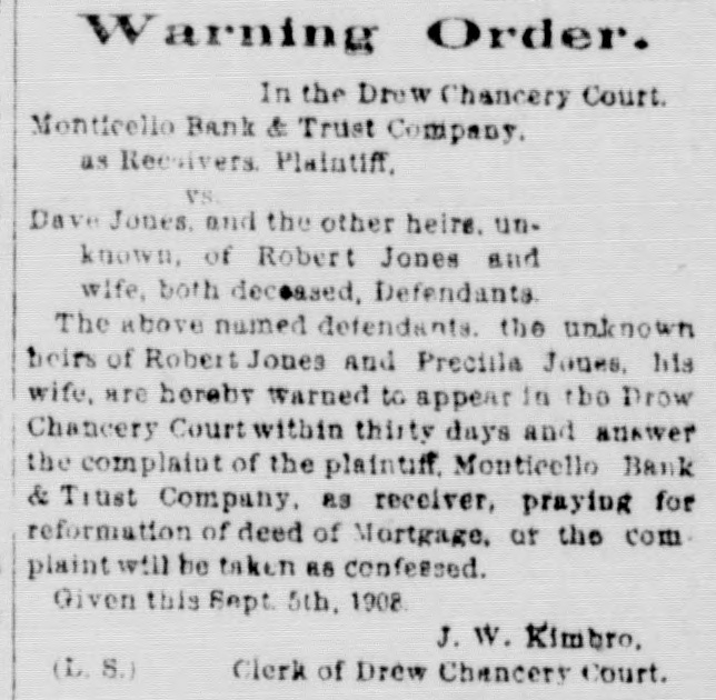 Warning Order. In the Drew Chancery Court. Monti ello Bank & Trust Company. as Receivers. Plaintiff, V8. Dave J nes, and the other heirs. unkno vil, of Robert Jones and wife both deceased, Defendants. The a ove named defendants. the unknown heirs of tobert Jones and Precilla Jones, his wife, are hereby warned to appear in the Drew Chancery Court within thirty days and answer the comp aint of the plaintiff. Monticello Bank & Trust ompany. as rcceiver, praying for reformatic a of deed of Mortgage, or the com. plaint will be taken as confessed. Given th @ Sept. 5th, 1908. J. W. Kimbro, (L.S.) Clerk of Drew Chancery Court.