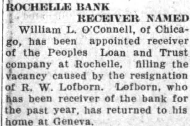 William L. O'Connell, of Chicago, has been appointed receiver the Peoples Loan and Trust company at Rochelle, filling the vacancy caused by the resignation of W Lofborn.