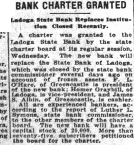 BANK CHARTER GRANTED Ladoga State Bank Replaces Institution Closed Recently. A charter was granted to the Ladoga State Bank by the state charter board at its regular session, The new bank will replace the State Bank of Ladoga, which was closed by the state bank several days ago frozen of Greencastle president Homer is and James Ladoga, of Greencastle in cashier. are experienced cording to the report of the state bank missioner Luther to of the charter new bank have capital stock of 25,000. More than subscribers petitioned the board for the charter.