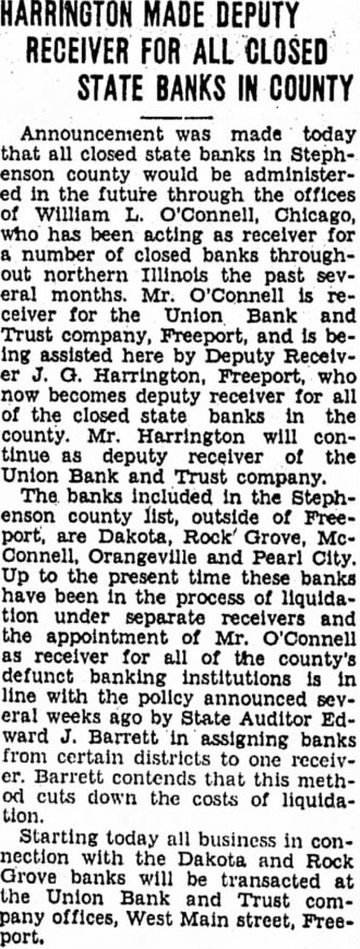 MADE RECEIVER FOR ALL CLOSED STATE BANKS COUNTY made today that all closed state banks Stephenson county would administerthe future through offices William Chicago, has acting number closed banks throughnorthern the past Mr. for the Union Bank Freeport, and assisted here Deputy Receivdeputy receiver for the closed state banks the county. Mr. Harrington tinue deputy of the Union Bank and Trust The banks in the Stephcounty list, outside Freeare Dakota, Rock Grove, Orangeville and Pearl City. to the present been the process of liquidaunder and Mr. receiver for the county's defunct institutions with the announced Auditor assigning banks certain districts to receivone that methcuts down the costs of liquidaStarting today business in connection Dakota and Rock Grove banks be transacted Union Bank and Trust offices, West Main street, port.