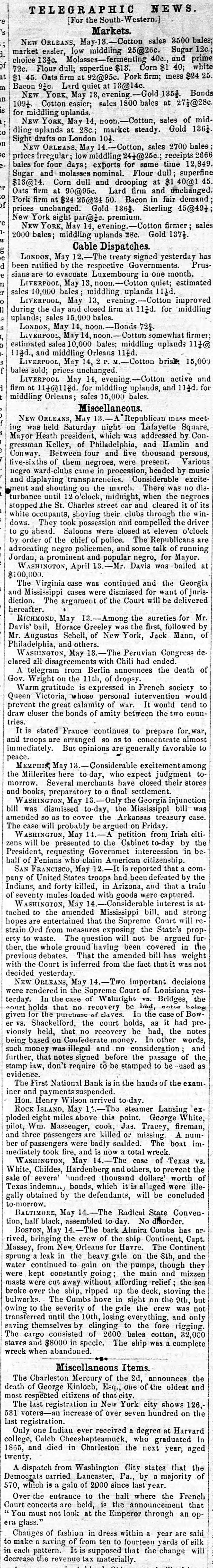 NEWS. e [For ELEGRAPHIC the 's Markets. May-18.-Cotton sales 3500 Sugar 12c. market easier, a NEW ORLEANS, low middling 25@26c. 40c., and prime of Molasses-fermenting 40; white at at firm 92@95c. choice 72c. Flour 134c. dull; superfine 813. Pork Corn firm; 81 mess $24 2 in Bond S1 45. 91c. Oats Lard quiet at 13@14c Gold 135g in 1091. Cotton easier; Bacon NEW YORK, May 13, sales evening. 1800 bales at 27t@28c is for middling uplands -Cotton, sales of 1361 mid to in NEW uplands YORK, at May 28c.; 14, noon. market steady. Gold Sight dling drafts on London 14.-Cotton, 104 sales receipts 2666 2700 bales NEW irregular: ORLEANS, low May middling 24+@25c.; same time 12,849 e prices days; exports for dull; superfine Sugar and molasses and drooping at er $13@14. bales for four Corn dull nominal. Lard firm Flour and $1 40@1 4 unchanged demand of Oats firm at 90@95c. 50. Bacon in fair 45@491 prices unchanged. to Pork firm at $24 25@24 Gold 1364 Sterling e New York sight par@tc. premium. Cotton firmer; sale 2000 NEW bales; YORK, middling May 14, uplands evening 28c. Gold 1371 Cable Dispatches. has d May 12. The treaty Governments. signed yesterday Prus ratified by the respective in one month. been siansare LONDON, to evacuate 13, Luxembourg noon.- -Cotton quiet; estimated sales LIVERPOOL, 10,000 bales May middling evening uplands Cotton 111d. improved during the day bales. LIVERPOOL, May and closed 13, firm at 111d. for middling uplands; sales May 15,000 14, Bonds 724 firmer sales LONDON, LIVERPOOL, May 10,000 14, noon bales; Cotton middling somewhat uplands 111@ LIVERPOOL, May 14, estimated 114d., and middling Orleans 114d. Cotton brisk, 15,000 bales sold; prices unchanged. evening Cotton active and for LIVERPOOL May for 14, middling uplands, and 114d. middling firm at 111@114d. Orleans; sales 15,000 bales. Miscellaneous. meet NEW ORLEANS, May 13.-A Republican on Lafayette mass Square, ing was held Saturday which night was addressed by Con- and four and Between gressman Mayor Heath Kelley, president, of Philadelphia, five thousand and Hamlin persons, Various five-sixths Conway. of them negroes, procession, were present. headed by music transp: negro ward clubs came rencies. in Considerable was no excite- diauntil o'clock, it and ment and and displaying shouting on the midnight, march. when There the negroe of its cleared turbance stopped the St. Charles street their car clubs through the the driver win dows. white occupants, They took shoving possession were closed and compelled at Republicans eleven o'clock are to go order ahead. of the Saloons chief of police. some The talk of running advocating by negro policemen, and negro, for Mayor at WASHINGTON, Jordan, prominent April and 13 popular Mr. Davis was bailed $100,000 was continued and want the Georgia of juris The Virginia cases case were dismissed for will be delivered for diction. and Mississippi The argument of the Court Mr sureties hereafter. RICHMOND May 13.-Among Greeley was the the first, followed Mann, by of Mr. Augustus Schell, Davis' bail, Horace of New York, Jack de Philadelphia, WASHINGTON, and others. May 13. The Chili Peruvian had ended Congress of from clared all disagreement Berlin with announces the death A telegram on the 11th, of dropsy. in to Gov Warm Wright gratitude is expressed personal intervention French society would Queen Victoria, whose calamity of war. It would tend coun- to draw prevent closer the the great bonds of amity between the two tries. stated France continues to concentrate prepare for almost war, immediately. and It is troops are But arranged opinions so are as to generally favorable to peace. MEMPHIS May 13 Considerable excitement among judgment to Millerites here to-day, who expect closed their stores morrow. the Several merchants final have settlement. and books, preparatory May 13 to Only the Mississippi Georgia injunction bill was cover bill W ASHINGTON, was dismisse to day, the the Arkansas treasury case. amended The case will so as probably to be argued petition on Friday. from Irish citiWASHINGTON, presented May 14.-A to the Cabinet intercession today by in be- the President, zens will be requesting claim Governmet American citizenship comthe half of Fenians who May 12 It is reported defeated that by SAN FRANCISCO, United States troops had been and that a train pany of killed, in Arizona, Indians, and forty loaded with goods were captured Mississippi of seventy WASHINGTON mules May 14 Consider bill, interest and strong atwill rehopes exposing tached are to entertained the amended that the Supreme the Court State's propstrain Ord from The mea question will not covered be argued in fur the erty ther, to the waste. whole ground having the amended been bill has weight not previous with the Court debates. is inferred That from the fact that it was decided yesterday -Two important decisions yesNEW ORLEANS, May Supreme Court of Louisiana the were rendered in case the of Waiurig bad, vs. Bridges, notes terday. holds In the that no recovery be In the case of Bow given for the of slaves court holds, as it had notes preShackelford, the be had, the er vs. viously held, that Confederate no recovery money In other words, and such being money based was on illegal and before no consideration the passage of the as law, further, that don't notes require signed to be stamped to be used stamp evidence. The First National Bank is in the hands of the examex. iner and Henry payments Wilson suspended. arrived o-day. Lansing ROCK Hon. ISLAND, May above -The this point steamer George fireman, White, ber pilot, ploded Wm. eight Massenger, miles cook, killed Jas or missing. Tracey, A num- imand of three passenger passenger were are badly scalded. total wreck The boat mediately took fire May and is -The now case to of prevent Texas the vs. of severa it is a were White, WASHINGTON, Childes, hundred Hardenberg thousand and others, dollars' worth ille of leged sale Texas gally obtained indemnie by bonds, the defendants, which will