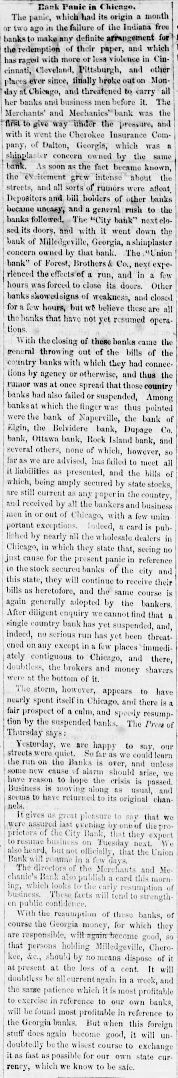 Bank Panic in Chicago, The panic, which had its origin a month or two ago in the failure of the Indiana free banks to make any definite arrangement for the redemption of their paper, and which has raged with more or less violence in Cincinnati, Cleveland, Pittsburgh, and other places ever since, finally broke out on Monday at Chicago, and threatened to carry all her banks and business men before it. The Merchants' and Mechanics' bank was the first to give way under the pressure, and with it went the Cherokee Insurance Com pany, of Dalton, Georgia, which was : shinplaster concern owned by the same bank. As soon as the fact became known the excitement grew intense about the streets, and all sorts of rumors were afloat Depositors and bill holders of other bank became uneasy, and a general rush to th banks followed, The "City bank" next elo sed its doors. and with it went down th bank of Milledgeville, Georgia, a shinplaste concern owned by that bank. The "Unior bank" of Forest, Brothers & Co., next expe rienced the effects of a run, and in a fey hours was forced to close its doors. Othe banks showedsigns of weakness, and close for a few hours, but we believe these are al the banks that have not yet resumed opera tions. With the closing of these banks came th general throwing out of the bills of th country banks with which they had connec tions by agency or otherwise, and thus th rumor was at once spread that those countr banks had also failed or suspended, Amon banks at which the finger was thus pointe were the bank of Naperville, the bank o Elgin, the Belvidere bank, Dupage Co bank, Ottawa bank, Rock Island bank, and several others, none of which, however, S far as we are advised, has failed to meet al it liabilities as presented, and the bills o which, being amply secured by state stocks are still current as any paper in the country and received by all the bankers and busines men in or out of Chicago, with a few unim portant exceptions. Indeed, a card is pub lished by nearly all the wholesale dealers in Chicago, in which they state that, seeing no just cause for the present panic in reference to the stock secured banks of the city and this state, they will continue to receive thei bills as heretofore, and the same course i again generally adopted by the bankers After diligent enquiry we cannot find that single country bank has yet suspended, and indeed, no serious run has yet been threat ened on any except in a few places immedi ately contiguous to Chicago, and there doubtless, the brokers and money shaver were at the bottom of it. The storm, however, appears to hav nearly spent itself in Chicago, and there is fair prospect of a calm, and speedy resump tion by the suspended banks. The Press o Thursday says: Yesterday, we are happy to say, ou streets were quiet. So far as we could lear the run on the Banks is over, and unles some new cause of alarm should arise, w have reason to hope the crisis is passed Business is moving along as usual, and seems to have returned to its original chan nels. It gives us great pleasure to say that w were assured last evening by one of the pro prictors of the City Bank, that they expec to resume business on Tuesday next. W also heard, but not officially, that the Unio Bank will resume in a few days. The directors of the Merchants and Mo chanic's Bank also publish a card this morn ing, which looks to the early resumption ( business. These facts will tend to strength en public confidence. With the resumption of these banks, ( course the Georgia money, for which the are responsible, will again become good, S that persons holding Milledgeville, Chere kee, &c., should by no means dispose of at present at the loss of a cent. It wi doubtless be all current again in a week, an the same patience which it is most profitabl to exercise in reference to our own bank will be found most profitable in reference t the Georgia banks. But when this foreig stuff does again become good, it will un doubtedly be the wisest course to exchang it as fast as possible for our own state cur rency, which we know to be safe.