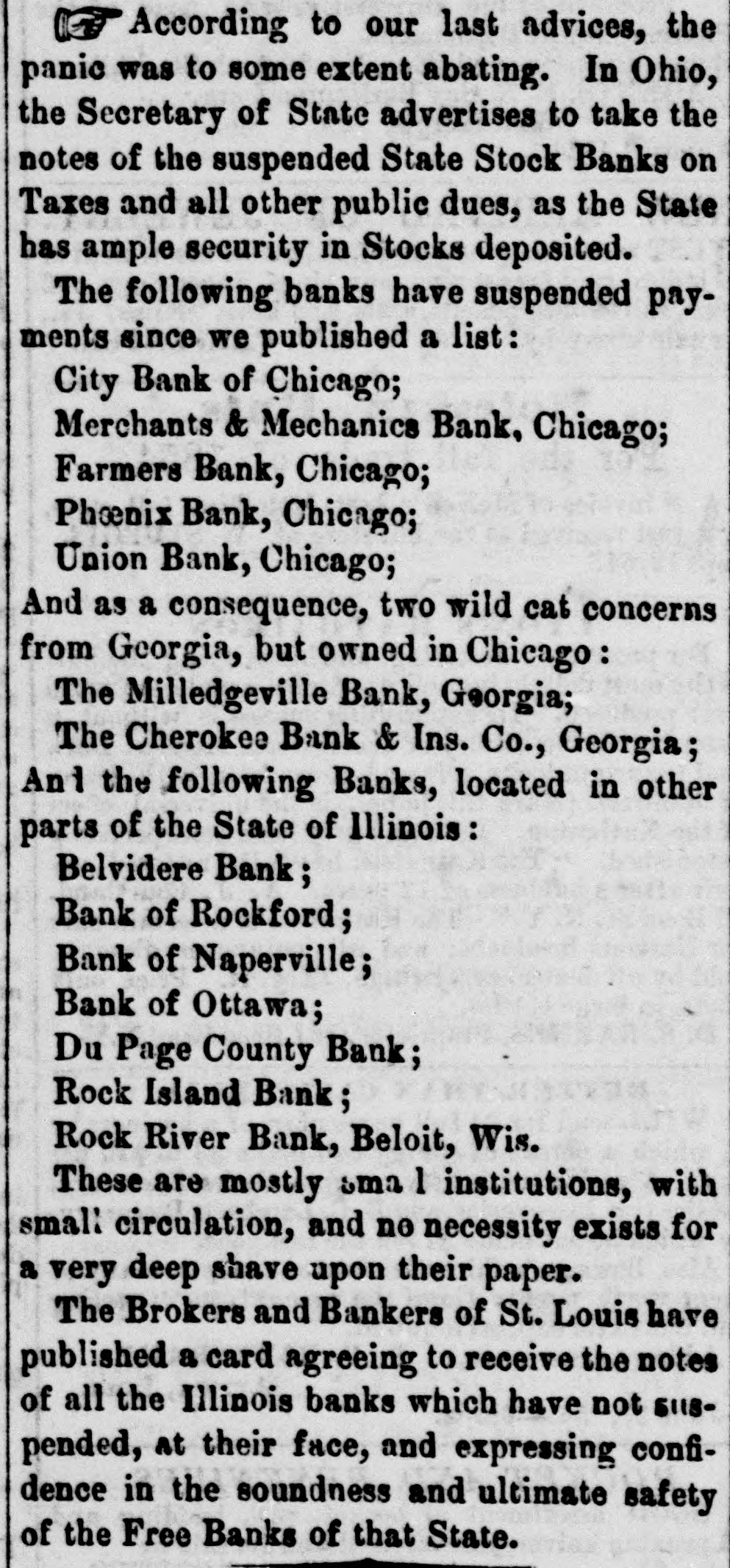 According to our last advices, the panic was to some extent abating. In Ohio, the Secretary of State advertises to take the notes of the suspended State Stock Banks on Taxes and all other public dues, as the State has ample security in Stocks deposited. The following banks have suspended payments since we published a list: City Bank of Chicago; Merchants & Mechanics Bank, Chicago; Farmers Bank, Chicago; Phoenix Bank, Chicago; Union Bank, Chicago; And as a consequence, two wild cat concerns from Georgia, but owned in Chicago: The Milledgeville Bank, Georgia; The Cherokee Bank & Ins. Co., Georgia; And the following Banks, located in other parts of the State of Illinois: Belvidere Bank; Bank of Rockford; Bank of Naperville; Bank of Ottawa; Du Page County Bank; Rock Island Bank; Rock River Bank, Beloit, Wis. These are mostly sma 1 institutions, with small circulation, and no necessity exists for a very deep shave upon their paper. The Brokers and Bankers of St. Louis have published a card agreeing to receive the notes of all the Illinois banks which have not 5113pended, at their face, and expressing confidence in the soundness and ultimate safety of the Free Banks of that State.