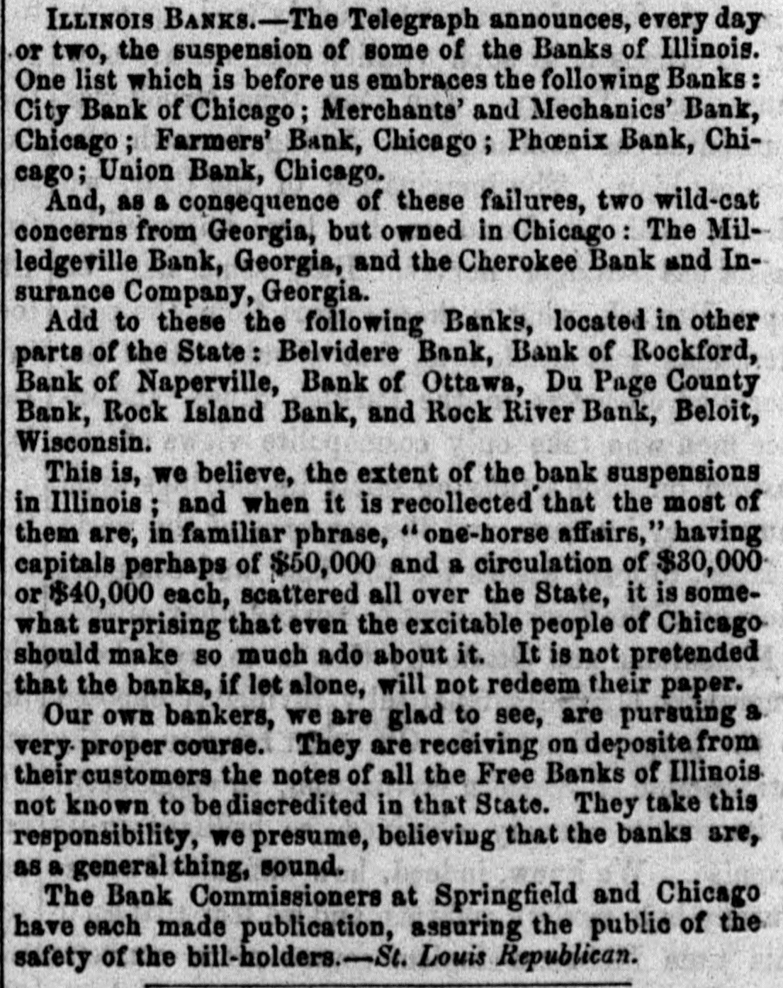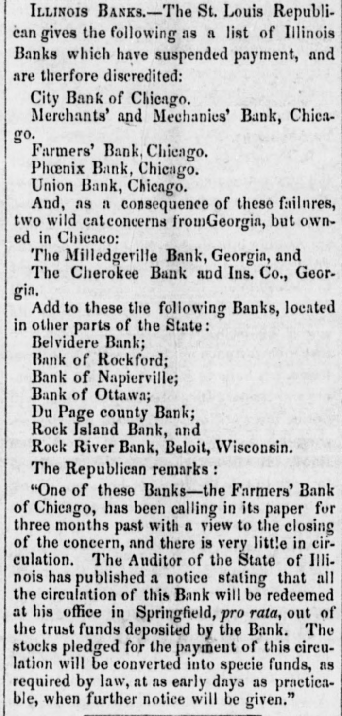 ILLINOIS BANKS.-The St. Louis Republican gives the following as a list of Illinois Banks which have suspended payment, and are therfore discredited: City Bank of Chicago. Merchants' and Mechanies' Bank, Chicago. Farmers' Bank, Chicago. Phoenix Bank, Chicago. Union Bank, Chicago. And, as a consequence of these failnres, two wild catconcerns fromGeorgia, but owned in Chicaco: The Milledgerille Bank, Georgia, and The Cherokee Bank and Ins. Co., Georgia. Add to these the following Banks, located in other parts of the State: Belvidere Bank; Bank of Rockford; Bank of Napierville; Bank of Ottawa; Du Page county Bank; Rock Island Bank, and Rock River Bank, Beloit, Wisconsin. The Republican remarks: "One of these Banks-the Farmers' Bank of Chicago, has been calling in its paper for three months past with a view to the closing of the concern, and there is very little in circulation. The Auditor of the State of Illinois has published a notice stating that all the circulation of this Bank will be redeemed at his office in Springfield, pro rata, out of the trust funds deposited by the Bank. The stocks pledged for the payment of this circulation will be converted into specie funds, as required by law, at as early days as practicable, when further notice will be given."
