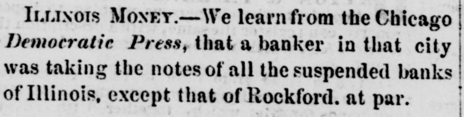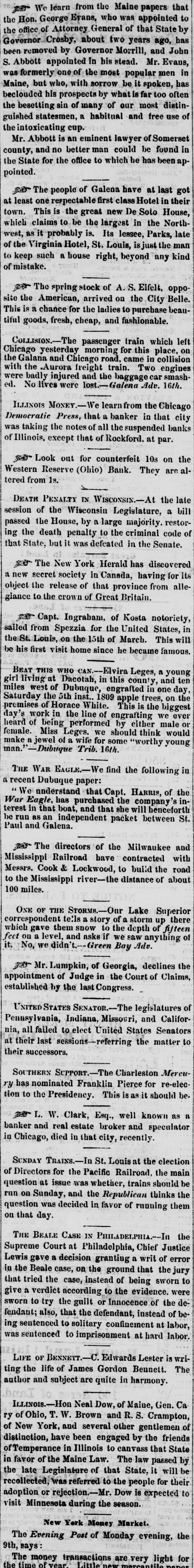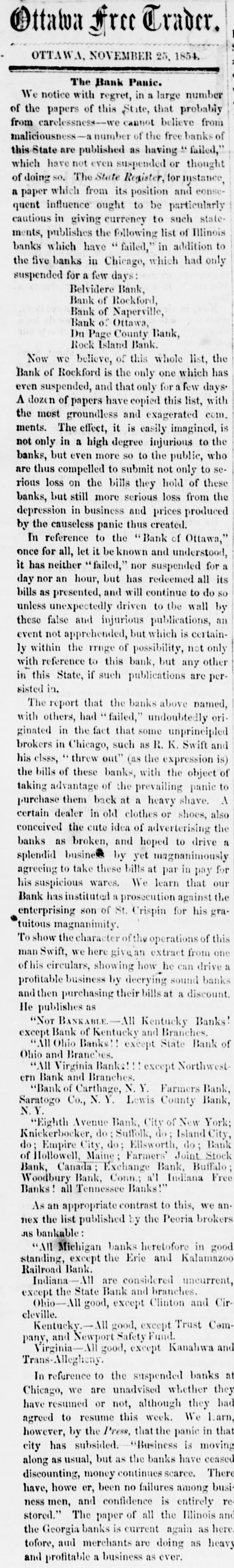 Loss OF THE STEAMER YANKEE BLADE.-The steamer Yankee Blade left San Francisco, Sept. 30, with 800 passengers and $153,000 in specie. Oct. 1, at 31 o'clock, P. M., whilst encompassed in a dense fog, she ran upon a reef of rocks, off Point Arguilla, and in less than twenty-five minutes sank in water below the promenade deck. The boats were immediately manned and all the passengers taken from the wreck, but one of the boats unfortunately stranding about thirty lives were lost. The next morning the steamer Goliath made her appearance and succeeded in picking up the survivors yet on the sea, amounting to six hundred, and landed them at San Diego, whither she was bound. Five hundred and thirty-six were left there until a vessel could be sent to bear them on their homeware journey. On her return the remaining part of the passengers and crew left were taken on board and landed at San Francisco. WRECK OF THE STEAMSHIP NEW ERA-TERRIBLE LOSS OF LIFE.-The packet ship New Era, of Bath, Maine, on her passage from Bremen to New York, with over two hundred and sixty passengers on board, in a dense fog, on Sunday night, went ashore off Deal, on the Jersey shore, and will probably prove a total wreck. The latest n'elligence received, states that the ship was breaking up, and more than one half of the passengers had been drowned in between the decks and overboard, and many were yet clinging to the wreck with but little prospect of being saved; the sea constantly breaking over the wreck and running so high that even a life boat could not out ride the waves. The passengers were all Dutch or German. BROKEN BANKS.-The following is a list of banks which have recently burst up, and are today rejected by our brokers. Each day adds new ones to the list. Where it will end cannot be determined. There is now but one safe rule and that is to take as little paper money as possible, unless you know that the bills are secured by safe stocks, and keep no others on hand.This is a necessary finale to such an increase of banks as we have had for the last few years.-So great an expansion of the currency was sure to bring a crash, and notwithstanding the repeated warnings, the banks have continued to increase in an unprecedented ratio. Here is the list: Maine-Bank of Hollowell, Shipbuilder's Bank. Indiana-All free banks. Ohio-All banks except State Bank and branches. Connecticut-Woodbury bank, Middletown bank. New York-Lewis County bank, Exchange bank of Buffalo, City bank of Buffalo. Kentucky-All banks. Illinois-Phoenix bank, Farmers bank, Merchants and Mechanies' bank, City bank, of Chicago; Elgin bank, Ottawa bank, Dupage bank, Bellvidere bank, Rock Island, Naperville bank, of Rockford. LATER.--We learn to-night, that the State banks and branches of Ohio and Indiana are refused by the brokers of this city. If this is generally done, the effect will be far reaching, and it would not surprise us to see a very general suspension by the banks of the country. Stand from under those that can. [Grand Rapids Enquirer.