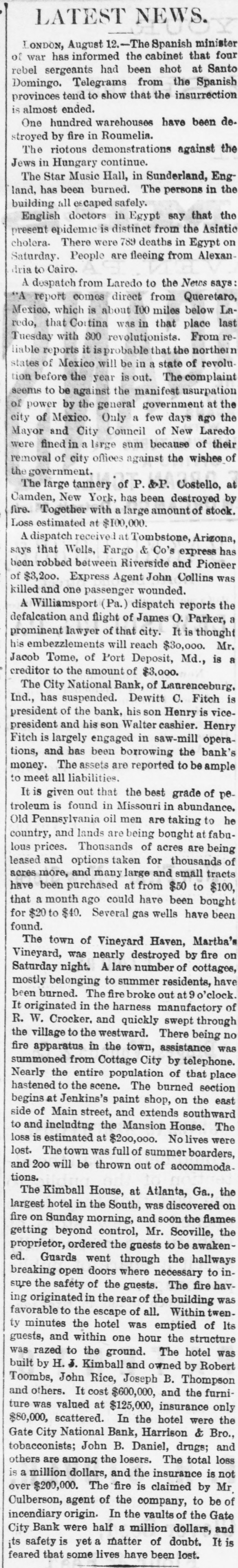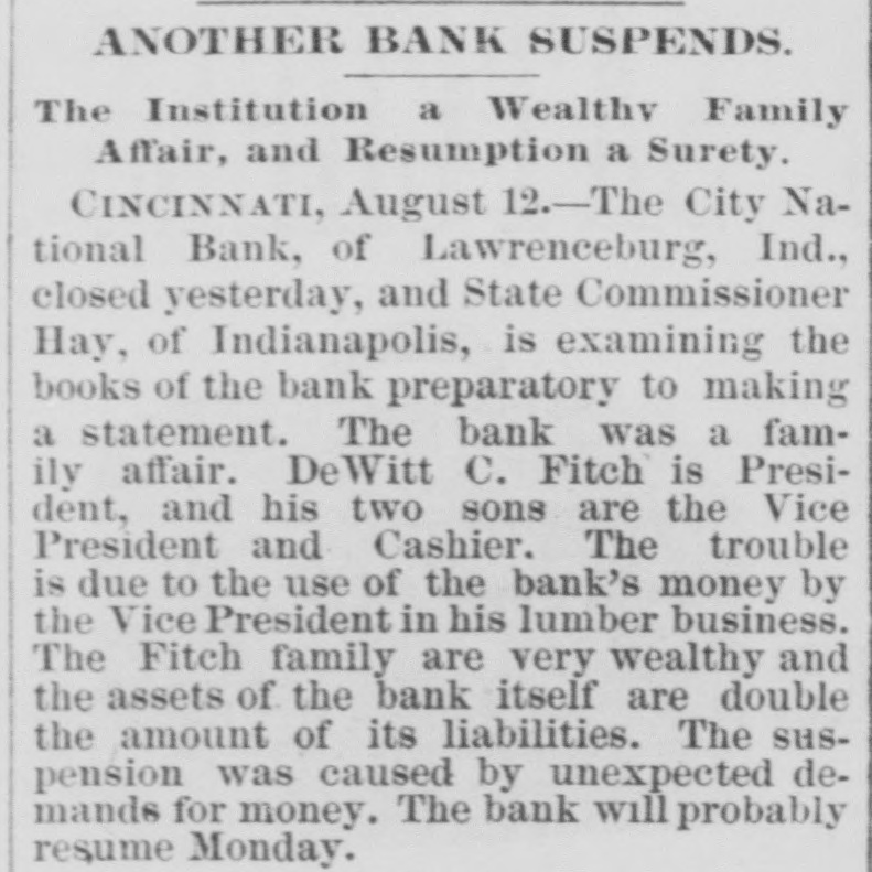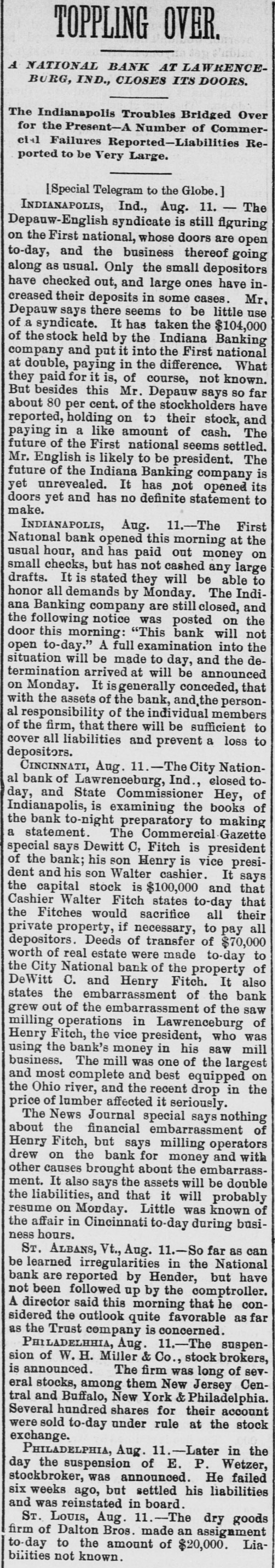 TOPPLING OVER. A NATIONAL BANK ATLAWRENCEBURG, IND., CLOSE$ ITS DOORS. The Indian&polis Troubles Bridged Over £ for the Present-A Number of Commercisl Failures Reported-Liabilities Reported to be Very Large. [Special Telegram to the Globe.] INDIANAPOLIS, Ind., Aug. 11. - The Depauw-English syndicate is still figuring on the First national, whose doors are open to-day, and the business thereof going along as usual. Only the small depositors have checked out, and large ones have increased their deposits in some cases. Mr. Depauw says there seems to be little use of a syndicate. It has taken the $104,000 of the stock held by the Indiana Banking company and put it into the First national at double, paying in the difference. What they paid for is, of course, not known. But besides this Mr. Depauw says so far about 80 on and reported, per holding cent. of the to stockholders their stock, have in a The paying of the First like amount national of cash. future seems settled. Mr. English is likely to be president. The future of the Indiana Banking company is yet unrevealed. It has not opened its doors yet and has no definite statement to make. INDIANAPOLIS, Aug. 11.--The First National bank opened this morning at the usual hour, and has paid out money on small checks, but has not cashed any large drafts. It is stated they will be able to honor all demands by Monday. The Indiana Banking company are still closed, and the was on the door this not following morning: notice "This posted bank will A full the open to-day." examination day, and into the situation will be made to determination arrived at will be announced on Monday. It sgenerally conceded, that with the assets of the bank, and the personal responsibility of the individual members of the firm, that there will be sufficient to cover all liabilities and prevent a loss to depositors. CINCINNATI, Aug. -The City National bank of Lawrenceburg, Ind. closed today, and State Commissioner Hey, of Indianapolis, is examining the books of the bank to-night preparatory to making a statement. The Commercial-Gazette special says Dewitt C, Fitch is president of the bank; his son Henry is vice president and his son Walter cashier. It says the capital stock is $100,000 and that Cashier Walter Fitch states to-day that the Fitches would sacrifice all their private property, if necessary, to pay all depositors. Deeds of transfer of $70,000 worth of real estate were made to-day to the of DeWitt and also City National C. bank Henry of the Fitch. property It states the embarrassment of the bank grew out of the embarrassment of the saw milling operations in Lawrenceburg of Henry Fitch, the vice president, who was using the bank's money in his saw mill business. The mill was one of the largest and most complete and best equipped on the Ohio river, and the recent drop in the price of lumber affected it seriously. The News Journal special says nothing about the financial embarrassment of Henry Fitch, but says milling operators drew on the bank for money and with other causes brought about the embarrassment. It also says the assets will be double the liabilities, and that it will probably resume on Monday. Little was known of the affair in Cincinnati to-day during business hours. ST. ALBANS, Vt., Aug. 11.-So far as can be learned irregularities in the National bank are reported by Hender, but have not been followed up by the comptroller. A director said this morning that he considered the outlook quite favorable as far as the Trust company is concerned. PHILADELHHIA, Aug. 11.-The suspension of W. H. Miller & Co., stock brokers, is announced. The firm was long of several stocks, among them New Jersey Central and Buffalo, New York & Philadelphia. Several hundred shares for their account were sold to-day under rule at the stock exchange. PHILADELPHIA, Aug. 11.--Later in the day the suspension of E. P. Wetzer, stockbroker, was announced. He failed six weeks ago, but settled his liabilities and was reinstated in board. ST. LOUIS, Aug. 1.--The dry goods firm of Dalton Bros. made an assignment to-day to the amount of $20,000. Liabilities not known.