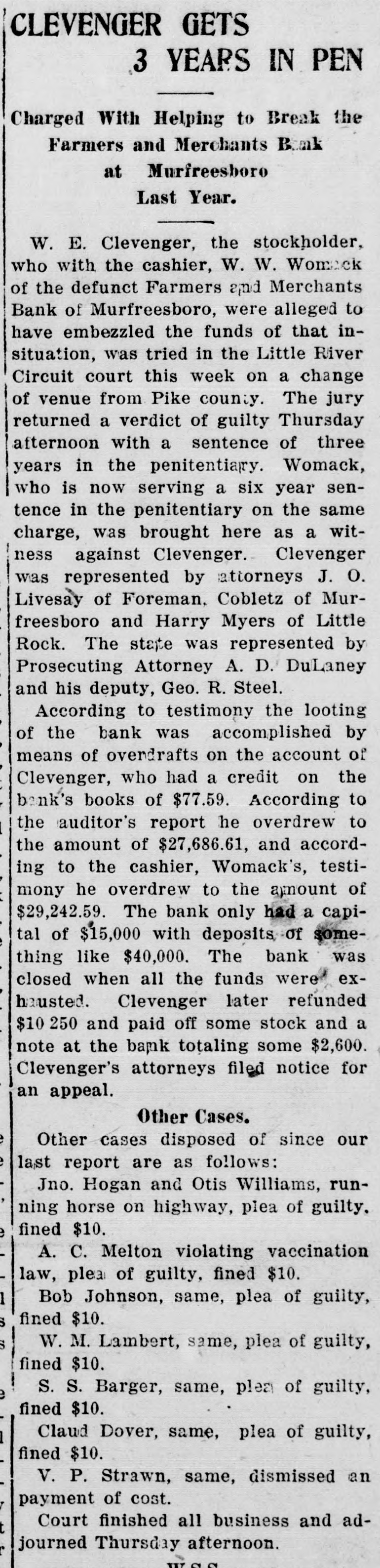 CLEVENGER GETS 3 YEARS IN PEN Charged With Helping to Break the Farmers and Merchants Beak at Murfreesboro Last Year. W. E. Clevenger, the stockholder, who with the cashier, W. W. Womack of the defunct Farmers and Merchants Bank of Murfreesboro, were alleged to have embezzled the funds of that insituation, was tried in the Little River Circuit court this week on a change of venue from Pike county. The jury returned a verdict of guilty Thursday afternoon with a sentence of three years in the penitentiary. Womack, who is now serving a six year sentence in the penitentiary on the same charge, was brought here as a witness against Clevenger. Clevenger was represented by attorneys J. O. Livesay of Foreman, Cobletz of Murfreesboro and Harry Myers of Little Rock. The state was represented by Prosecuting Attorney A. D. DuLaney and his deputy, Geo. R. Steel. According to testimony the looting of the bank was accomplished by means of overdrafts on the account of Clevenger, who had a credit on the bank's books of $77.59. According to the auditor's report he overdrew to the amount of $27,686.61, and according to the cashier, Womack's, testimony he overdrew to the amount of $29,242.59. The bank only had a capital of $15,000 with deposits of something like $40,000. The bank was closed when all the funds were exhausted. Clevenger later refunded 10 250 and paid off some stock and a note at the bank totaling some $2,600. Clevenger's attorneys filed notice for an appeal. Other Cases. Other cases disposed of since our last report are as follows: Jno. Hogan and Otis Williams, running horse on highway, plea of guilty. fined $10. A. C. Melton violating vaccination law, plea of guilty, fined $10. 1 Bob Johnson, same, plea of guilty, fined $10. W. M. Lambert, same, plea of guilty, fined $10. S. S. Barger, same, plea of guilty, fined $10. Claud Dover, same, plea of guilty, fined $10. V. P. Strawn, same, dismissed an payment of cost. Court finished all business and adjourned Thursday afternoon. was