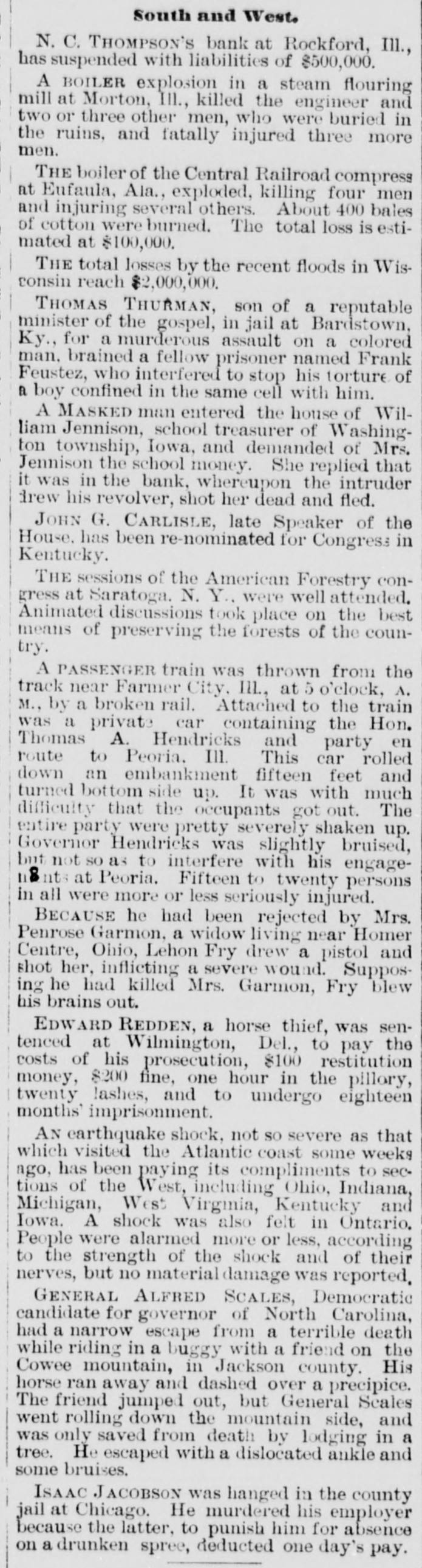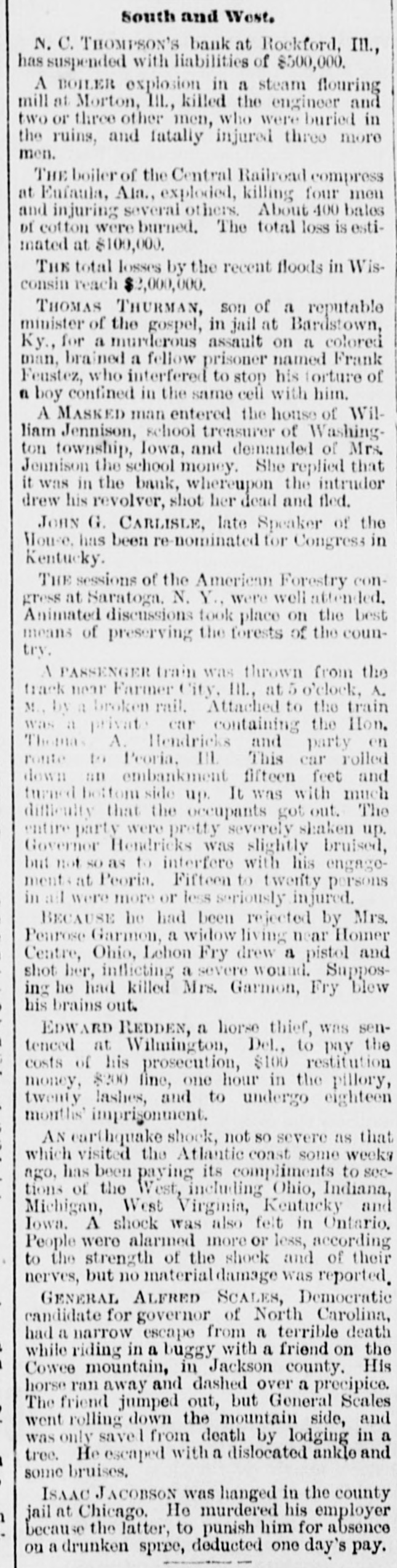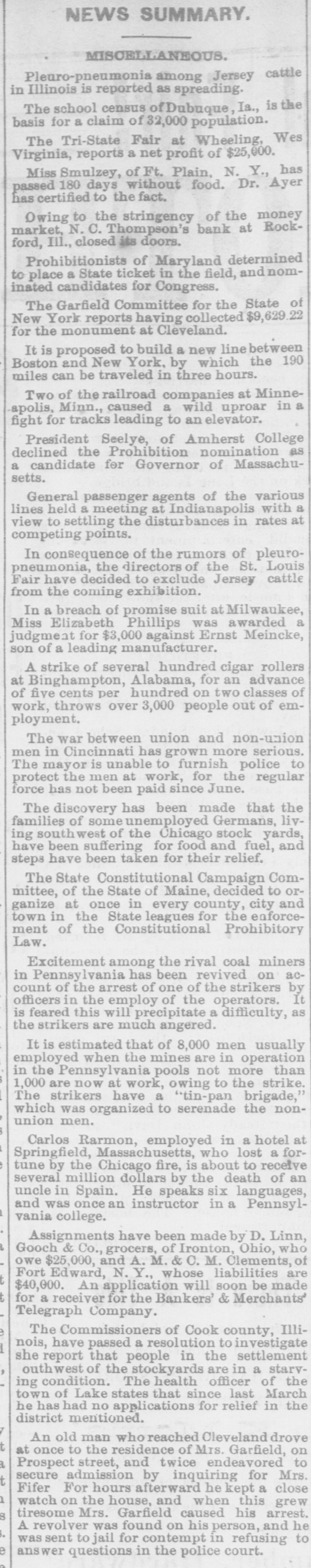 NEWS SUMMARY. MISCELLANEOUS. Pleuro-pneumonia among Jersey cattle in Illinois is reported as spreading. The school census of Dubuque, Ia., is the basis for a claim of 32,000 population. The Tri-State Fair at Wheeling, Wes Virginia, reports a net profit of $25,000. Miss Smulzey, of Ft. Plain, N. Y., has passed 180 days without food. Dr. Ayer has certified to the fact. Owing to the stringency of the money market, N. C. Thompson's bank at Rockford, Ill., closed its doors. Prohibitionists of Maryland determined to place a State ticket in the field, and nominated candidates for Congress. The Garfield Committee for the State of New York reports having collected $9,629.22 for the monument at Cleveland. It is proposed to build a new line between Boston and New York, by which the 190 miles can be traveled in three hours. Two of the railroad companies at Minneapolis, Minn., caused a wild uproar in a fight for tracks leading to an elevator. President Seelye, of Amherst College declined the Prohibition nomination as a candidate for Governor of Massachusetts. General passenger agents of the various lines held a meeting at Indianapolis with a view to settling the disturbances in rates at competing points. In consequence of the rumors of pleuropneumonia, the directors of the St. Louis Fair have decided to exclude Jersey cattle from the coming exhibition. In a breach of promise suit at Milwaukee, Miss Elizabeth Phillips was awarded a judgment for $3,000 against Ernst Meincke, son of a leading manufacturer. A strike of several hundred cigar rollers at Binghampton, Alabama, for an advance of five cents per hundred on two classes of work, throws over 3,000 people out of employment. The war between union and non-union men in Cincinnati has grown more serious. The mayor is unable to furnish police to protect the men at work, for the regular force has not been paid since June. The discovery has been made that the families of some unemployed Germans, living southwest of the Chicago stock yards, have been suffering for food and fuel, and steps have been taken for their relief. The State Constitutional Campaign Committee, of the State of Maine, decided to organize at once in every county, city and town in the State leagues for the enforcement of the Constitutional Prohibitory Law. Excitement among the rival coal miners in Pennsylvania has been revived on account of the arrest of one of the strikers by officers in the employ of the operators. It is feared this will precipitate a difficulty, as the strikers are much angered. It is estimated that of 8,000 men usually employed when the mines are in operation in the Pennsylvania pools not more than 1,000 are now at work, owing to the strike. The strikers have a "tin-pan brigade," which was organized to serenade the nonunion men. Carlos Rarmon, employed in a hotel at Springfield, Massachusetts, who lost a fortune by the Chicago fire, is about to receive several million dollars by the death of an uncle in Spain. He speaks six languages, and was once an instructor in a Pennsylvania college. Assignments have been made by D. Linn, Gooch & Co., grocers, of Ironton, Ohio, who owe $25,000, and A. M. & C. M. Clements, of Fort Edward, N.Y., whose liabilities are $40,000. An application will soon be made for a receiver for the Bankers' & Merchants Telegraph Company. The Commissioners of Cook county, Illinois, have passed a resolution to investigate she report that people in the settlement outhwest of the stockyards are in a starving condition. The health officer of the town of Lake states that since last March he has had no applications for relief in the district mentioned. An old man whoreached Cleveland drove at once to the residence of Mrs. Garfield, on Prospect street, and twice endeavored to secure admission by inquiring for Mrs. Fifer For hours afterward he kept a close watch on the house, and when this grew tiresome Mrs. Garfield caused his arrest. A revolver was found on his person, and he was sent to jail for contempt in refusing to answer questions in the police court.