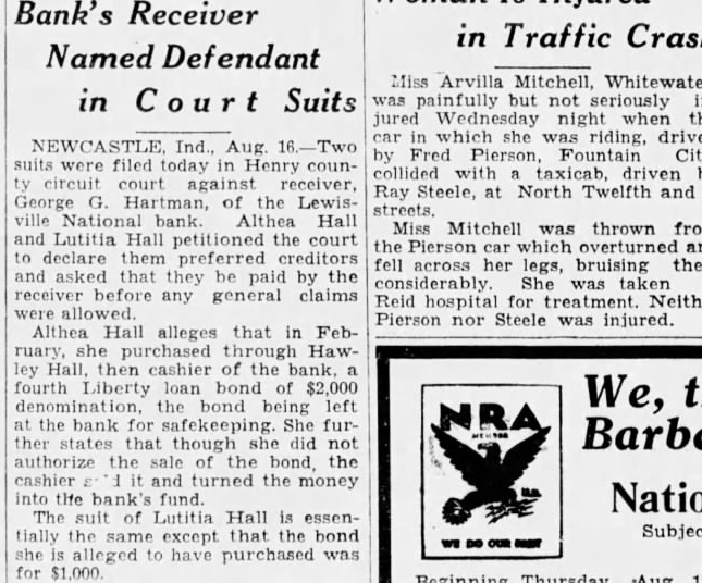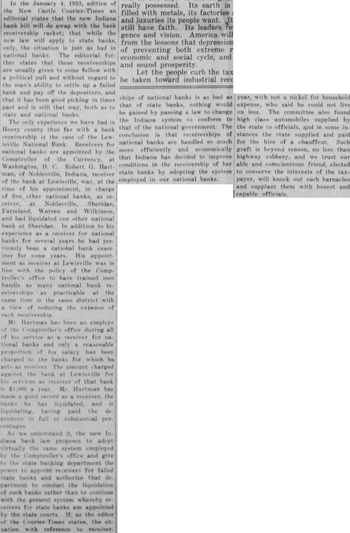 In the January 1933, edition of the New Castle an editorial states that the new Indiana bank bill will do away with the bank receivership racket; that while the law will apply to state only, the situation just as bad national banks. The editorial ther states that these receiverships are usually given to some fellow with political pull and without regard to the man's ability to settle up failed bank and pay off the depositors, and that has been good picking in times past and still that both state and national banks. The only experience we have had Henry county thus far with bank receivership the case of the Lewisville National Receivers for national banks are appointed by the Comptroller of the Currency, Washington, Robert man, of Noblesville, Indiana, receiver the bank at Lewisville, was, at the time his appointment, in charge five other national banks, at Noblesville, Sheridan, Farmland, Warren and Wilkinson, and had liquidated one other national bank at Sheridan. In addition to his experience receiver for national banks several years he had viously been national bank exam iner for some years. His appoint ment as receiver at Lewisville line with the policy of the Comp. troller's office to have trained men handle as many national bank ceiverships as practicable the same time in the same district with view of reducing the expense receivership. Mr. Hartman been an employe the Comptroller's office during all his service receiver for tional banks and only reasonable proportion of his salary has been charged to the banks for which receiver The amount charged against the bank for services as receiver of that bank year. Mr. Hartman has made good record receiver, the banks he has liquidated, and liquidating, having paid the positors full or substantial centages. As understand the new diana bank law proposes to adopt virtually the same system employed the Comptroller's office and give the state banking department the power appoint receivers for failed state banks and authorize that partment to conduct the liquidation such banks rather than to continue with the present system whereby ceivers for state banks are appointed the state as the editor the states, the uation with reference to receiver- ships of national banks is bad that of state nothing would be gained by passing law change the Indiana system to conform to that of the national government. The conclusion is that receiverships of national banks are handled much efficiently and economically more that Indiana has decided to improve conditions in the receivership of her state banks by adopting the system employed in our national banks. year, with not nickel for household expense, who said he could not live less. The committee also found high class automobiles supplied by the state officials, and in insome stances the state supplied and paid for the hire of chauffeur. Such graft beyond reason, no less than highway robbery, and we trust our able and conscientious friend, elected to conserve the interests of the taxpayer, will knock out such barnacles and supplant them with honest and capable officials.
