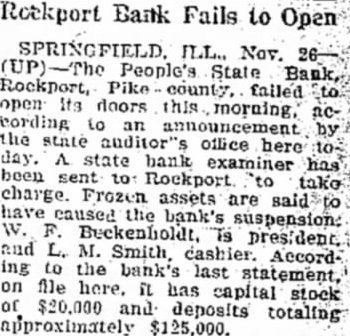 Rockport Bank Fails to Open People's State Bank, Rockport, Pike county, failed to: open Its doors this morning, nccording to an announcement by the state auditor"s office here today. A state bank examiner has been sent to: Rockport to take charge. Frozen assets are said to have caused the bank's suspension: W. F. Beckenholdt. is president. and L. M. Smith cashier. According to the bank's last statement, on file here. it has capital stock of $20.000 and deposits totaling approximately $125,000.
