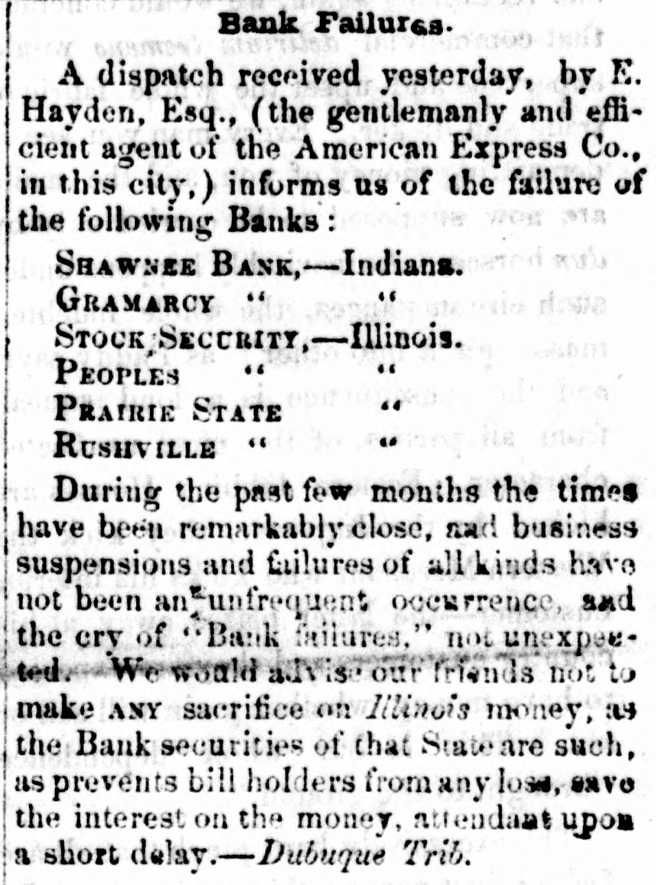 The Bank Pan ic. In regard to the Bank Failures a brief note of which appeared in our paper of yesterday, the probabilities are that the excitement will soon pass over and the notes of the discredited banks enjoy the same confidence as formerly. Of this panic the Democratic Press (Chicago) of Saturday thus speaks: "Dispatches were received here yesterday from New York by one of our Banking Houses, ansouncing that the New York brokers had thrown out the notes of the Gramercy Bank, Ind., Shawnee Bank of Attica, Ind., and the Zimmerman Bank, Canada. As a consequence the notes of the same institution were thrown out here. It is reunored that the same parties who own the Gramercy Bank of Indiana are also the owners of the People's Bank of Carmi, the Prairie State Bank, and the Rushville Bank, all of Illinois, which rumor induced some of the banks of this City to throw out the notes of the above named Illinois institutions yesterday. The Stock Security Bank at Danville, has among its securities $58,000 in California bonds. The Supreme Court of that State having recently decided that those bonds are illegal, some of our brokers, yesterday, refused to receive the bills of the Stock Security on deposit. The People's Bank, at Carmi, is secured by a deposit of the following State stocks: $15,000, Virginia ; $218,000, Missouri; $238000, Louisiana and $29,000 Tennessee. Total securities $500,000. Circulation $464, 515. The Rushville Bank has the following basis of circulation : $88,000, Missouri; $43,500, Louisiana. Total securities $81,500. Circulation $78,300 The following are the bonds pledged by the arity Bank, of Danville: Stock Sec. $55,000, V. orginia; 90, California; 82,000, Missouri; 15,000, Tennes- 45,000, Louisiana 58,00 see. Circulation $183,000. Total securities $200, 470. There was a movement on foot among our bankers yesterday, which we ha've reason to beliere will go far toward, if not eL tirely, restorThere is ing these four banks to sound credit. no reason why this may not be done with all of them except the Stock Security Bank, Dan Fille. As regards the latter if the owners replace the California stocks, with others that are good, or will promptly cancel them, its issues will cer tainly be as good as the average of Illinois Banks. Our advice to the holders of notes on the above banks is to keep perfectly cool, and submit to NO shave. We hope to be able very soon to quote their notes as good at the counters of our Chicago banks. In the meanwhile let our State Legislature proceed cautiously, yet firmly, to make such amendments of our general banking law as oxperience has demonstrated to be necessary.