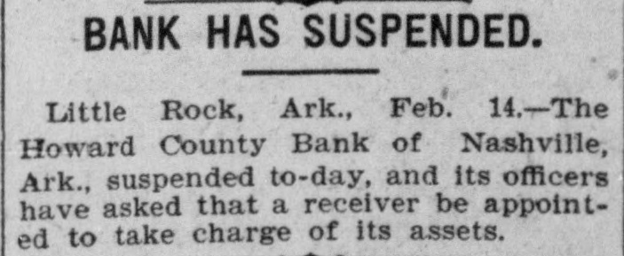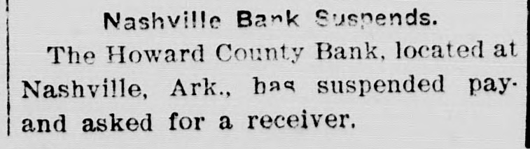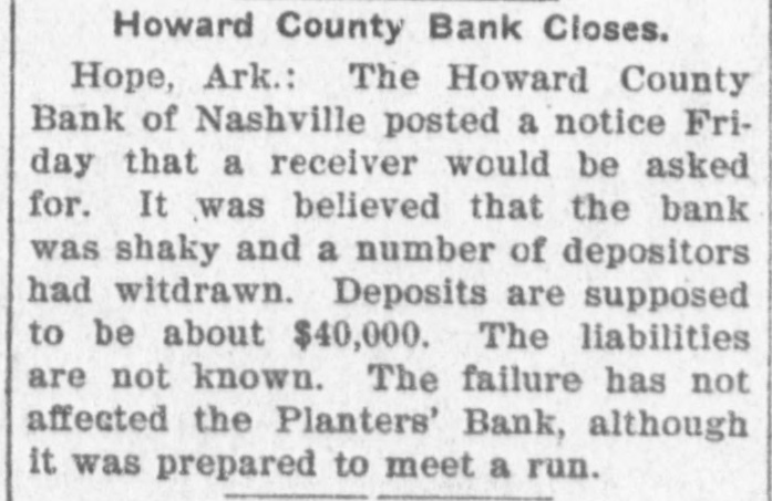 Howard County Bank Closes. Hope, Ark.: The Howard County Bank of Nashville posted a notice Friday that a receiver would be asked for. It was believed that the bank was shaky and a number of depositors had witdrawn. Deposits are supposed to be about $40,000. The liabilities are not known. The failure has not affected the Planters' Bank, although it was prepared to meet a run.