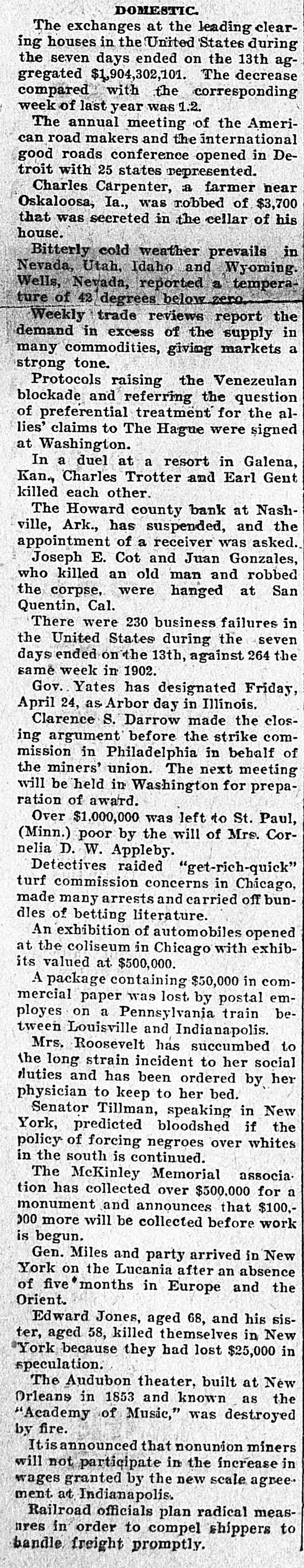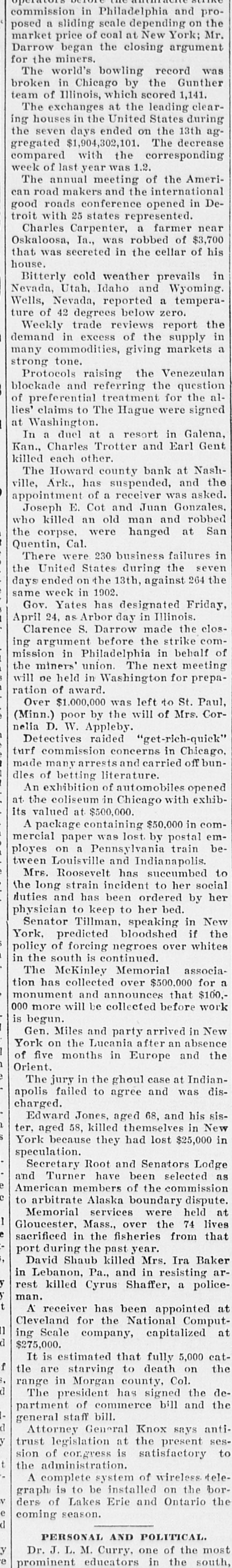 Darrow began the closing argument for the miners. The world's bowling record was broken in Chicago by the Gunther team of Illinois, which scored 1,141. The exchanges at the leading clearing houses in the United States during the seven days ended on the 13th ag-+ gregated $1,904,302,101. The decrease compared with the corresponding week of last year was 1.2. The annual meeting of the American road makers and the international good roads conference opened in Detroit with 25 states represented. Charles Carpenter, a farmer near Oskaloosa, Ia., was robbed of $3,700 that was secreted in the cellar of his house. Bitterly cold weather prevails in Nevada, Utah, Idaho and Wyoming. Wells, Nevada, reported a temperature of 42 degrees below zero. Weekly trade reviews report the demand in excess of the supply in many commodities, giving markets a strong tone. Protocols raising the Venezeulan blockade and referring the question of preferential treatment for the allies' claims to The Hague were signed at Washington. In a duel at a resort in Galena, Kan., Charles Trotter and Earl Gent killed each other. The Howard county bank at Nashville, Ark., has suspended, and the appointment of a receiver was asked. Joseph E. Cot and Juan Gonzales, who killed an old man and robbed the corpse, were hanged at San Quentin, Cal. There were 230 business failures in the United States during the seven days ended on the 13th, against 264 the same week in 1902. Gov. Yates has designated Friday, April 24, as Arbor day in Illinois. Clarence S. Darrow made the closing argument before the strike commission in Philadelphia in behalf of the miners' union. The next meeting will be held in Washington for preparation of award. Over $1,000,000 was left to St. Paul, (Minn.) poor by the will of Mrs. Cornelia D. W. Appleby. Detectives raided "get-rich-quick" turf commission concerns in Chicago, made many arrests and carried off bundles of betting literature. An exhibition of automobiles opened at the coliseum in Chicago with exhibits valued at $500,000. A package containing $50,000 in commercial paper was lost by postal employes on a Pennsylvania train between Louisville and Indianapolis. Mrs. Roosevelt has succumbed to the long strain incident to her social duties and has been ordered by her physician to keep to her bed. Senator Tillman, speaking in New York, predicted bloodshed if the policy of forcing negroes over whites in the south is continued. The McKinley Memorial association has collected over $500.000 for a monument and announces that $100,000 more will be collected before work is begun. Gen. Miles and party arrived in New York on the Lucania after an absence of five months in Europe and the Orient. The jury in the ghoul case at Indianapolis failed to agree and was discharged. Edward Jones, aged 68, and his sister, aged 58, killed themselves in New York because they had lost $25,000 in speculation. Secretary Root and Senators Lodge and Turner have been selected as American members of the commission to arbitrate Alaska boundary dispute. Memorial services were held at Gloucester, Mass., over the 74 lives sacrificed in the fisheries from that port during the past year. David Shaub killed Mrs. Ira Baker in Lebanon, Pa., and in resisting arrest killed Cyrus Shaffer, a policeman. A receiver has been appointed at Cleveland for the National Computing Scale company, capitalized at $275,000. It is estimated that fully 5,000 cattle are starving to death on the range in Morgan county, Col. The president has signed the department of commerce bill and the general staff bill. Attorney General Knox says antitrust legislation at the present session of congress is satisfactory to the administration. A complete system of wireless telegraph is to be installed on the borders of Lakes Erie and Ontario the coming season. PERSONAL AND POLITICAL