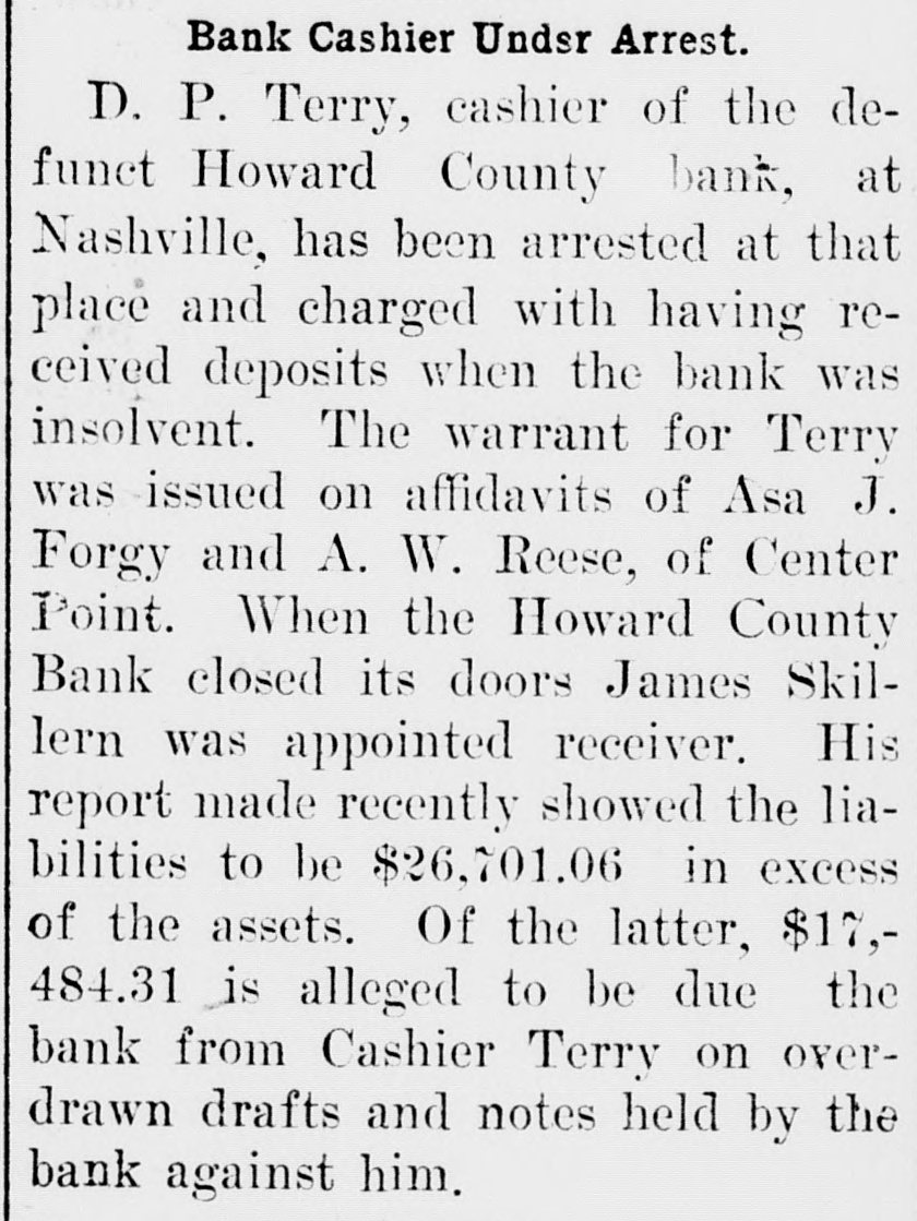 Bank Cashier Undsr Arrest. D. P. Terry, cashier of the defunct Howard County bank, at Nashville, has been arrested at that place and charged with having received deposits when the bank was insolvent. The warrant for Terry was issued on affidavits of Asa J. Forgy and A. W. Reese, of Center Point. When the Howard County Bank closed its doors James Skillern was appointed receiver. His report made recently showed the liabilities to be $26,701.06 in excess of the assets. Of the latter, $17,484.31 is alleged to be due the bank from Cashier Terry on overdrawn drafts and notes held by the bank against him.