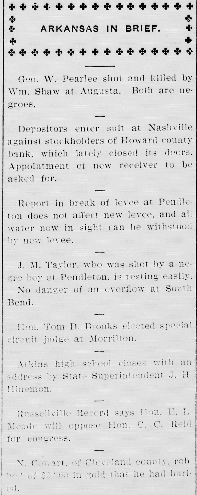 ARKANSAS IN BRIEF. Geo. W. Pearlee shot and killed by Wm. Shaw at Augusta. Both are negroes. Depositors enter suit at Nashville against stockholders of Howard county bank. which lately closed its doors. Appointment of new receiver to be asked for. Report in break of levee at Pendleton does not affect new levee, and all water now in sight can be withstood by new levee. J. M. Taylor. who was shot by a negre boy at Pendleton. is resting easily. No danger of an overflow at South Bend. Hon. Tom D. Brooks elected special circuit judge at Morrilton. -Atkins high school closes with an address by State Superintendent J. H. Hinemon. Russellville Record says Hon. U. L. Meade will oppose Hon. C. C. Reid for congress. V. Cowart. of Cleveland county, rob be of $2.00 in gold that he had buried.