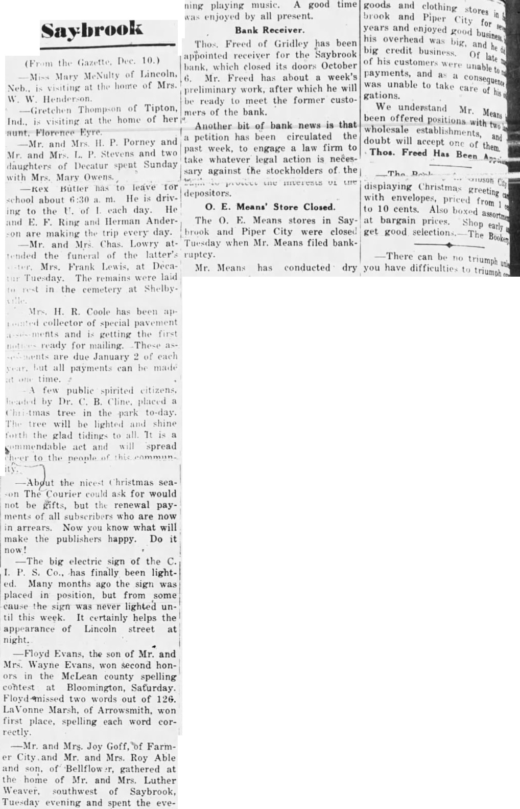 O. E. Means' Store Closed. The O. E. Means stores in Saybrook and Piper City were closed Tuesday when Mr. Means filed bankruptey. There can be no triumph Mr. Means has conducted dry you have difficulties to triumph
