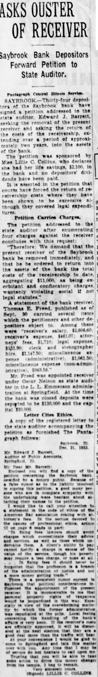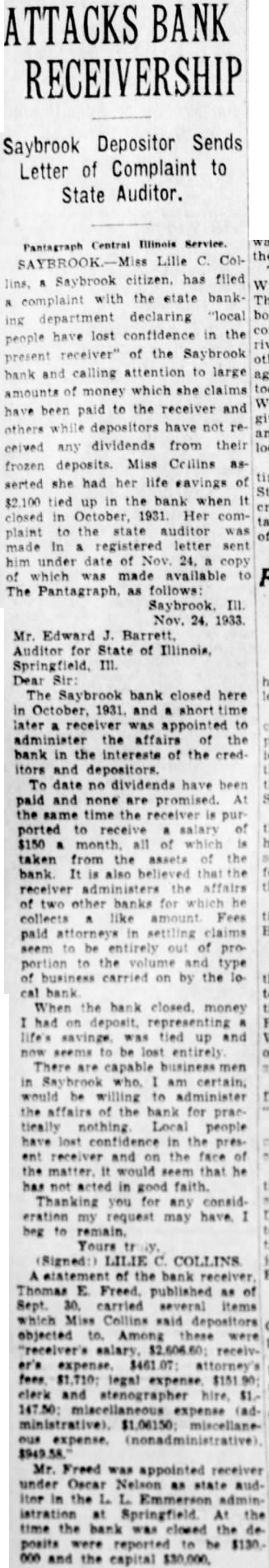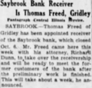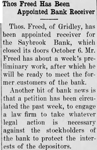 Thos Freed of Gridley has been appointed receiver for the Saybrook bank. which closed its doors October 6. Mr. Freed has about week's preliminary work, after which he will be ready to meet the former customers of the bank.