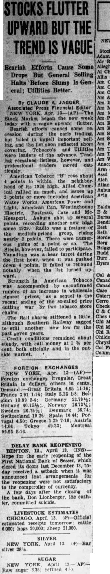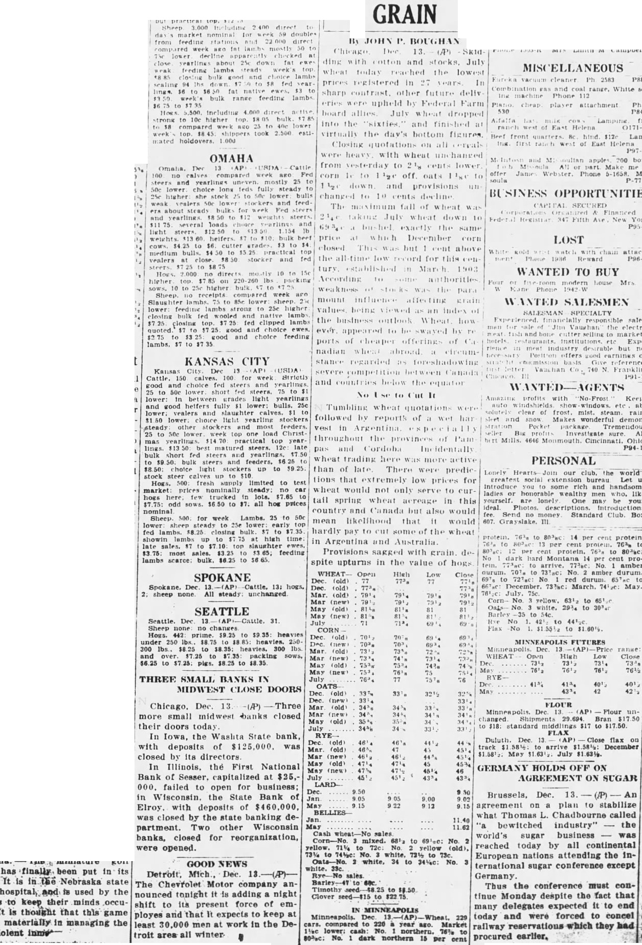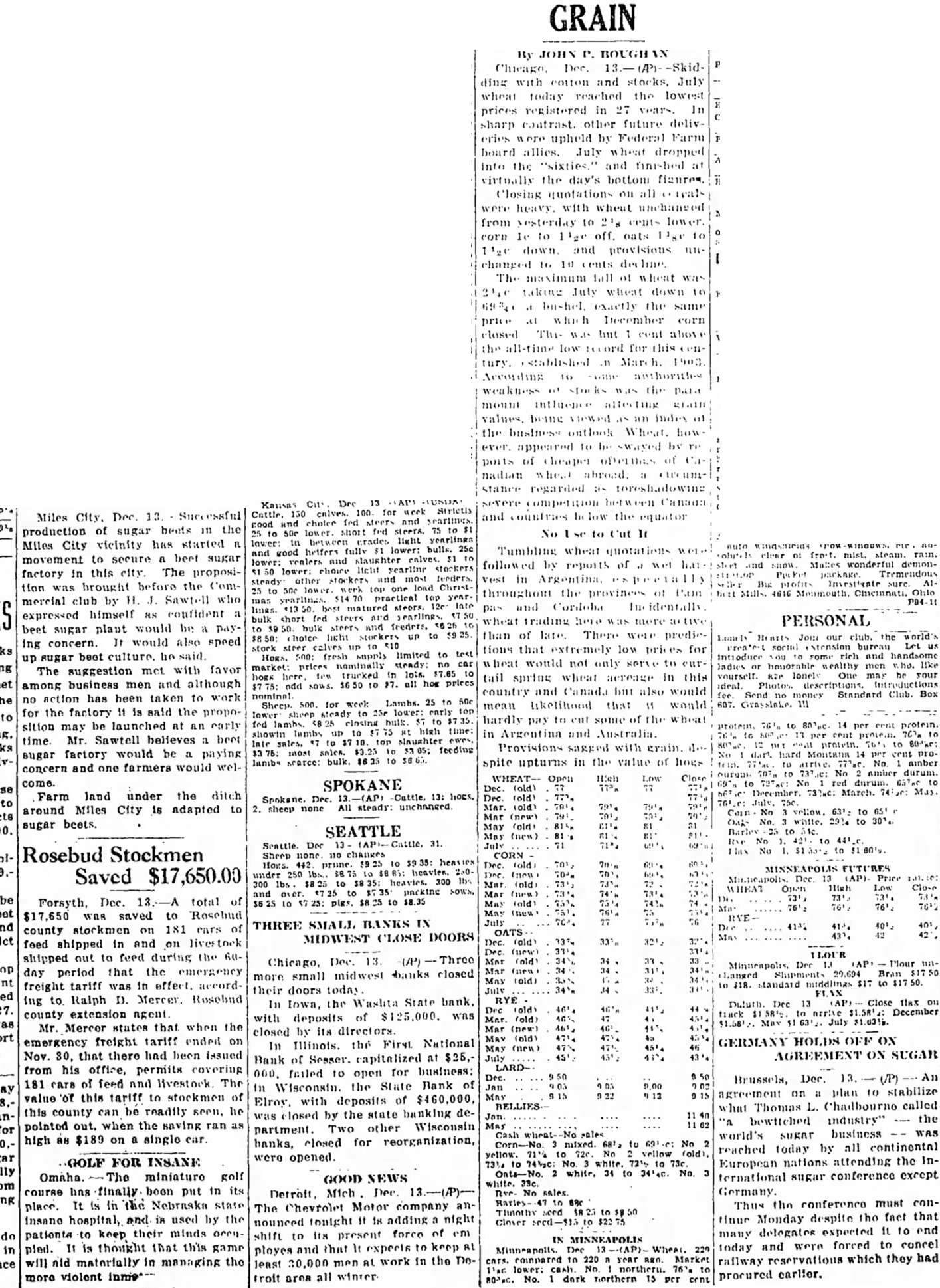 GRAIN By JOHN P. BOUGH Dec. -Skidding and July wheat today reached the lowest prices registered in 27 In sharp contrast. other future delivwere upheld by Federal Farm allies. July dropped into the "sixties." and finished virtnally the day's bottom figures. Closing heavy. with whent from yesterday to cents lower. corn to off. onts 10 down. and changed 10 10 cents taking wheat down bushel exactly same price December corn closed The but cent low for tury. According authorities mount ever. appeared to swayed by of of nadian abroad. stance regarded toreshadowing Canada and countries be the equator Miles Dec. 13. production of sugar beets in the Miles City vicinity started movement to secure a beet sugar factory this The proposition was brought before the Commercial club by Sawtell who expressed himself as confident beet sugar plant would be DAY ing concern. would also speed up sugar beet culture. said. The suggestion met with favor among business men and although no action has been taken to work for the factory is said the proposition may be launched at an early time. Mr. Sawtell believes beet sugar factory would be paying concern and one farmers would welcome. Farm land under the ditch around Miles City 16 adapted to sugar beets. 100. lower. light 25c and lower: choice Christpractical top matured bulk short fed light 500: fresh limited to market: prices naminally trucked all hos 500. for week Lambs. fed time: sales. feeding sales. lumbs to Cut SPOKANE 13: Dec. 2. sheep All THREE SMALL BANKS IN MIDWEST CLOSE DOORS Chicago. Dec. 13. more small midwest banks closed their doors today In Iowa, the Washta State bank. with deposits of $125,000. was closed by its directors In Illinois. the First National Bank of Sesser. capitalized at $25,000. failed to open for business: in Wisconsin. the State Bank of Elroy. with deposits of $460,000, was closed by the state banking department. Two other Wisconsin hanks, closed for reorganization, were opened. GERMANY HOLDS OFF ON AGREEMENT ON SUGAR GOOD NEWS Detroit. Mich Dec. The Chevrolet Motor company announced tonight 18 adding night shift to its present force of em playes and that It expects to keep least 30,000 men AL work in the Do- MINNEAPOLIS compared to Market lower: northern. No. northern Brussels, Dec. 13. (/P) An agreement on plan 10 stabilize what Thomas L. Chadbourno called bewttched industry" the world's SURRE business WAS reached today by all continental European nations attending the International sugar conference except Germany. Thus the conference must continur Monday despite the fact that many delegates expected It to end today and were forced to concel railway reservations which they had procured Tumbling wheat quotations followed by reports of wet wonderful Investigate throughout the provinces of Pain 4616 Ohio pas Cordoba identally wheat trading more PERSONAL than of late. There were predicJoin our tions that extremely low prices for handsome wheat would not only serve to ladies honorable tail spring wheat acreage in this yourself. ideal. country and Canada but also would Club. Box Send Standard mean likelihood that would hardly pay to cut some the wheat protein. protein. in Argentina and Australia. protein. Provisions with grain. hard Montana spite upturns in the value of hogs durum. Open Low May SEATTLE No Cattle. 31. CORN FUTURES 250 (AP). Price WHEAT OATS Dec May RYE Dec Close December (new) LARDJan yellow. white. sales