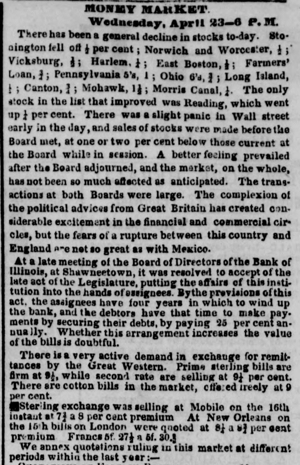 MONEY MARKET. Wednesday, April 23-6 P.M. There has been a general decline in stocks to-day. Sto. nington fell off & per cent Norwich and Worcester, 1; Vicksburg, 1; Harlem, 1; East Boston, 1: Farmers' Loan, 3; Pennsylvania 5's, 1 ; Ohio 6's, 1; Long Island, t ; Canton, 1; Mohawk, 1}; Morris Canal, 1. The only stock in the list that improved was Reading, which went up I per cent. There was a slight panic in Wall street early in the day, and sales of stocks were made before the Board met, at one or two per cent below those current at the Board while in session. A better feeling prevailed after the Board adjourned, and the market, on the whole, has not been so much affected as anticipated. The transactions at both Boards were large. The complexion of the political advices from Great Britain has created considerable excitement in the financial and commercial circles, but the fears of a rupture between this country and England are net so great as with Mexico. At a late meeting of the Board of Directors of the Bank of Illinois, at Shawneetown, it was resolved to accept of the late act of the Legislature, putting the affairs of this institution into the hands of reseignees. Bythe provisions of this act. the assignees have four years in which to wind up the bank, and the debtors have that time to make pay. ments by securing their debts, by paying 25 per cent annually. Whether this arrangement increases the value of the bills is doubtful. There is a very active demand in exchange for remittances by the Great Western. Prime sterling bills are firm at 91, while second rate are selling at 9t per cent. There are cotton bills in the market, offered fireely at 9 per cent. Sterling exchange was selling at Mobile on the 16th instant at 73 a 8 per cent premium At New Orleans on the 15th bills on London were quoted at st a of per cent premium Francs 5f. 27 a 5f. 30.3 We annex quotations ruling in this market at different periods within the last year:-