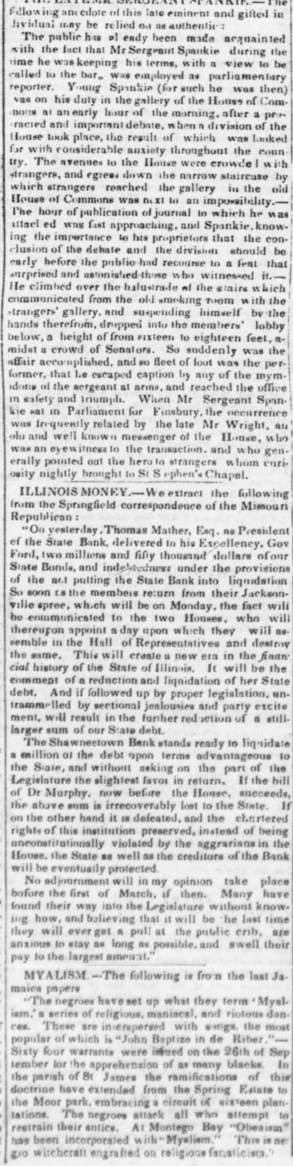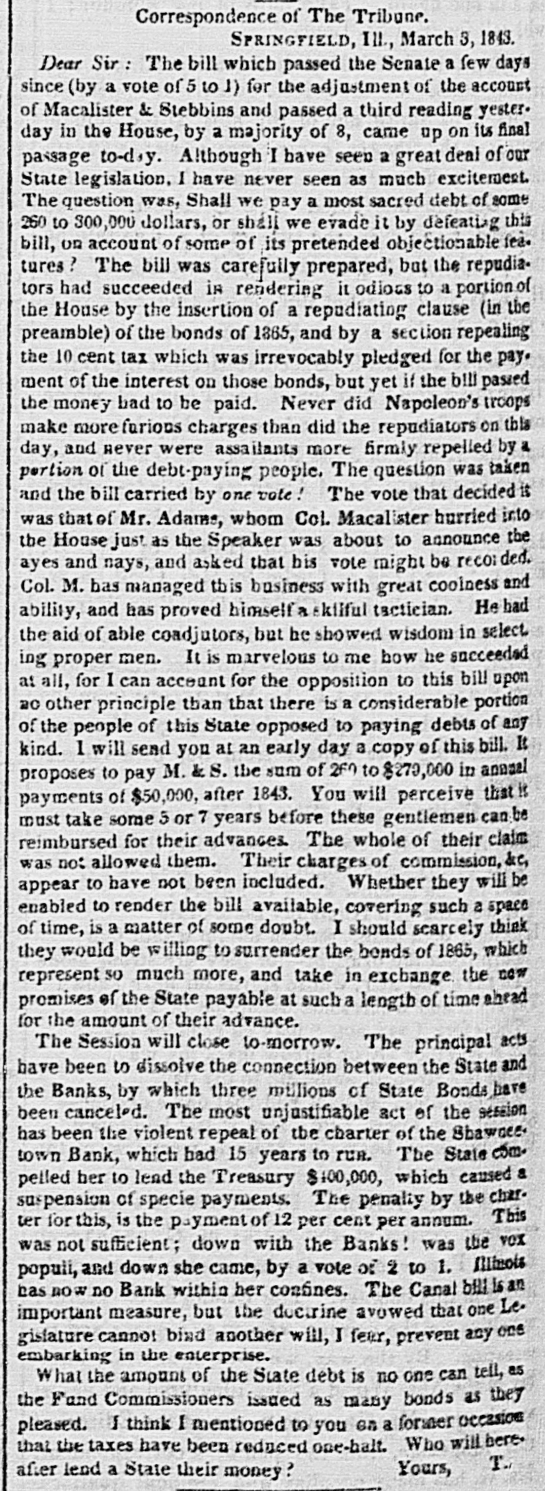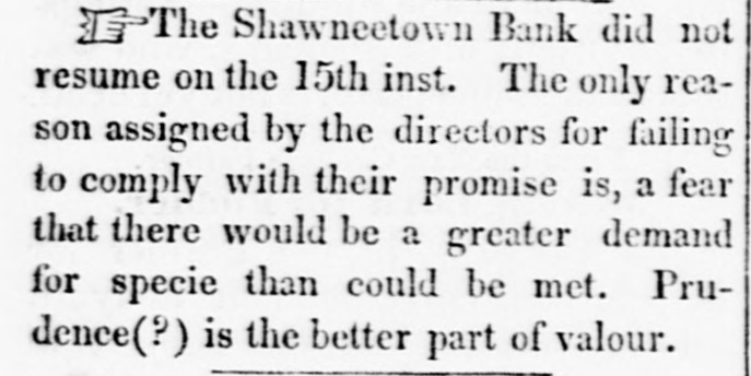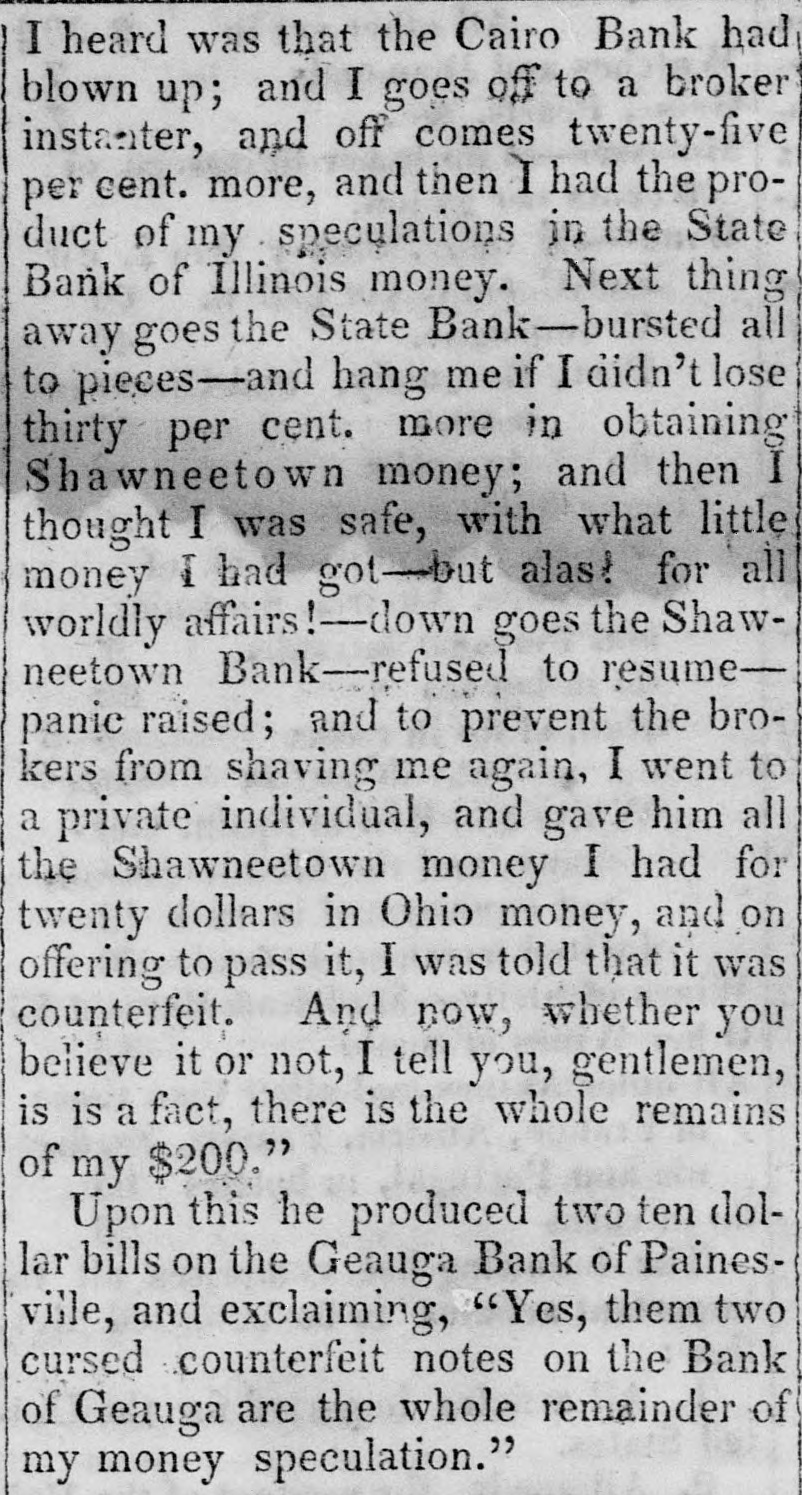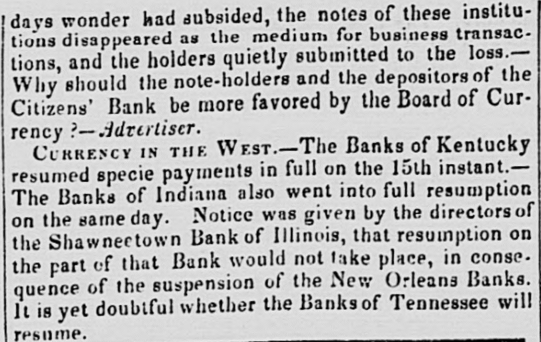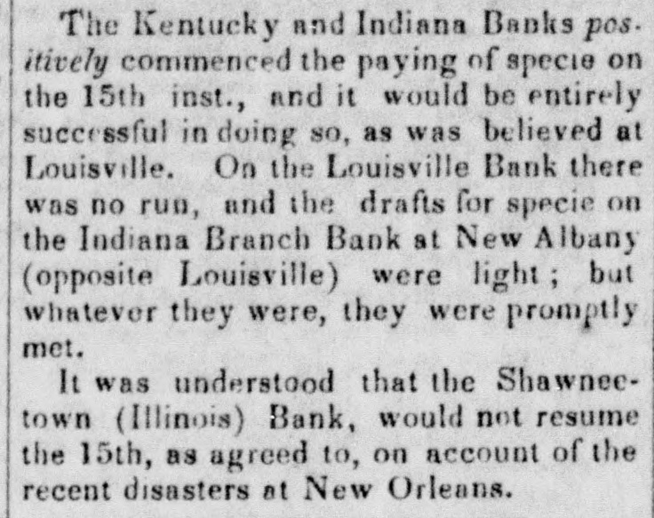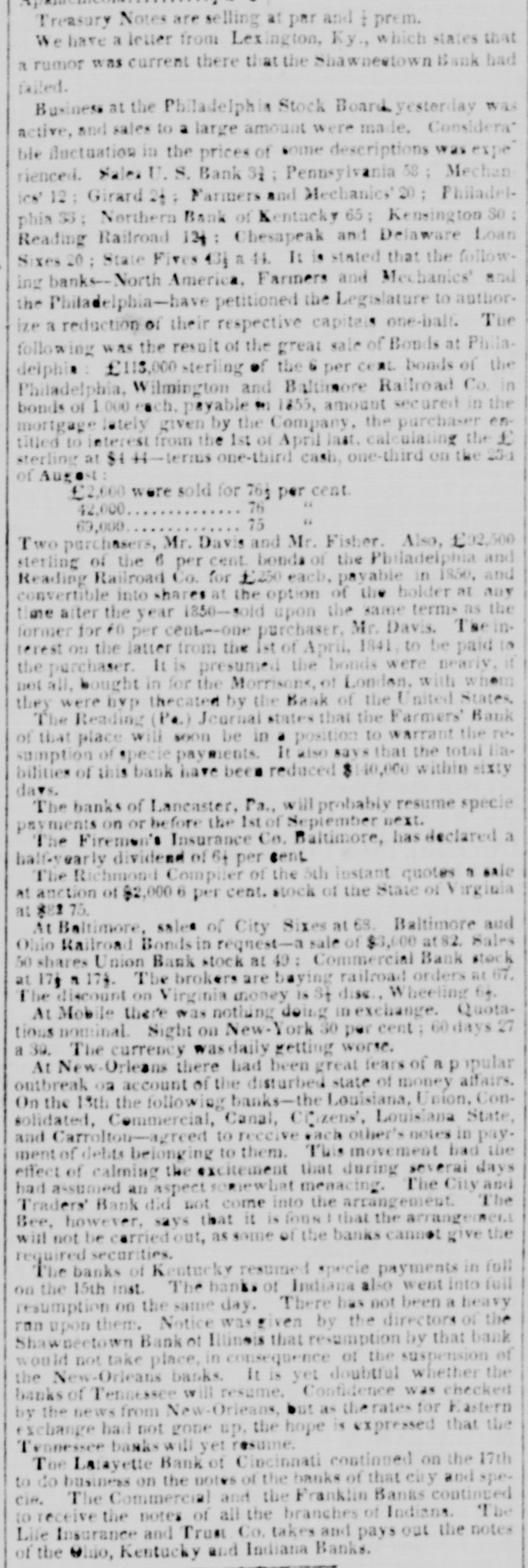 doing any business. and as its charter expires in 1845, it is, by the provisions of the bill, utterly wound up." The Cashier of the Mobile Branch has given notice that the Bank would not receive any money on deposit, or any notes or bills for collection: and all personshaving either in Bank have been requested to withdraw the same. We understand that a member of the new Board, being uscomfortably 'short' OR Friday, was unable to fulfill his contracts. much to the dismay of the Bourse.' What was the result we do not know, but believe matters were compromised. Spanish Scrip to the amount of over $21,000 will be sold at the Exchange on Monday, 20th inst. The Madison County Bank has designated the New-York State Bank of the City of Albany as its agent for the redemption of its notes. The bill to reduce the capital stock of the Mechanics and Manufacturers' Bank of. Trenton passed the Council of N. Jersey on Wednesday. The bill to repeal certain bank charters was also passed, after exempting the Plainfield Bank, and the Mechanics and Manufacturer' Bank of Pat erson, from its provisions. Our favorite Monmouth, therefore, which had as many lives as a cat, having suspended and resumed at least three times during :be past week, is now entirely and dompletely defunct. We are afraid our neighbor of the Sun has burnt his fingers again in this CORcern. Not long since be bought half the Bank for $5,000, of which $2,000 he paid in cash, was to pay $1,000 on the 18th Feb., and $2,000 at some future day. He was elected a-Director, and his brother Cashier; and be received an accommedation discount of $5,000, which be was to put in circulation, and keep funds at the agency sufficient to redeem. This arrangement went on for a while, when the movements of the Legislature becoming somewhat alarm. ing, our financier began to push out his notes without providing for their redemption, and in this way got out some $800. We should think, with his experiments in Jacksonville, Ulster, Malone, Monmouth, and, we understand, Union Bank of Dover, that our neighbor would have become convinced that the science of finance is not just his forte; and although as motorious, he is not quite as celebrated as the Rothschilds or the Barings. A New-York correspondent of the Cincinnati Republican states that the largest portion of the balance of the twelve million loan, recently taken by John Ward & Co. was for West India account, through the Bank of St. Thomas, which has an agent here. We had not heard this mentioned in the street, but it may be correct. The following sales were made at Boston: 25 shares of Boston and Worcester Railread, it a 91 adv ; 45 do Boston and Maine Railroad, $84.1 a 85 pr shr; 15 do Eastern Rail. road, 004 a 91 pr slir; do Western Railroad 481 pr shr; 15 do Merchants' Bank, 14 adv; 3 do Shoe and Leather Dealers Bank, 993 pr shr. The Chillicothe Bank is now redeeming its notes by givIng Eastern exchange at 21 per cent premium. Four or five bills have been or will be introduced is the Illinois Legislature for winding up the Shawneetown Bank. A letter from Frankfort in the Louisville Gazette says"I am very happy to state that the decided impression in Frankfort now is that no valuation law or Commonwealth Bank is likely to succeed. The offer of our Banks to ex. tend their circulation, it is thought, will be accepted." The Editor of the Journal thinks there will be a Bank: and his regular Frankfort correspondent says: "The Safety Fund Bank bill passed to its third reading to-day, by a majority of five, having been so amended as to make the loans run six months instead of four. It will undoubtedly pass the House, and I fear the Senate will also pass it" The Merchants' Fire Insurance Company of Baltimore has declared a half yearly dividend of 5 per cent.