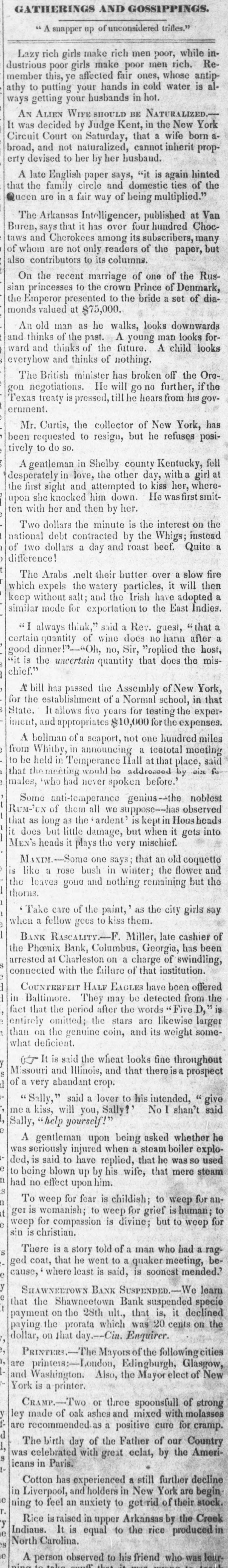 GATHERINGS AND GOSSIPPINGS. A snapper up of unconsidered trifles." Lazy rich girls make rich men poor, while industrious poor girls make poor men rich. Remember this, ye affected fair ones, whose antipathy to putting your hands in cold water is always getting your husbands in hot. AN ALIEN WIFE SHOULD BE NATURALIZED.It was decided by Judge Kent, in the New York Circuit Court on Saturday, that a wife born abroad, and not naturalized, cannot inherit property devised to her by her husband. A late English paper says, "it is again hinted that the family circle and domestic ties of the Queen are in a fair way of being multiplied." The Arkansas Intelligencer, published at Van Buren, says that it has over four hundred Choctaws and Cherokees among its subscribers, many of whom are not only readers of the paper, but also contributors to its columns. On the recent marriage of one of the Russian princesses to the crown Prince of Denmark, the Emperor presented to the bride a set of diamonds valued at $75,000. An old man as he walks, looks downwards and thinks of the past. A young man looks forward and thinks of the future. A child looks everyhow and thinks of nothing. The British minister has broken off the Oregon negotiations. He will go no further, if the Texas treaty is pressed, till he hears from his government. Mr. Curtis, the collector of New York, has been requested to resign, but he refuses positively to do so. A gentleman in Shelby county Kentucky, fell desperately in love, the other day, with a girl at the first sight and attempted to kiss her, whereupon she knocked him down. He was first smitten with her and then by her. Two dollars the minute is the interest on the national debt contracted by the Whigs; instead of two dollars a day and roast beef. Quite a difference! The Arabs ,nelt their butter over a slow fire which expels the watery particles, it will then keep without salt; and the Irish have adopted a similar mode for exportation to the East Indies. always think," said a Rev. guest, " that a certain quantity of wine does no harm after a good dinner!"--"Oh, no, Sir, "replied the host, "it is the uncertain quantity that does the mischief." A' bill has passed the Assembly of New York, for the establishment of a Normal school, in that State. It allows five years for testing the experiment, and appropriates $10,000 for the expenses. A bellman of a seaport, not one hundred miles from Whitby, in announcing a teetotal meeting to be held in Temperance Hall at that place, said that the meeting would be addressed by DIN fo males, who had never spoken before. Some anti-temperance genius--the noblest RUM-UN of them all we suppose-has observed that as long as the ardent is kept in Hogsheads it does but little damage, but when it gets into MEN'S heads it plays the very mischief. MAXDI-Som one says; that an old coquetto is like a rose bush in winter; the flower and the leaves gone and nothing remaining but the thorns. Take care of the paint," as the city girls say when a fellow gees to kiss them. BANK RASCALITY.-F Miller, late cashier of the Phoenix Bank, Columbus, Georgia, has been arrested at Charleston on a charge of swindling, connected with the failare of that institution. COUNTERFEIT HALF EAGLES have been offered in Baltimore. They may be detected from the fact that the period after the words Five D," is entirely omitted; the stars are likewise larger than on the genuine coin, and its weight somewhat deficient. (3) is said the wheat looks fine throughout Missouri and Illinois, and that thereis a prospect of a very abandant crop. "Sally," said a lover to his intended, " give No shan't said me kiss, will you, Sally? Sally,"help yourself!" A gentleman upon being asked whether he a steam is said to have was so to blown mere was ded, being seriously injured up by replied, when his wife, that that he boiler explo- steam used had no effect upon him. To weep for fear is childish; to weep for anger is womanish; to weep for grief is human; to weep for compassion is divine; but to weep for sin is christian. There is a story told of a man who had a ragged coat, that he went to a quaker meeting, because, where least is said, is soonest mended.' SHAWNELTOWN BANK SUSPENDED--Wo learn that the Shawneetown Bank suspended specie payment on the 28th ult., that is, it declined paying the prorata which was 20 cents on the dollar, on that day.--Cin. Enquirer. PRINTERS.-The Mayors of the followingcities are printers:-Londo Edingburgh, Glasgow, and Washington. Also, the Mayor elect of New York is printer. CRAMP.-Two or three spoonsfull of strong ley made of oak ashes and mixed with molasses are recommended as a positive cure for cramp. d The birth day of the Father of our Country was celebrated with great eclat, by the Ameriicans in Paris. Cotton has experienced a still further decline in Liverpool, and holders in New York are begin ie ning to feel an anxiety to get rid of their stock. Rice is raised in upper Arkansas by the Creek y Indians. It is equal to the rice produced in North Carolina. S A person observed to his friend who was lear-