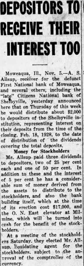 DEPOSITORS RECEIVE THEIR INTEREST Moweaqua, Nov. for the defunct Allsup, First National bank of Moweaqua, and several others, including the Citizens National bank of Shelbyville, yesterday announced here that Thursday of this week on would distribute about $2,000 he to depositors of the Shelbyville stitution, representing interest their deposits from the time of the Feb. 18, 1928, to the date distribution of the dividends of covering the total deposits. Money for Stockholders Mr. Allsup paid three dividends to depositors, two of 25 per cent and of 50 cent. In each one per to these and the interest addition cent he has considerper able of money derived from sum the assets to distribute to the stockholders, and also the bank building itself, which at the time cost $17,000, and of its erection the O. N. East elevator at Milwhich will be turned into mine, benefit of the stockcash for the holders. meeting of the stockholdAt Saturday. they elected Mr. Allliquidating agent for the stockholders. subject to the anof the of the proval comptroller currency.