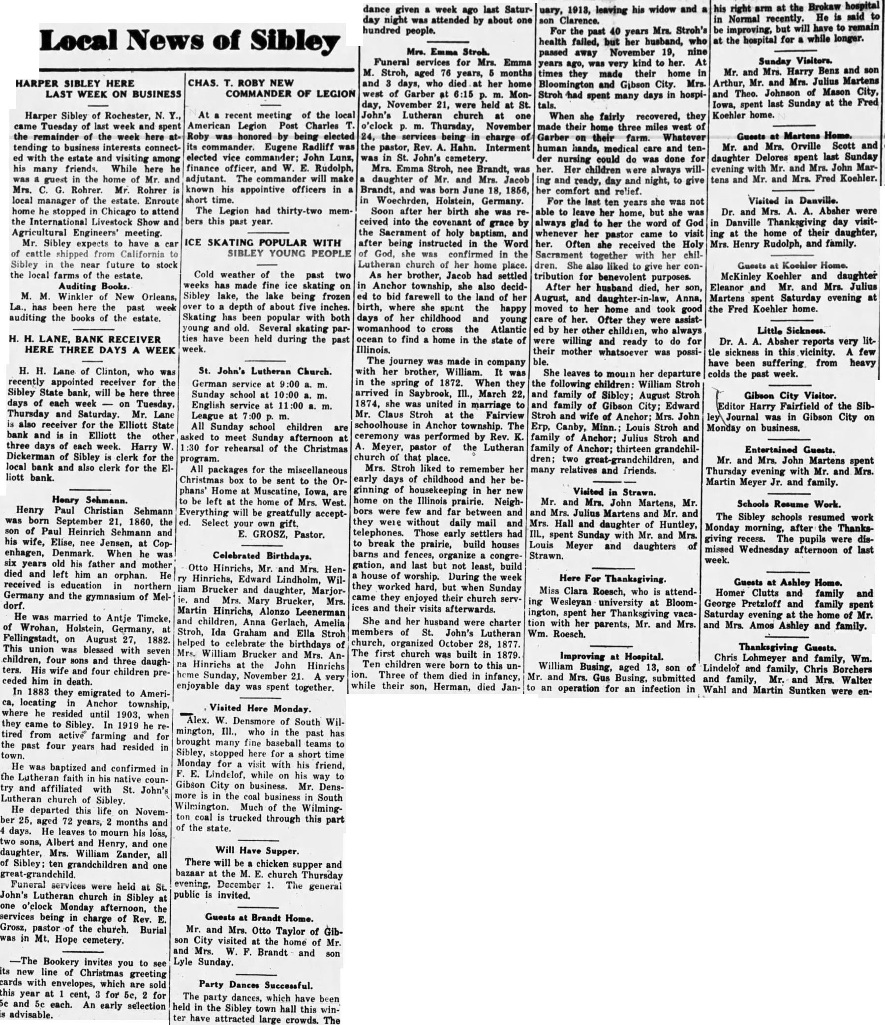 Local News of Sibley HARPER SIBLEY HERE LAST WEEK ON BUSINESS Harper Sibley of Rochester, N. Y., came Tuesday of last week and spent the remainder of the week here at tending to business interests connected with the estate and visiting among his many friends. While here he was guest in the home of Mr. and Mrs. C. G. Rohrer. Mr. Rohrer is local manager of the estate. Enroute home he stopped in Chicago to attend the International Livestock Show and Agricultural Engineers' meeting. Mr. Sibley expects to have a car of cattle shipped from California to Sibley in the near future to stock the local farms of the estate. Auditing Books. M. M. Winkler of New Orleans, La., has been here the past week auditing the books of the estate. H. H. LANE, BANK RECEIVER HERE THREE DAYS A WEEK H. H. Lane of Clinton, who was recently appointed receiver for the Sibley State bank, will be here three days of each week on Tuesday, Thursday and Saturday. Mr. Lane is also receiver for the Elliott State bank and is in Elliott the other three days of each week. Harry W. Dickerman of Sibley is clerk for the local bank and also clerk for the Elliott bank. Henry Sehmann. Henry Paul Christian Sehmann was born September 21, 1860, the son of Paul Heinrich Sehmann and his wife, Elise, nee Jensen, at Copenhagen, Denmark. When he was six years old his father and mother died and left him an orphan. He received is education in northern Germany and the gymnasium of Meldorf. He was married to Antje Timcke, of Wrohan, Holstein, Germany, at Fellingstadt, on August 27, 1882. This union was blessed with seven children, four sons and three daughters. His wife and four children preceded him in death. In 1883 they emigrated to America, locating in Anchor township, where he resided until 1903, when they came to Sibley. In 1919 he retired from active farming and for the past four years had resided in town. He was baptized and confirmed in the Lutheran faith in his native country and affiliated with St. John's Lutheran church of Sibley. He departed this life on November 25, aged 72 years, 2 months and days. He leaves to mourn his loss, two sons, Albert and Henry, and one daughter, Mrs. William Zander, all of Sibley; ten grandchildren and one great-grandchild. Funeral services were held at St. John's Lutheran church in Sibley at one o'clock Monday afternoon, the services being in charge of Rev. E. Grosz, pastor of the church. Burial was in Mt. Hope cemetery. -The Bookery invites you to see its new line of Christmas greeting cards with envelopes, which are sold this year at cent, 3 for 5c, 2 for 5c and 5c each. An early selection is advisable. CHAS. T. ROBY NEW COMMANDER OF LEGION At a recent meeting of the local American Legion Post Charles T. Roby was honored by being elected its commander. Eugene Radliff was elected vice commander; John Lunz, finance officer, and W. E. Rudolph, adjutant. The commander will make known his appointive officers in a short time. The Legion had thirty-two members this past year. ICE SKATING POPULAR WITH SIBLEY YOUNG PEOPLE Cold weather of the past two weeks has made fine ice skating on Sibley lake, the lake being frozen over to a depth of about five inches. Skating has been popular with both young and old. Several skating parties have been held during the past week. St. John's Lutheran Church. German service at 9:00 a. m. Sunday school at 10:00 a. m. English service at :00 a. m. League at 7:00 p. m. All Sunday school children are asked to meet Sunday afternoon at 1:30 for rehearsal of the Christmas program. All packages for the miscellaneous Christmas box to be sent to the Orphans' Home at Muscatine, Iowa, are to be left at the home of Mrs. West. Everything will be greatfully accepted. Select your own gift. E. GROSZ, Pastor. Celebrated Birthdays. Otto Hinrichs, Mr. and Mrs. Henry Hinrichs, Edward Lindholm, William Brucker and daughter, Marjorie, and Mrs. Mary Brucker, Mrs. Martin Hinrichs, Alonzo Leenerman and children, Anna Gerlach, Amelia Stroh, Ida Graham and Ella Stroh helped to celebrate the birthdays of Mrs. William Brucker and Mrs. Anna Hinrichs at the John Hinrichs home Sunday, November 21. A very enjoyable day was spent together. Visited Here Monday. Alex. W. Densmore of South Wilmington, III., who in the past has brought many fine baseball teams to Sibley, stopped here for short time Monday for visit with his friend, F. E. Lindelof, while on his way to Gibson City on business. Mr. Densmore is in the coal business in South Wilmington. Much of the Wilmington coal is trucked through this part of the state. Will Have Supper. There will be chicken supper and bazaar at the M. E. church Thursday evening, December 1. The general public is invited. Guests at Brandt Home. Mr. and Mrs. Otto Taylor of Gibson City visited at the home of Mr. and Mrs. W. F. Brandt and son Lyle Sunday. Party Dances Successful. The party dances, which have been held in the Sibley town hall this winter have attracted large crowds. The dance given a week ago last Saturday night was attended by about one hundred people. Mrs. Emma Stroh. Funeral services for Mrs. Emma M. Stroh, aged 76 years, 5 months and 3 days, who died at her home west of Garber at 6:15 p. m. Monday, November 21, were held at St. John's Lutheran church at one o'clock p. m. Thursday, November 24, the services being in charge of the pastor, Rev. A. Hahn. Interment was in St. John's cemetery. Mrs. Emma Stroh, nee Brandt, was daughter of Mr. and Mrs. Jacob Brandt, and was born June 18, 1856, in Woechrden, Holstein, Germany. Soon after her birth she was received into the covenant of grace by the Sacrament of holy baptism, and after being instructed in the Word of God, she was confirmed in the Lutheran church of her home place. As her brother, Jacob had settled in Anchor township, she also decided to bid farewell to the land of her birth, where she spent the happy days of her childhood and young womanhood to cross the Atlantic ocean to find a home in the state of Illinois. The