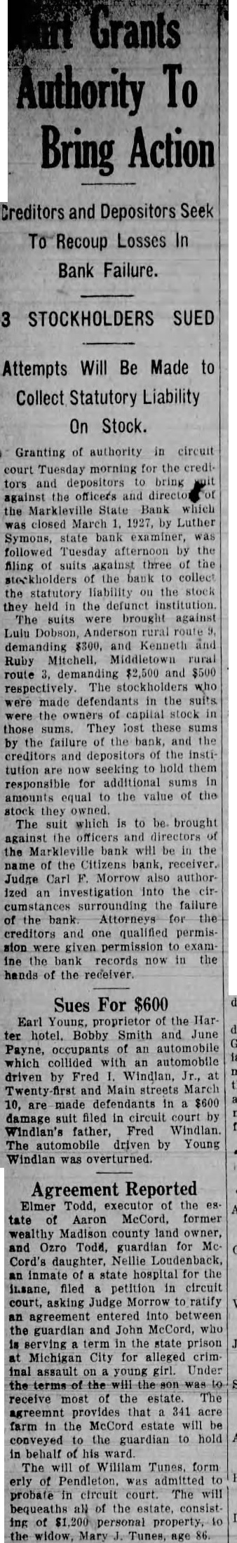 Depositors Guaranteed 65 Percent Doors of Bank Were Closed This Morning By State Banking Officials At Request of Directors of Institution-Citizens Bank of Anderson Agrees To Liquidate Assets of Company Which Listed Deposits of $170,000. The Markleville State Bank, located at Markleville, twelve miles southeast of here, was closed this morning at the request of the directors by Thomas D. Barr, deputy state bank commissioner, assisted by Morris Stults, state bank examiner of this district, and R. H. Wurtemberger, assistant. The Citizens Bank, of Anderson, through its president, Neel M. McCullough, immediately came to the assistance of the depositors, agreeing to take over and liquidate the assets, paying depositors 65 percent cash on demand and the remain- der when and if realized. will be given credit Depositors the Citizens Bank for 65 percent of their total deposits and will call the bank in this city for arranging and get their check their accounts books. Depositors will not make Markleville Bank any more use of checks. Deposits in the Markleville State Bank March were 000. Directors of the Markleville in. stitution are Frank Staley, Charles Hardy, George Rittenour, Quincy Markle. Walter Stohler. Elmer Hardy and Ross B. Ham. STARTED IN 1913. The Markleville- State Bank hebusiness as private bank gan with capital of $10,000 in 1913 under the auspices of Clyde Keach. was changed to state bank in 1918. Ben Keach was president until LWO years ago. The management of the Keaches was unfortuwas at nate Crothersville, Ind., and elsewhere, said. Charles Hardy was installed Frank Staley as cashier two years ago and along directors have made other efforts to retrieve the errors of the former management, Agricultural against the new were and was deemed advisable to take the steps negotiated today through state officials. The state department ask the court to appoint the Citizens Bank liquidating receiver in order conserve without pay the assets deputy sioner, today expressed himself highly gratified the attitude of the directors under the regrettable conditions. especially that the bank conditions in Auderson are such uation which may arise promptly and State bank officials and McCullough were the bank all day. The action in closing institution caused little disturbance around Markleville, is Since the organization of the bank, new building occupy. ing prominent corner in Markle ville has been constructed by the bank occupied this institution. The structure. 73 STOCKHOLDERS. Benjamin Keach. now resident of Chicago and until two years ago cashier the bank, is the largest individual stockholder He is said to be the owner of forty shares the capital stock. There are stockholders in the institution. each from share up to forty Among the heavier stock. holders are Benjamin Keach. ville, and Elnathan Hays, of Sbirley. year ago the capital stock was increased to $25,000 and has since stood at that figure. The face value of the stock $100 per share, but is quoted $135. Stockholdin the bank live Markieville, castle, and Detroit. has been known In banking cles in Anderson for some time that the Markleville bank was in hard lines Excessive loans on farm propof trouble. When real estate and farm property declined in value, out from under bank and left but little substantial foundation on which to base busilisted the bank ness. Assets amount to