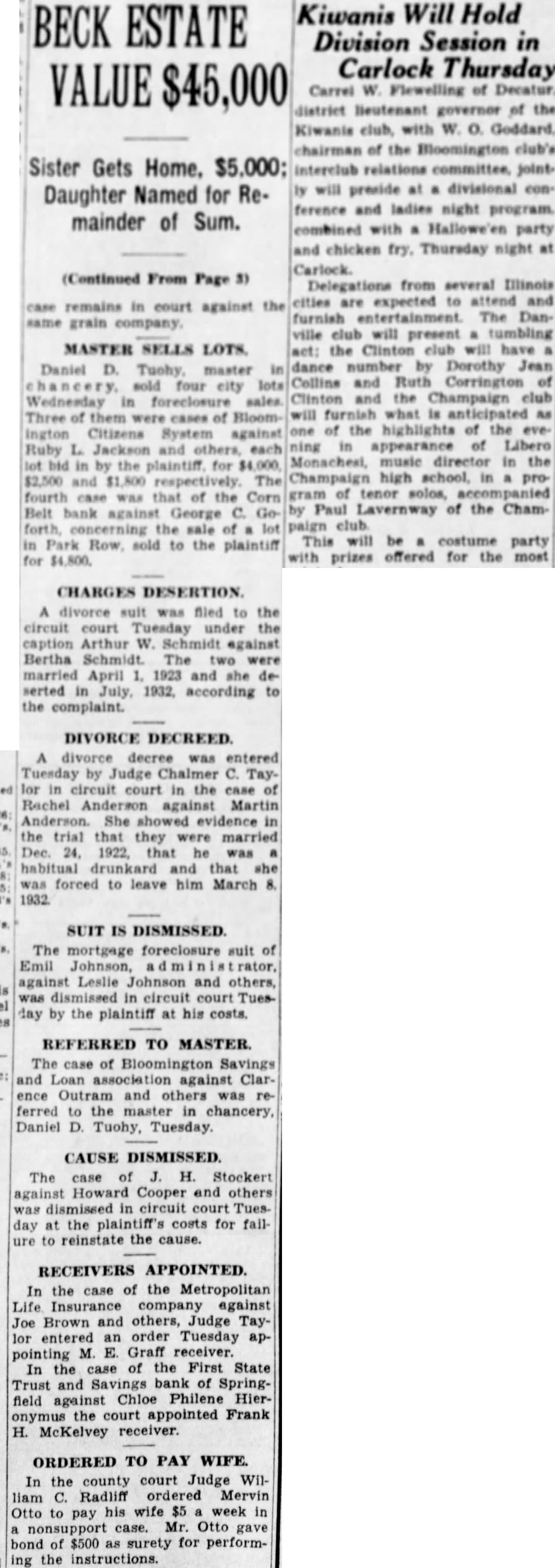 Kiwanis Will Hold BECK ESTATE Division Session in Carlock Thursday VALUE $45,000 Carrel W. Flewelling of Decatur. district governor of the Sister Gets Home. $5,000; relations will preside at divisional Daughter Named for Reference and night mainder of Sum. combined with Hallowe'en party (Continued From Page 3) cities are expected to attend and case remains in court against the furnish The grain MASTER SELLS LOTS. dance number by Dorothy Jean Daniel D. master Collins and Ruth Corrington of sold four city lots Clinton and the Champaign club Wednesday in foreclosure Three of them were cases of Bloom- will furnish what anticipated as one of the highlights of the Citizens System against ning in appearance of Libero Ruby Jackson and each Monachesi, music director in the lot in by the for $2,500 The Champaign high school, in proand that of Corn gram of tenor fourth case was the Belt by Paul Lavernway of the Chambank George C. concerning the sale of lot paign This be costume party in Park sold to the plaintiff with prizes offered for the most for $4,800. CHARGES DESERTION A divorce suit was filed to the circuit court Tuesday under the caption Arthur W. Schmidt against Bertha Schmidt. The two were married April 1. 1923 and she deserted in July, 1932, according to the DIVORCE DECREED A divorce decree was entered Tuesday by Judge Chalmer C. Taylor in circuit court in the case of Rachel Anderson against Martin Anderson. She showed evidence in the trial that they were married Dec. 24, 1922, that he was habitual and that she was forced to leave him March 8. SUIT IS DISMISSED The mortgage foreclosure suit of Emil Johnson, m rator. against Leslie Johnson and others, was dismissed in circuit court Tuesday by the plaintiff at his costs. REFERRED TO MASTER. The case of Bloomington Savings and Loan Clarence Outram and others was referred to the master in chancery, Daniel D. Tuohy, Tuesday. CAUSE DISMISSED. The case of J. H. Stockert against Howard Cooper and others was dismissed in circuit court Tuesday at the plaintiff's costs for failure to reinstate cause. RECEIVERS APPOINTED. In the case of the Metropolitan Life Insurance company against Joe Brown and others, Judge Taylor entered an order Tuesday appointing M. E. Graff receiver. In the case of the First State Trust and Savings bank of Springfield against Chloe Philene Hieronymus the court appointed Frank H. McKelvey receiver. ORDERED TO PAY WIFE. In the county court Judge William C. Radliff ordered Mervin Otto to pay his wife $5 week in a nonsupport case. Mr. Otto gave bond of $500 as surety for performing the instructions.