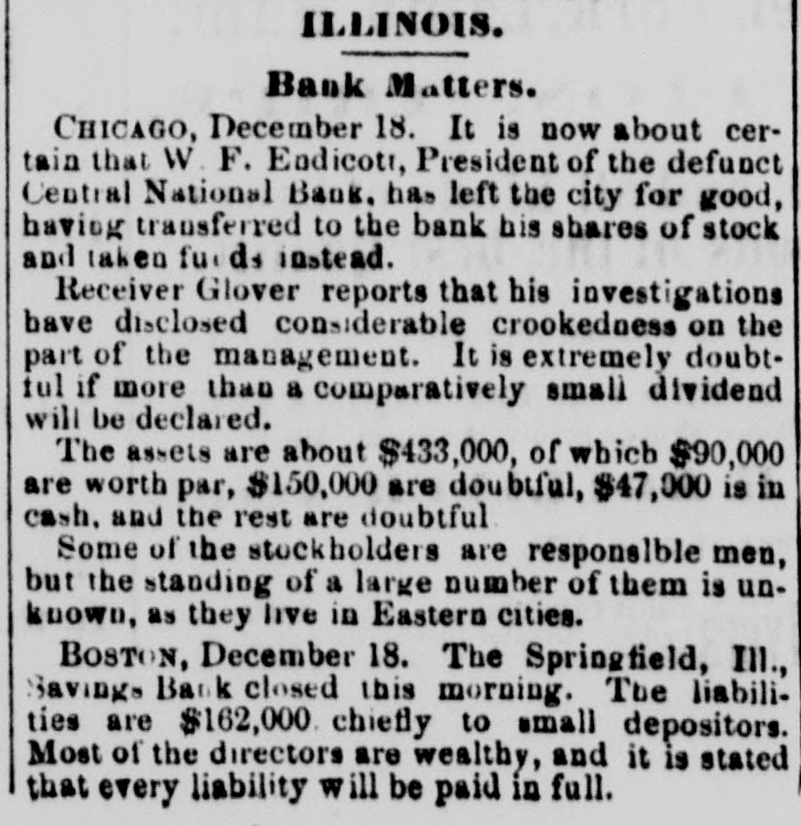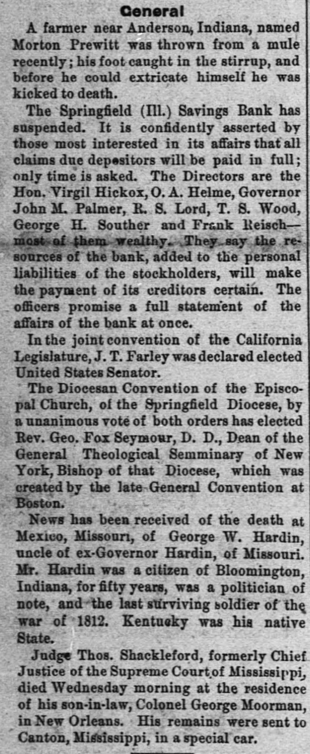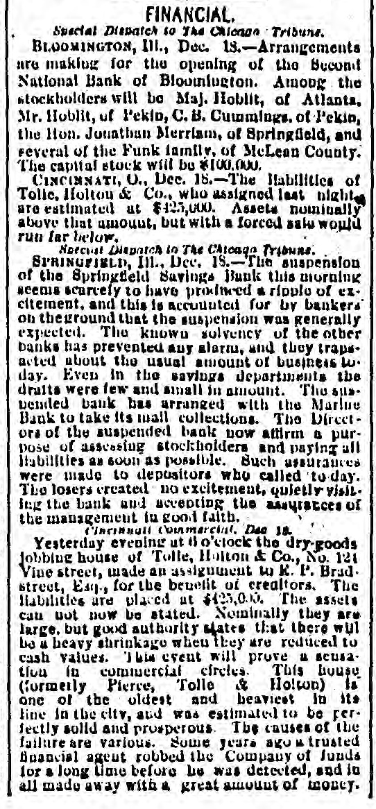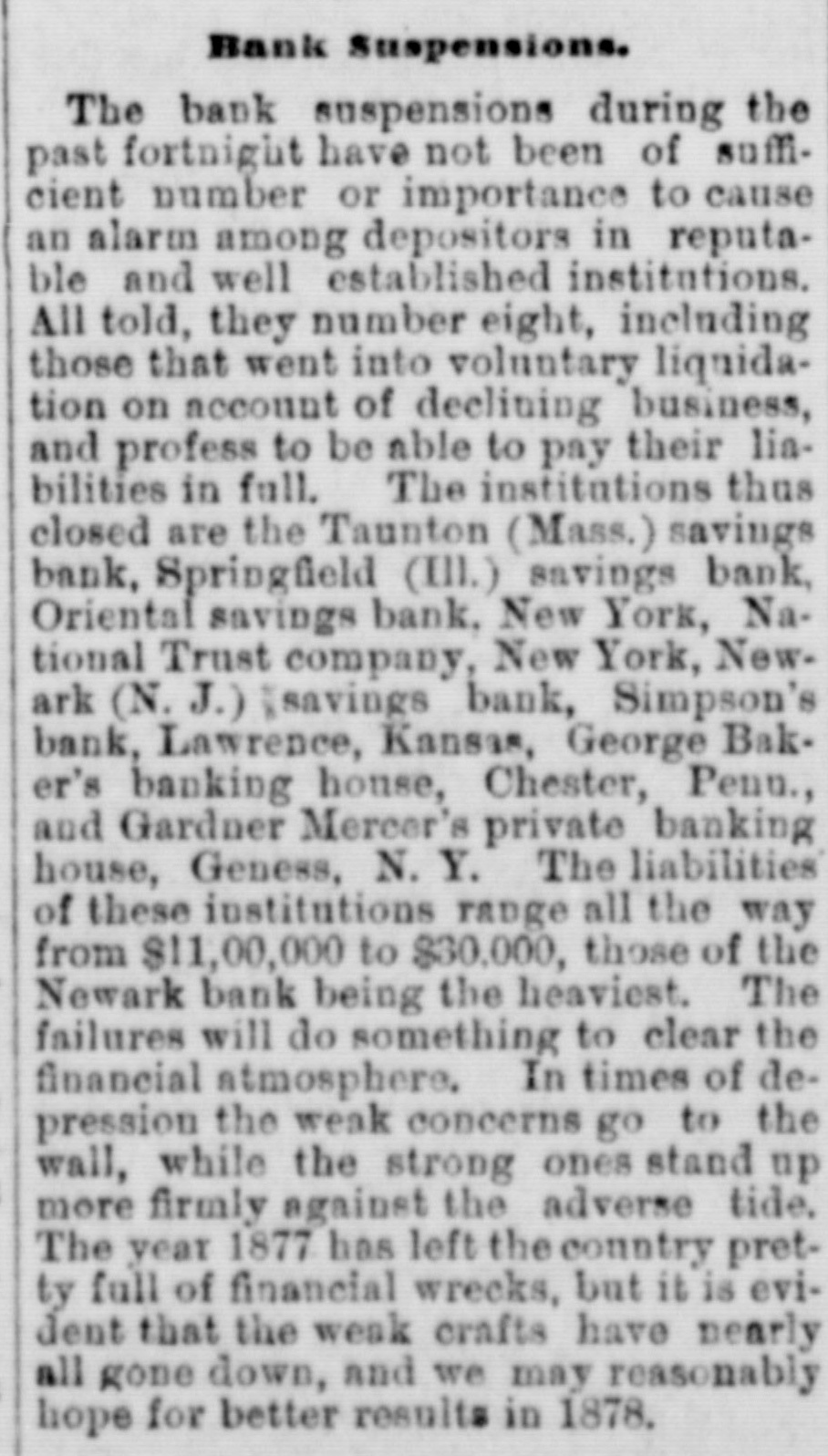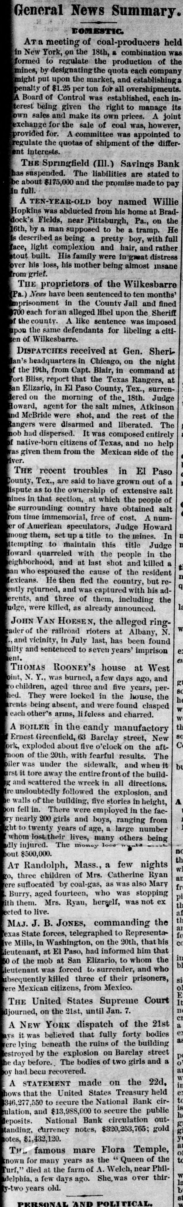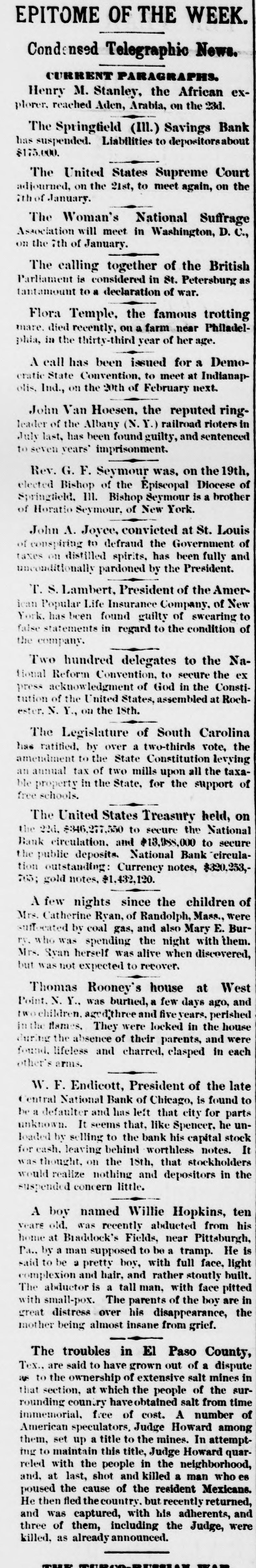 tion to advocate the express acknowledgement of God in the constitution of the United States, was held in Rochester, N. Y., about two hundred delegates being present. Resolutions in conformity with the principles of the convention were adopted. Thomas Rooney's house in West Point, N. Y., caught fire during his absence, and his two children, aged three and five years respectively, were burned to death. As John Cronin, & child two years old. was coming down the staircase of his father's house in Boston, a lad named Henry Ackers, aged about thirteen, pulled out revolver and fired at the little fellow, who lived but an hour. The story of the shooting, as given, was told by Mary Cronin, aged six, the victim's sister, who was present at the time. A fire occurred in the immense structure occupied by the American Desk Manufactory in New York-one of the largest establishments of its kind in the country-and before the flames could be subdued damage to the amount of about $100,000 had been done. Mrs. Catherine Ryan, her four children, and a girl related to Mrs. Ryan were suffocated in Boston by coal gas. Shortly after five o'clock in the afternoon a boiler in the cellar of the large wholesale candy factory of Greenfield & Sons, 63 Barclay street, New York, exploded with a loud report, and immediately thereafter flames were seen to issue from the building and the front wall toppled in. At the time of the explosion there were over 150 persons in the building, and of these about twenty-five were taken to the hospitals, suffering from burns and bruises, while a number received fatal injuries. Many of the employes, in their desperate effort to escape, leaped from the burning building, and it is believed that large number of persons were buried underneath the falling walls, one corpse having been recovered but it will take some time to remove the ruins and ascertain the exact number of victims. Before the fire was subdued Nos. 61, 63, 65, 67 and 69 Barclay street were destroyed, and many other build ings in the neighborhood were more or less damaged, involving an aggregate estimated loss of about $400,000, which is nearly all covered by insurance. When the explosion occurred the proprietor of the candy manufactory and his two sons were in the office, and several persons were in the show-room making purchases. Upon these people the disaster came without the slightest warning, and they were surrounded with fire and escaping steam in an instant and barely escaped with their lives. Many persons rushed to the fire-escape and got out in that way, while others in the upper stories escaped by means of ladders. Intense excitement prevailed in the vicinity of the disaster, and thousands of persons on their way home from work flocked to the scene. Two bodies were recovered from the ruins caused by the explosion in the New York candy factory, while the number of wounded reached over forty. Several persons were still missing on the day following the disaster, but the list of dead will not be 80 large as was at first supposed. It was also ascertained that, the explosion was not caused by the bursting of the boiler, and the real origin of the disaster is yet to be ascertained. The Un on League Club of New York gave a reception to President Hayes. About five thousand persons were present, among them being Mrs. Hayes, Peter Cooper, AttorneyGeneral Devens, Secretary of State Evarts and others. The large shoe factory of P & N. Copeland & Co., at South Braintree, Mass., was destroyed by fire, causing loss of about$ 50,000, on which there is about $38,000 insurance. John Van Dyke. a youth of nineteen, was hung at Canton, N. Y., for murdering his wife last July, after having been married to her a week. President Hayes and wife assisted at the opening of the American Museum of Natural History in New York. Speeches were made by President Eliot, of Harvard College, Professor O. C. Marsh and others, and the museum was formally opened by President Hayes. In the evening the President attended the seventysecond annual dinner of the New England Society and responded to the toast, The President of the United States. Owen Murphy, president of the New York board of excise, twice member of the assembly, absconded with nearly $50,000 belonging to the excise board. He had been expected at a meeting of the board, and when he failed to put in an appearance his colleagues made an investigation, which resulted in discovering that he had drawn from the bank large sum of public money under his care, besides large amount of his own funds, and then fled. Three Wall street (New York) brokers were arrested as members of a gang of counterfeiters engaged in extensive forging of railroad and other bonds, a large amount of which had been put upon the market. Western and Southern States. The boiler of the steamer Jesse Taylor, lying at New Orleans, exploded, killing one man and wounding two others. The Texas State troops besieged at San Elizario by a Mexican mob, surrendered, and three Howard, Atkensin and McBridewere immediately shot by their captors. The American dairy exhibition opened at Chicago with a display of butter and cheese, all the dairy States and Canada being represented. The Springfield Savings Bank of Springfield, III., has failed. The oyster pungy Samuel Washington capsized at the mouth of the Rappahannock river. Captain Cephas Bussels and the crew of four were drowned. Two more heavy failures have occurred in Chicago-that of Kelley, Morley & Co., coal dealers, whose liabilities will reach $300,000, and that of H. W. Wetherell, wholesale millinery and fancy goods merchant. whose liabilities were also large. Other failures in the West recently are recorded in Henry, III., where L. B. McFadden & Co., heavy operators in coal mines, went under, owing $370,000, and in San Francisco, where the Cosmopolitan Savings and Exchange Bank suspended, owing depositors $50,000. By the explosion of a dynamite cartridge in a tunnel of the Gunpowder Water 