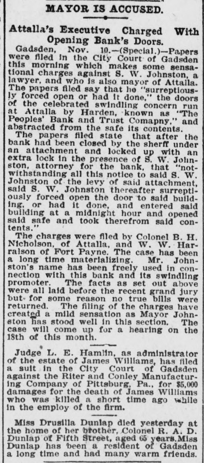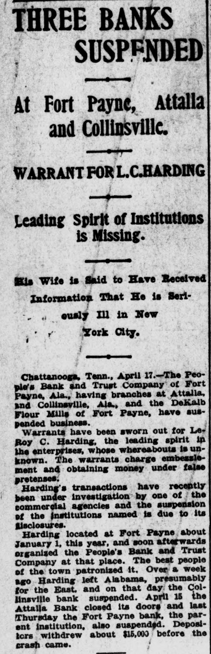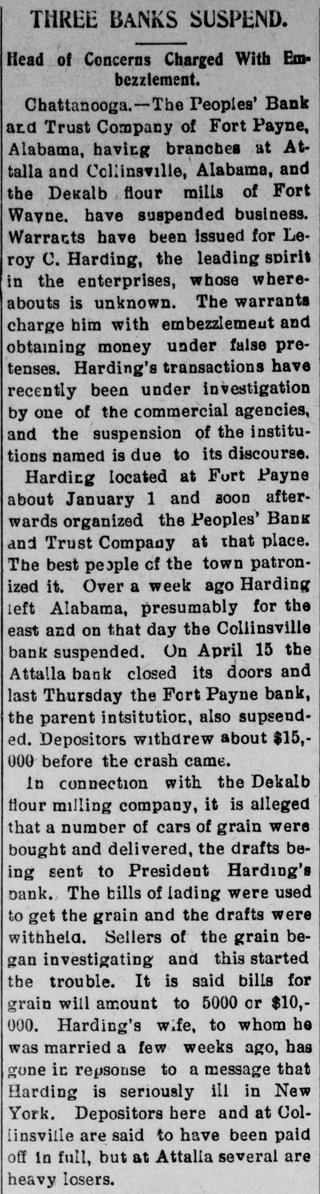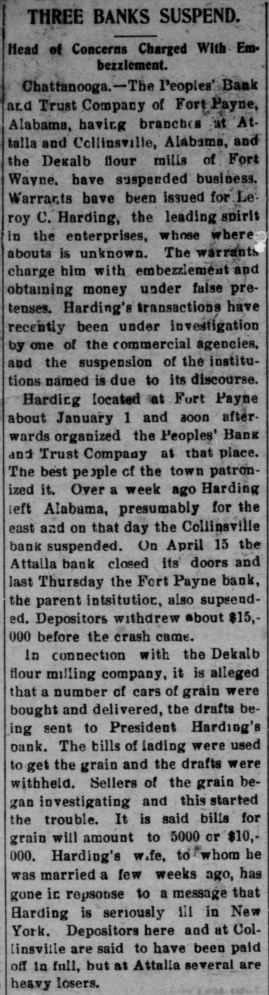 THREE BANKS SUSPENDED At Fort Payne, Attalla and Collinsville. WARRANT FOR L.C.HARDING Leading Spirit of Institutions is Missing. / His Wife is Said to Have Received Information That He is Seriously Ill in New York City. Chattanooga, Tenn., April 17.-The Peoand ple's Payne, Bank Ala., having Trust branches Company at Attalla, of Fort and Collinsville, Ala., and the DeKalb Flour Mills of Fort Payne, have suspended business. Warrants have been sworn out for Le. Roy C. Harding, the leading spirit in the enterprises, whose whereabouts is unknown. The warrants charge embezzlement and obtaining money under false pretenses. Harding's transactions have recently been under investigation by one of the commercial agencies and the suspension of the Institutions named is due to its disclosures. Harding located at Fort Payne about January 1, this year, and soon afterwards organized the People's Bank and Trust Company at that place. The best people of the town patronized it. Over a week ago Harding left Alabama, presumably for the East. and on that day the Collineville bank suspended. April 15 the Attalia Bank closed its doors and last Thursday the Fort Payne bank, the parent institution, also suspended. Depositors withdrew about $15,000 before the crash came.