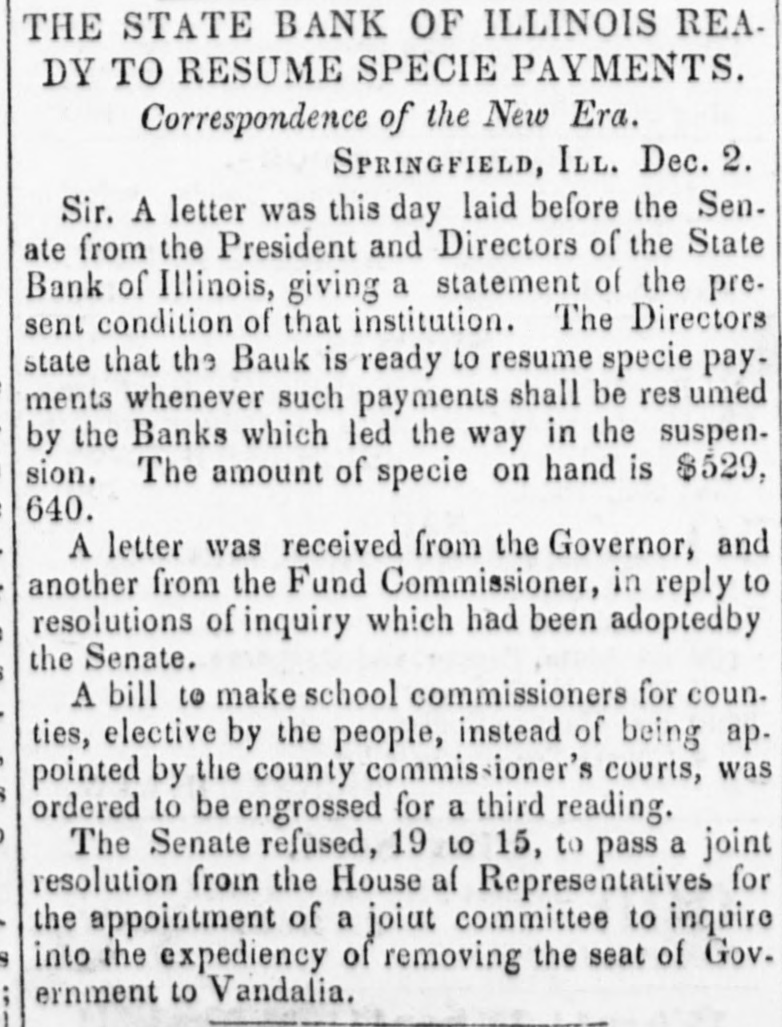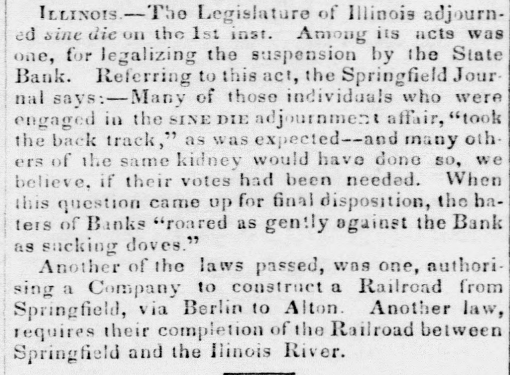 The latest dates from Springfield contain but little interest, save the above. On the 15th inst. the Chair laid before the Senate a communication from the canal commissioners, in answer to a resolution of the Senate, relative to the probable cost of the Illinois and Michigan canal from the Illinois river to the Dupage feeder (giving the estimated cost at 1,400,000.)