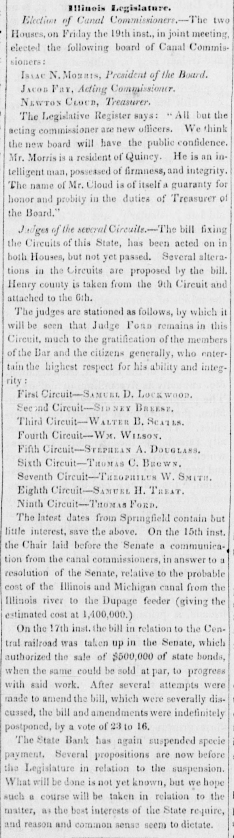 The Legislative Register says: "All but the acting commissioner are new officers. We think the new board will have the public confidence. Mr. Morris is a resident of Quincy. He is an intelligent man, possessed of firmness, and integrity. The name of Mr. Cloud is of itself a guaranty for honor and probity in the duties of Treasurer of the Board."