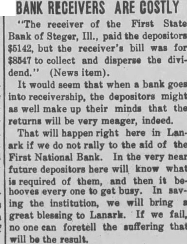 BANK RECEIVERS ARE COSTLY "The receiver of the First State Bank of Steger, III., paid the depositors $5142, but the receiver's bill was for $8547 to collect and disperse the dividend. (News item). It would seem that when bank goes into receivership, the depositors might as well make up their minds that the returns will be very meager, indeed. That will happen right here in Lanark if we do not rally to the aid of the First National Bank. In the very near future depositors here will know what is required of them, and then it behooves every one to get busy. In saving the institution, we will bring a great blessing to Lanark. If we fail, no one can foretell the suffering that will be the result.