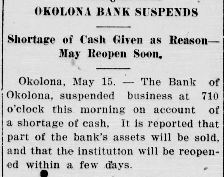 OKOLONA BANK SUSPENDS Shortage of Cash Given as ReasonMay Reopen Soon. Okolona, May 15. The Bank of Okolona, suspended business at 710 o'clock this morning on account of a shortage of cash, It is reported that part of the bank's assets will be sold, and that the institution will be reopened within a few days.